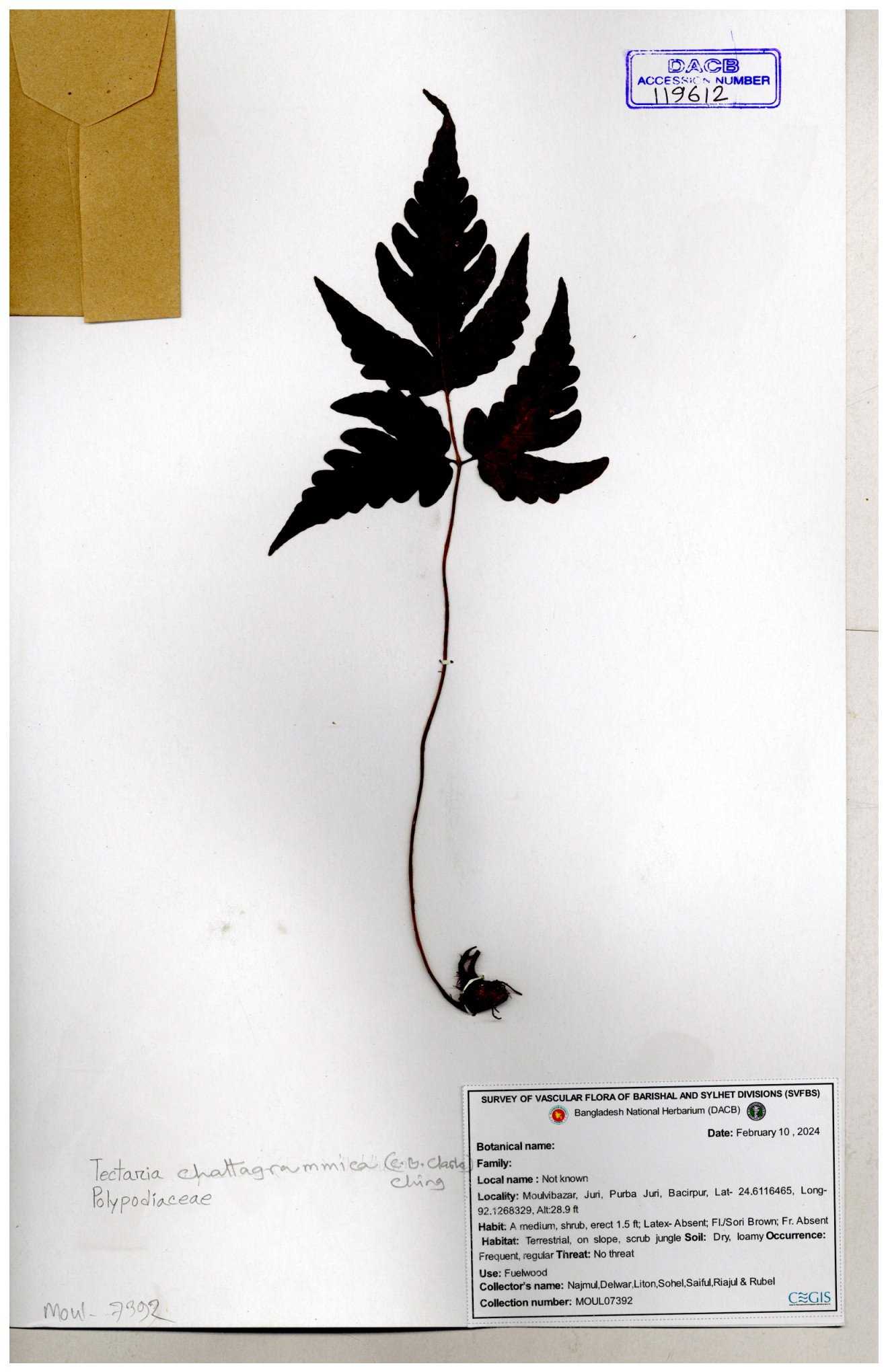 | 119612 | Polypodiaceae | Tectaria chattagrammica | 30-11--0001 |