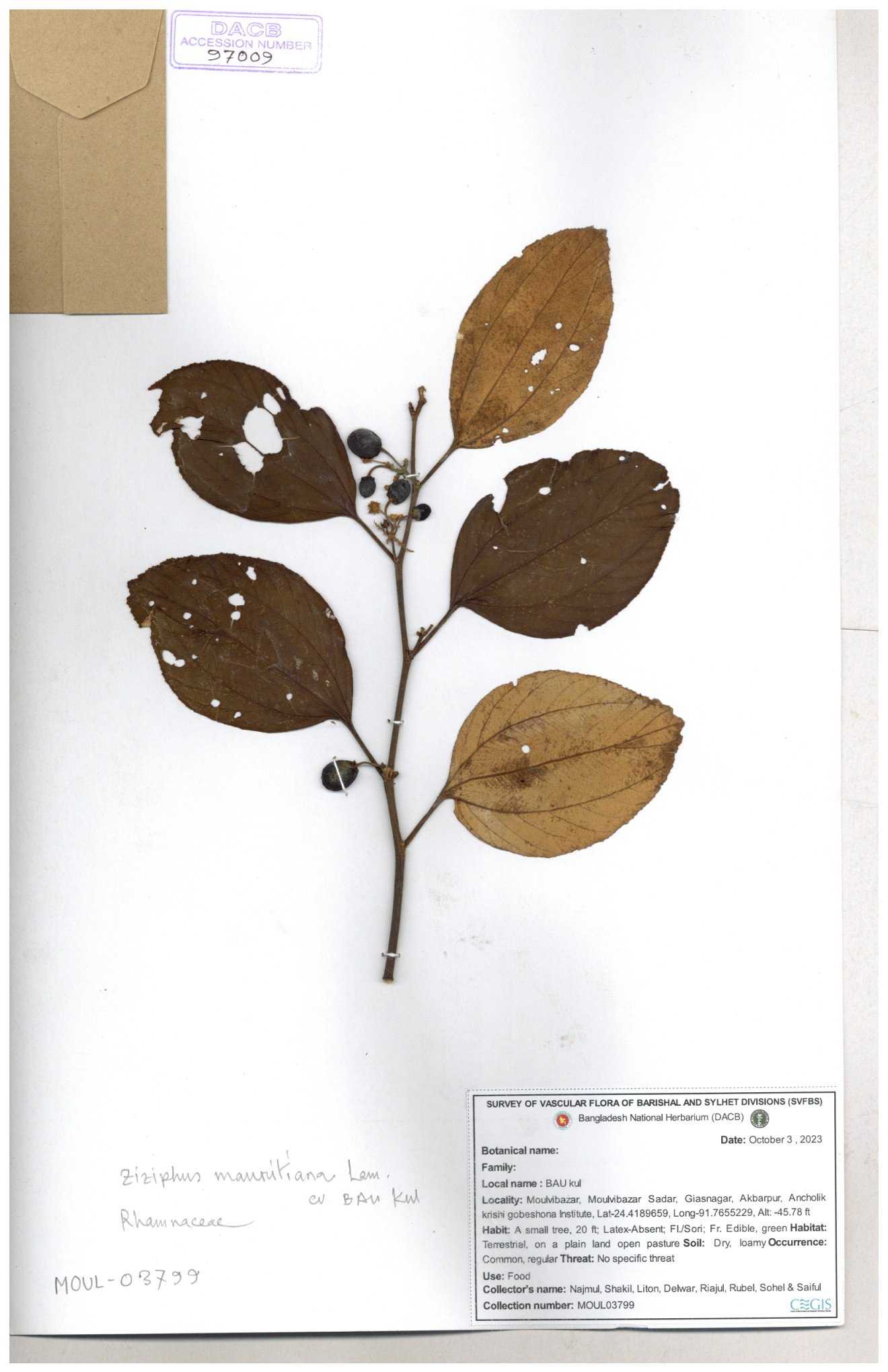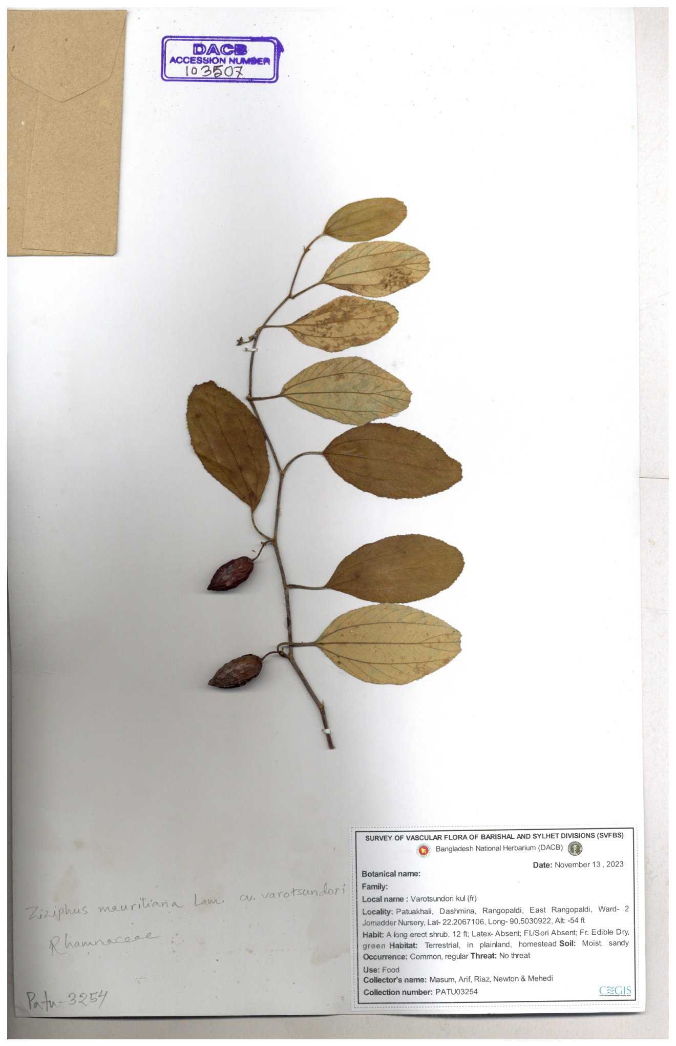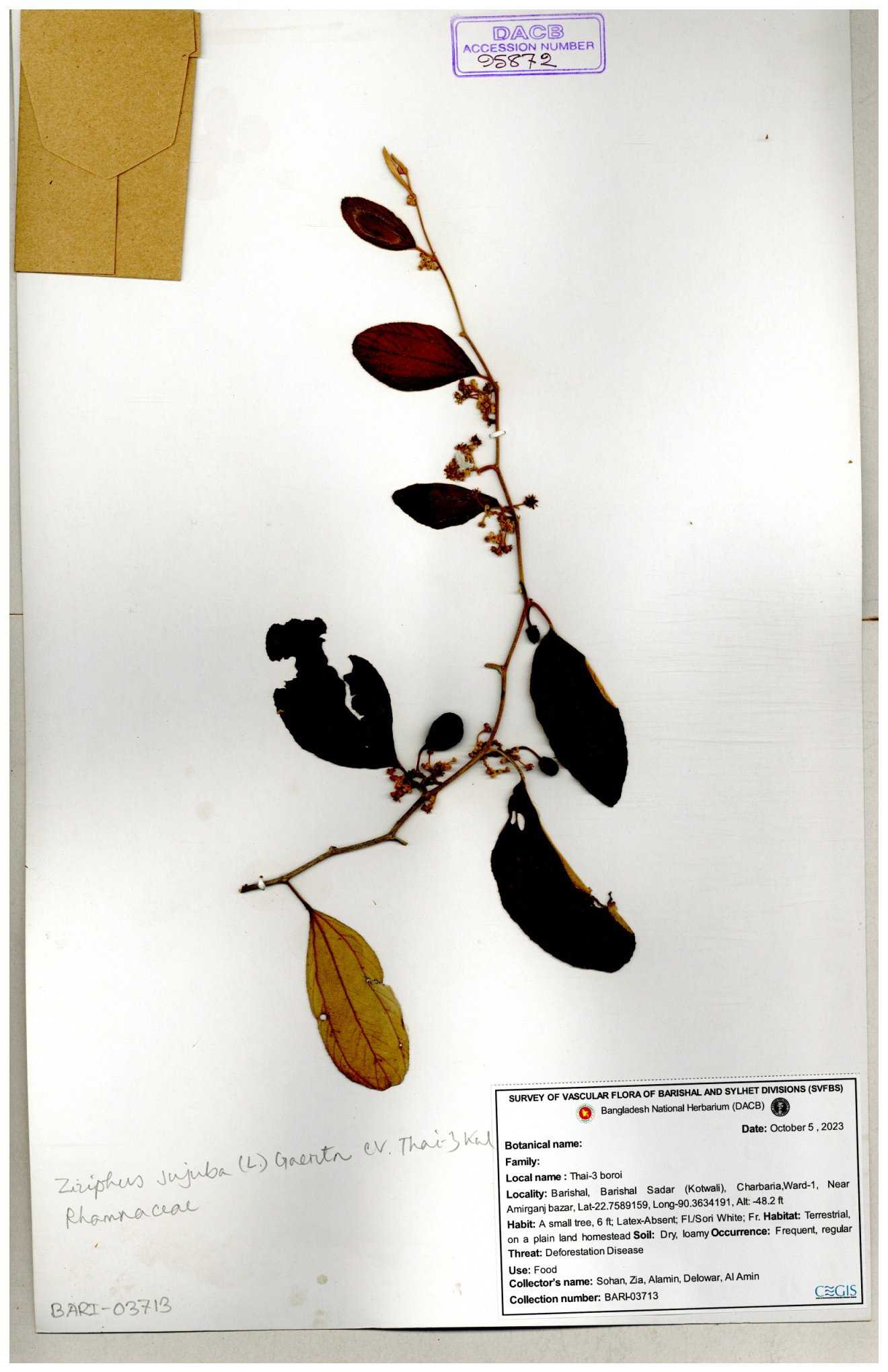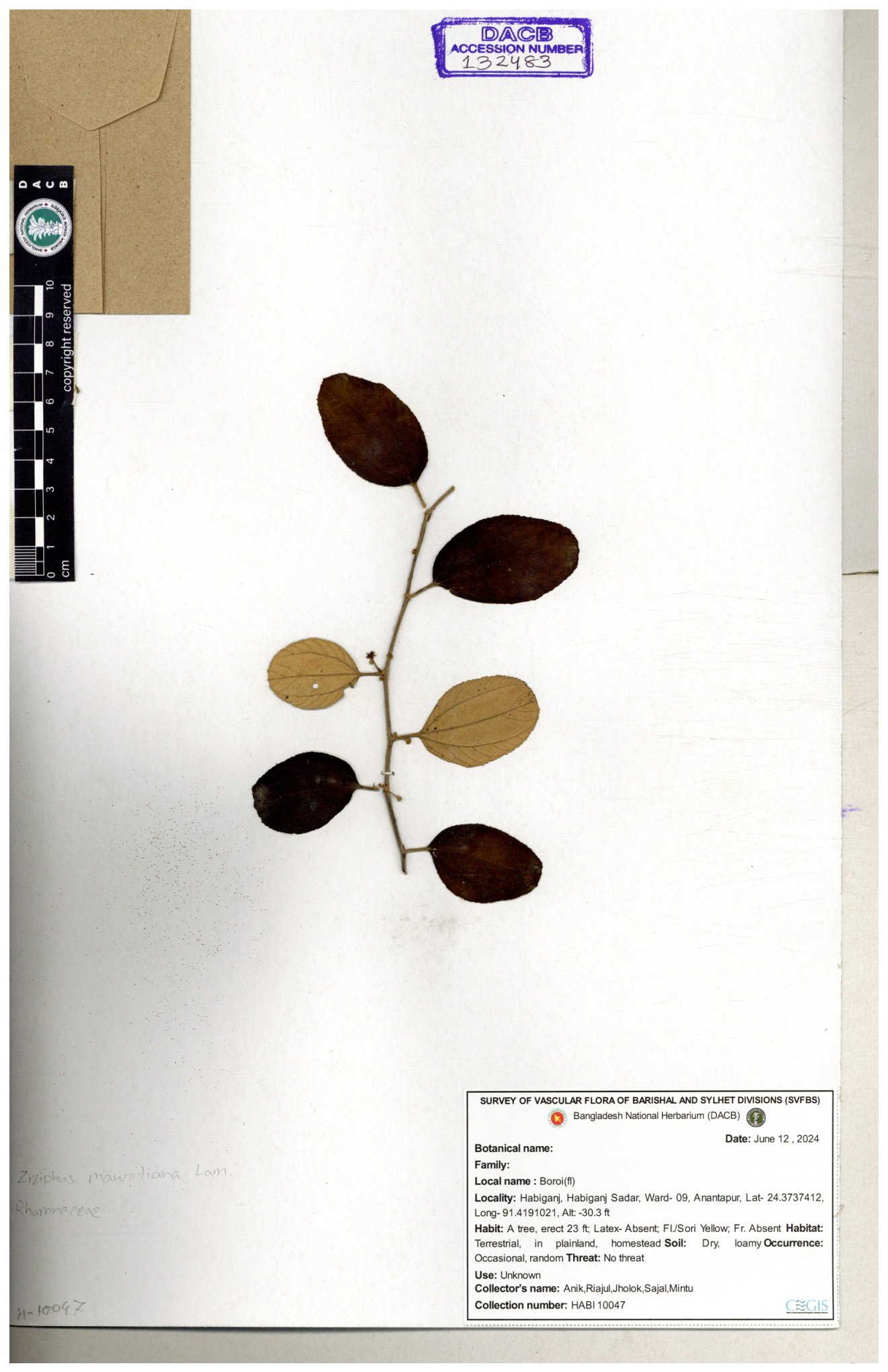 | 47850 | Rhamnaceae | Ziziphus jujuba | Boroi | Naimur Rahman | NR-1334 15-01-2019 |