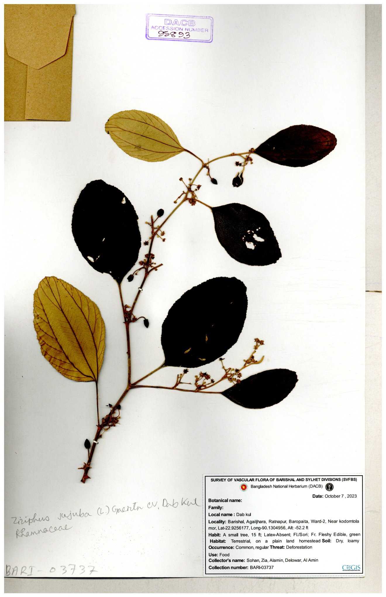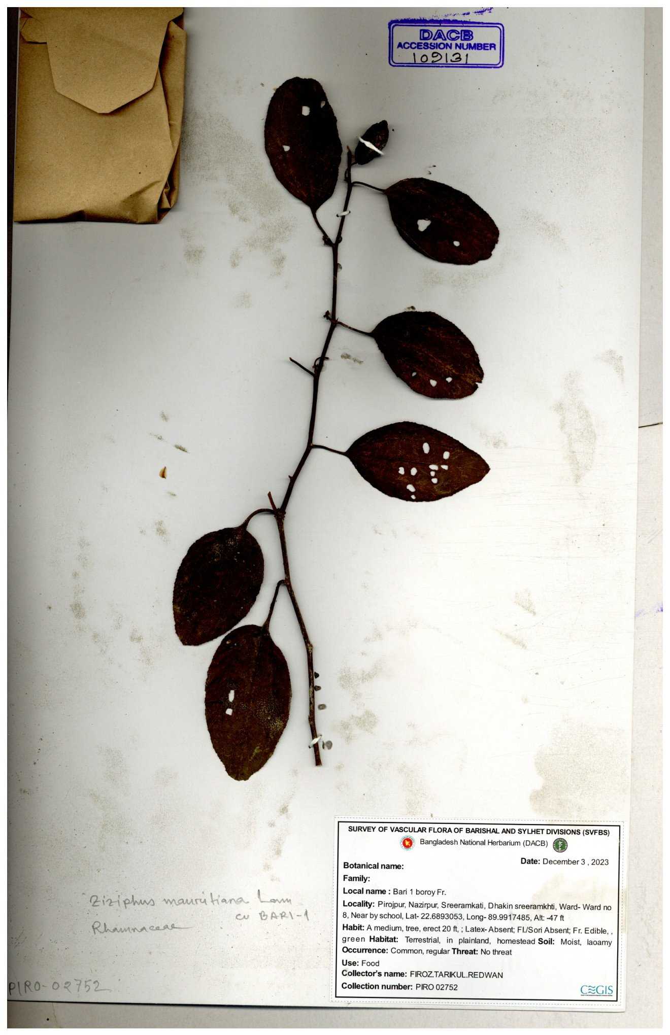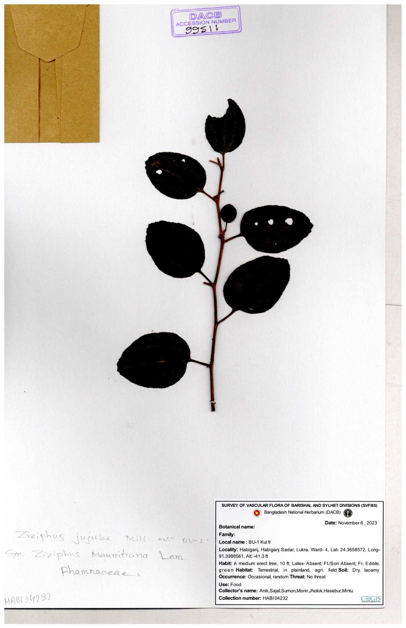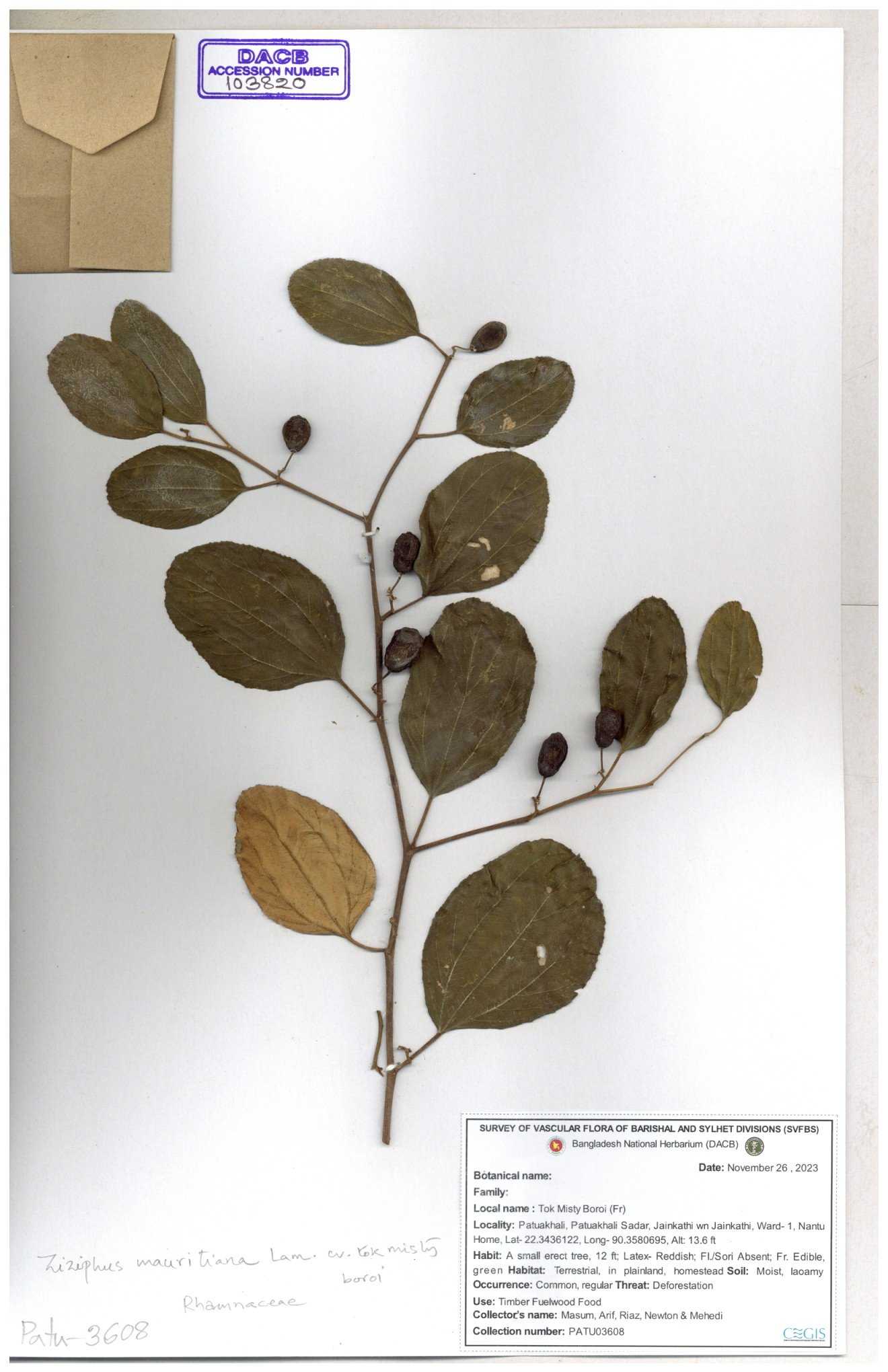 | 47850 | Rhamnaceae | Ziziphus jujuba | Boroi | Naimur Rahman | NR-1334 15-01-2019 |