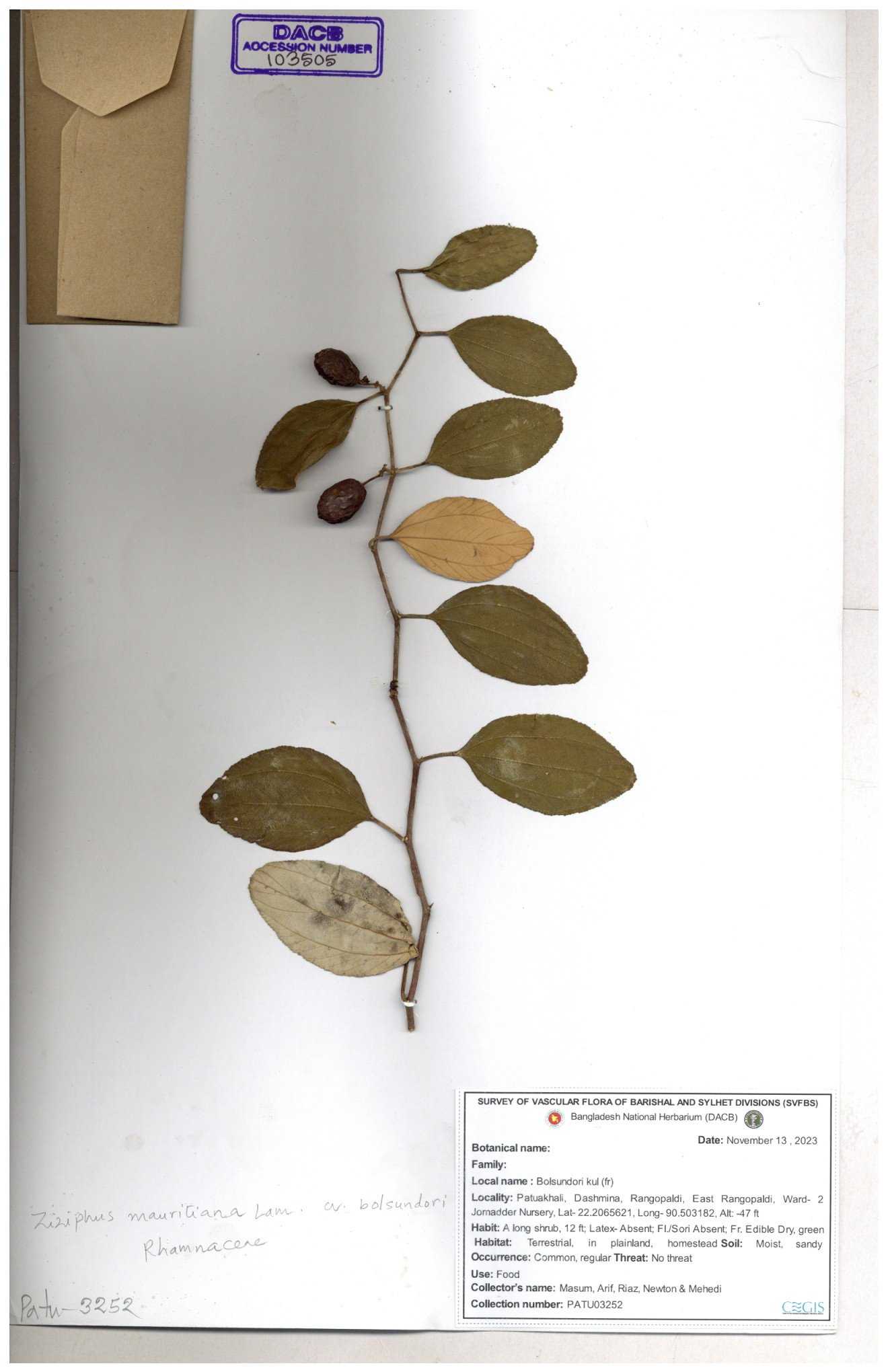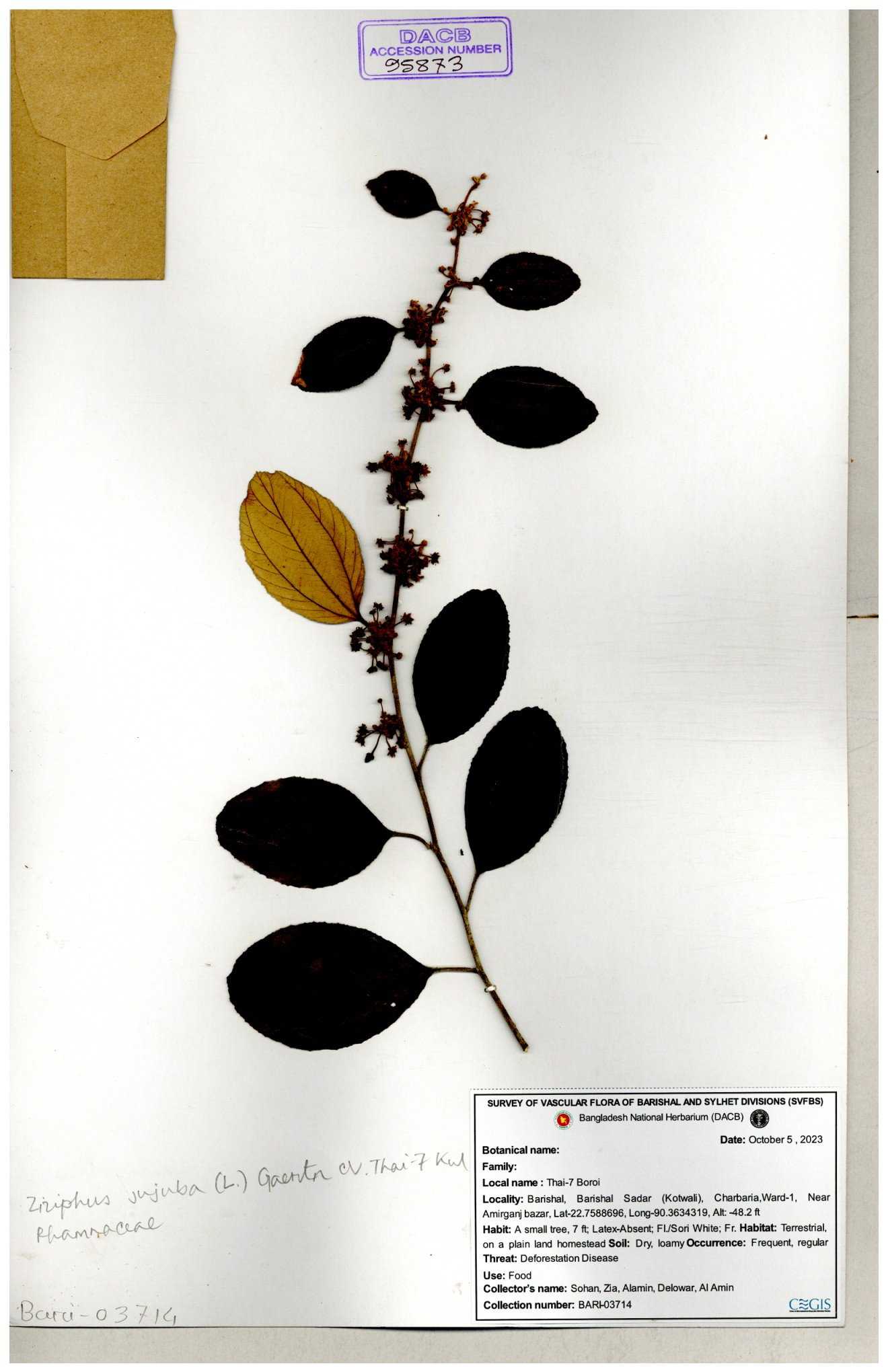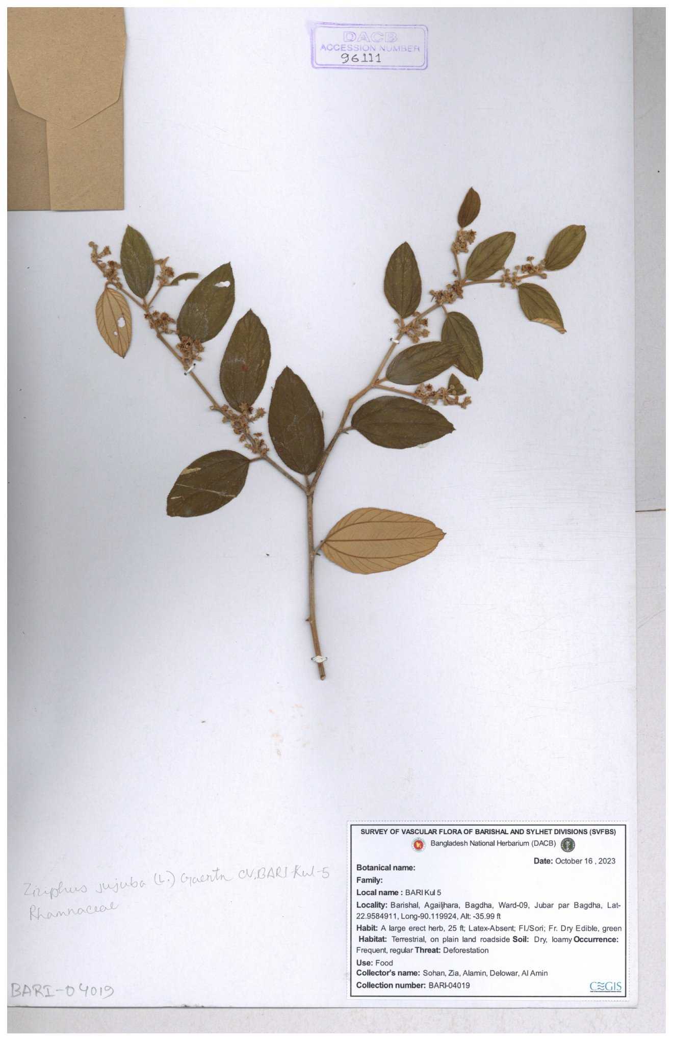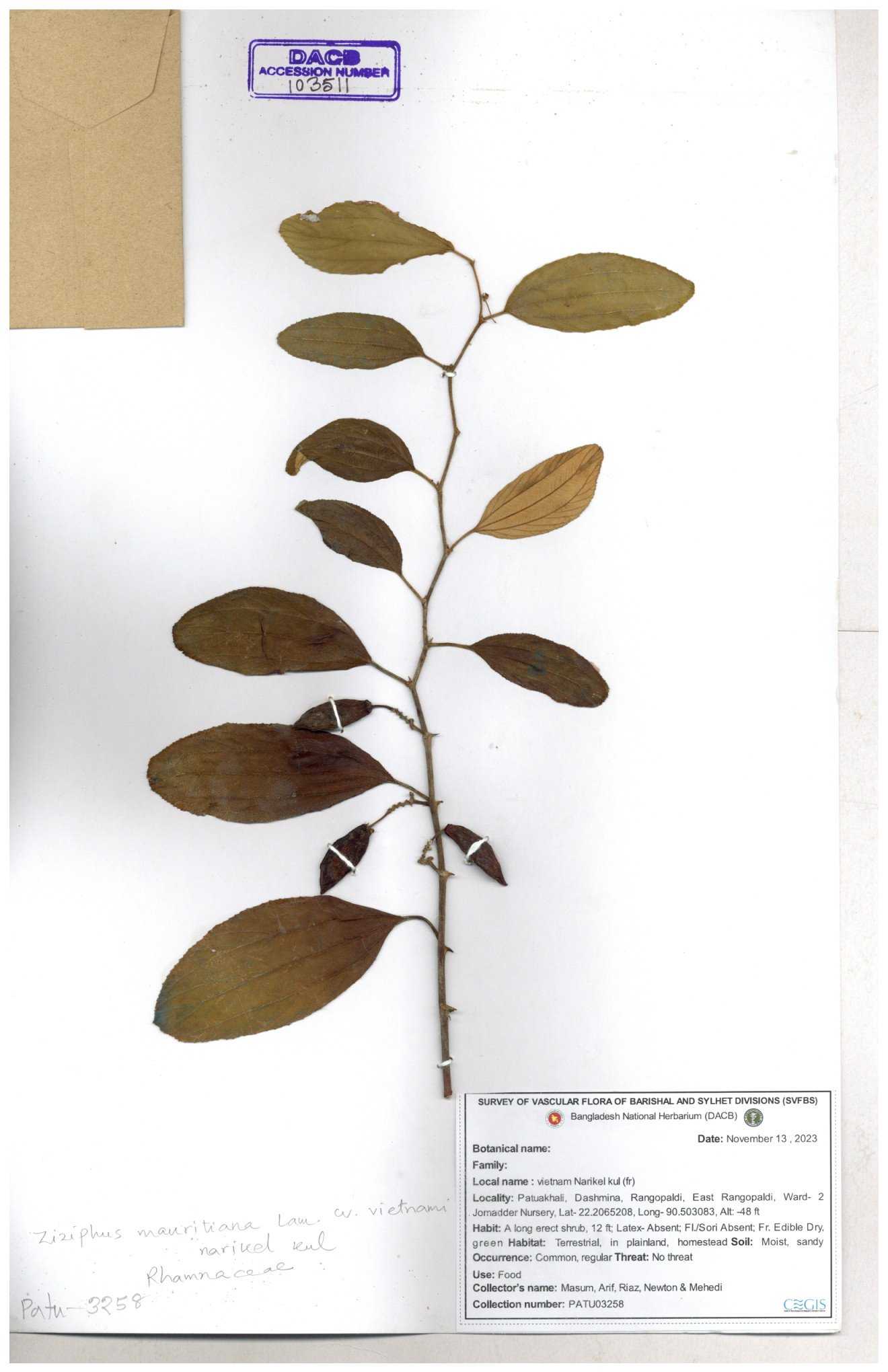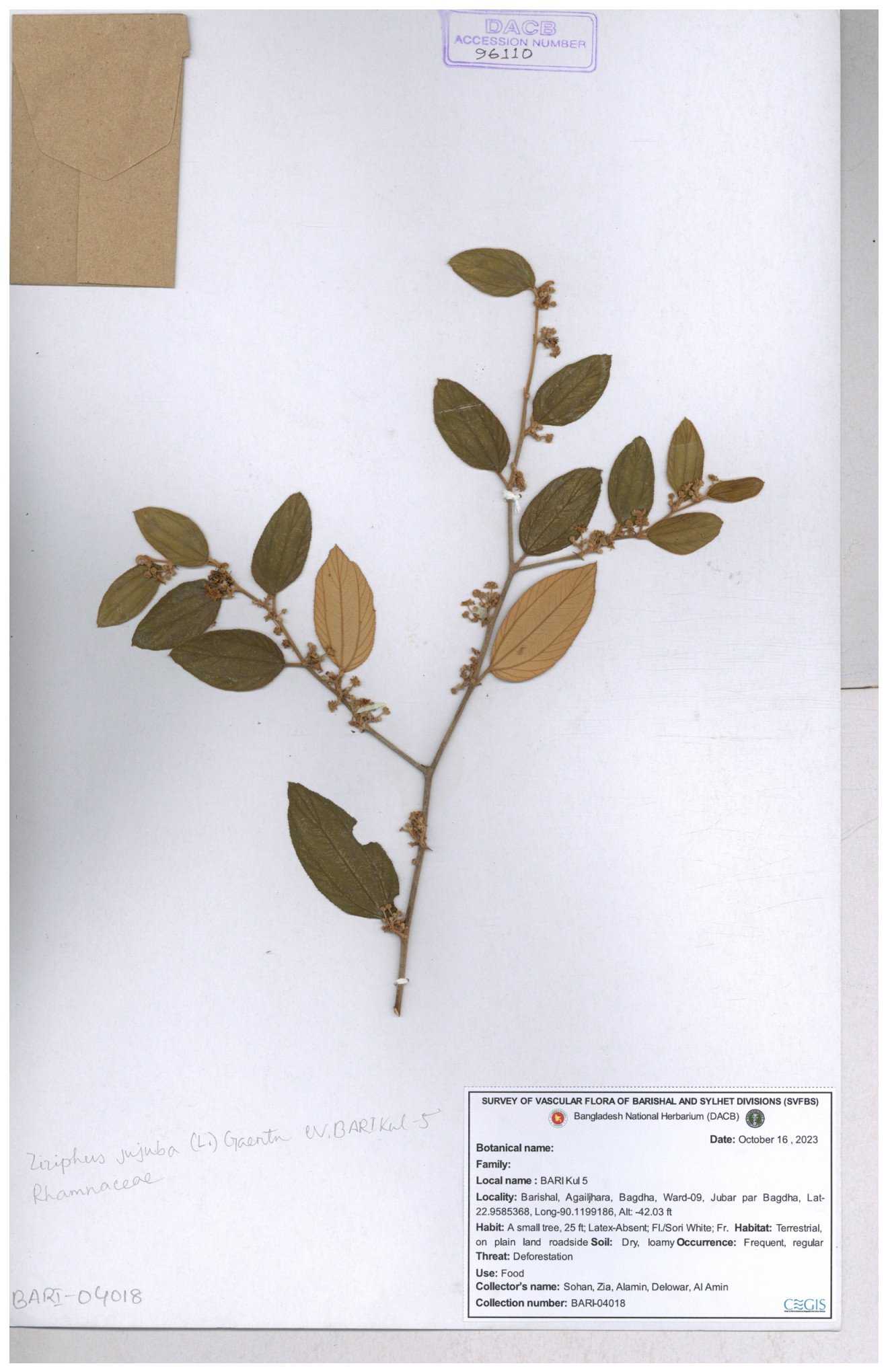 | 47850 | Rhamnaceae | Ziziphus jujuba | Boroi | Naimur Rahman | NR-1334 15-01-2019 |