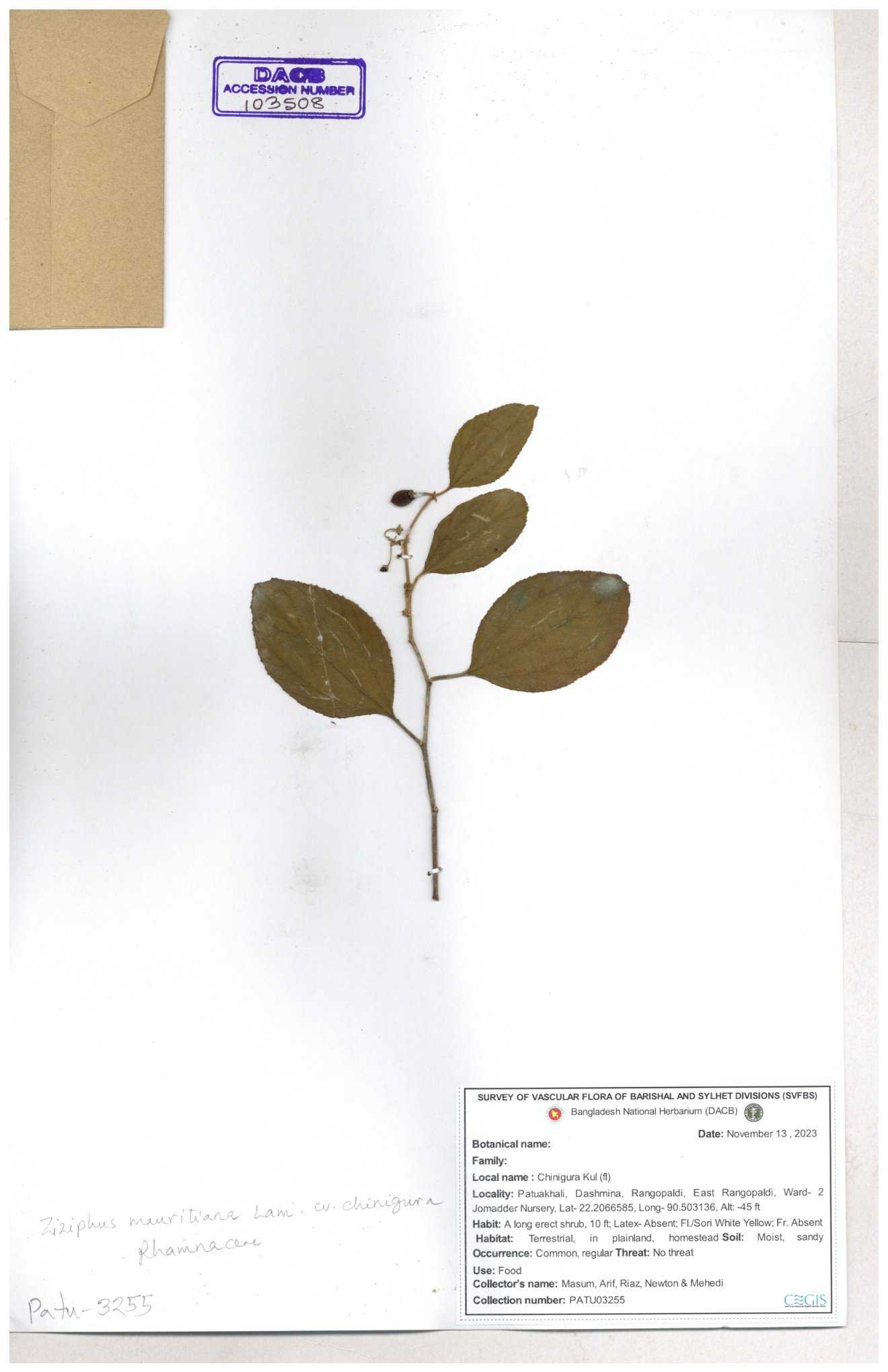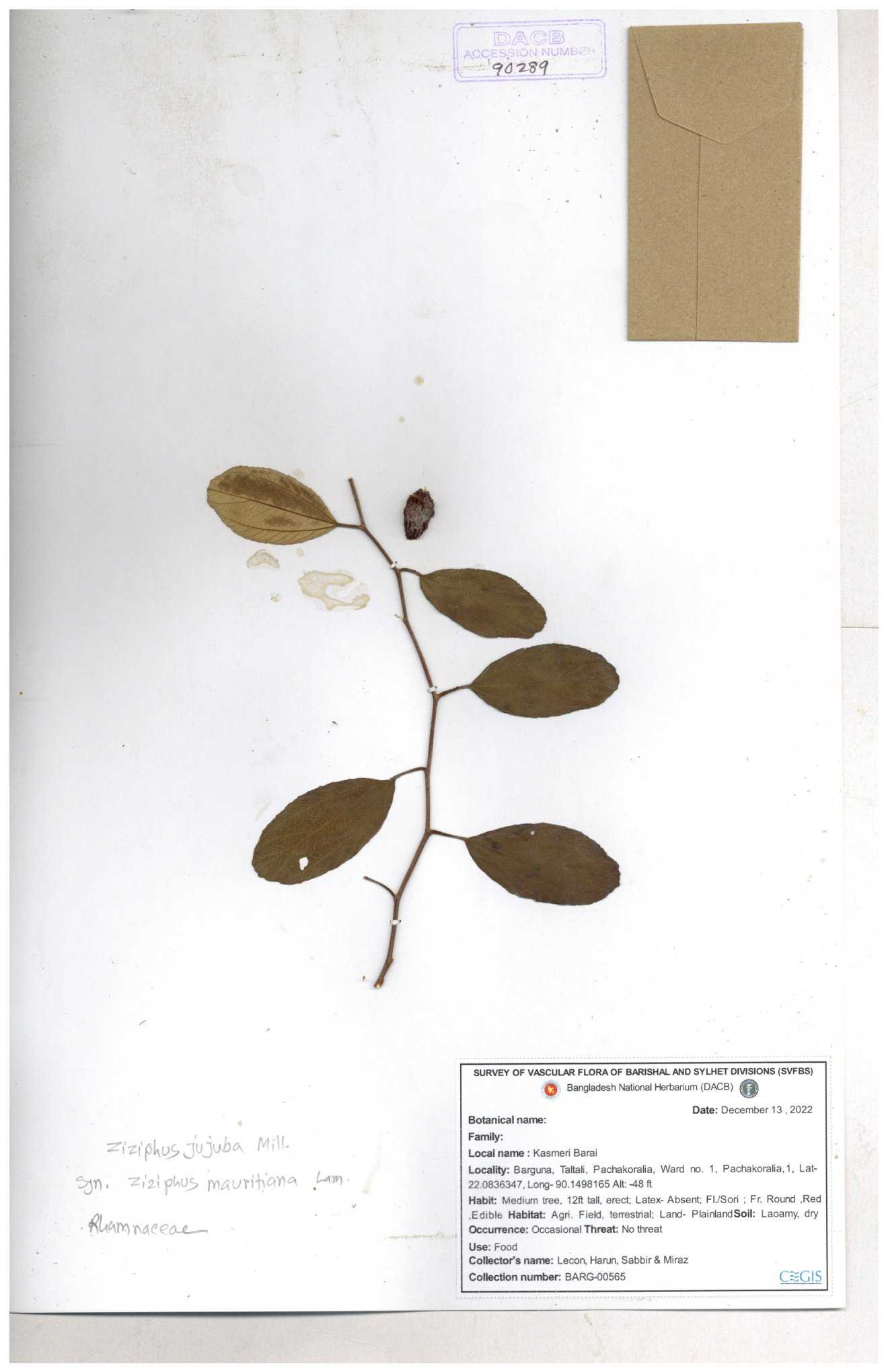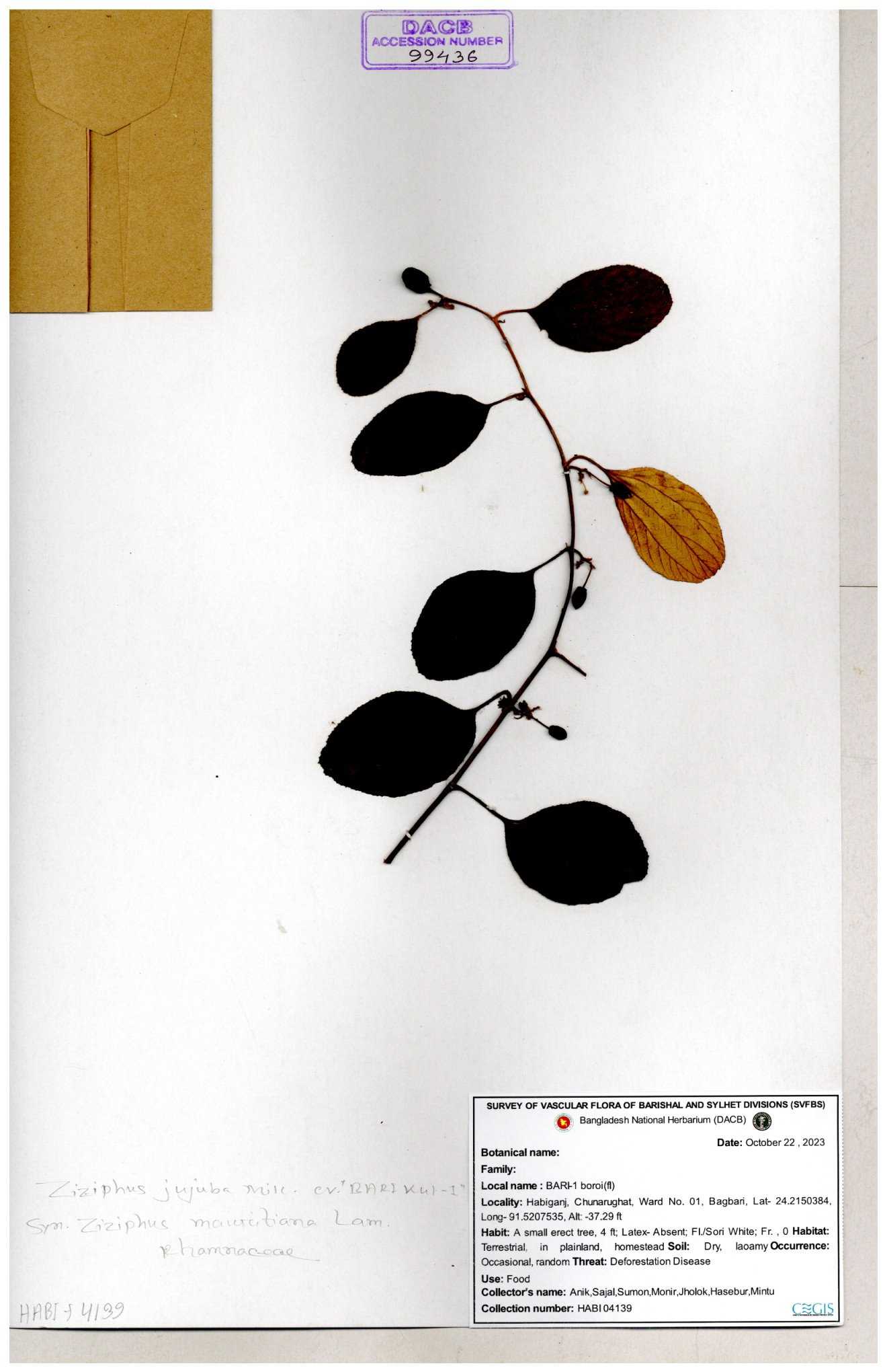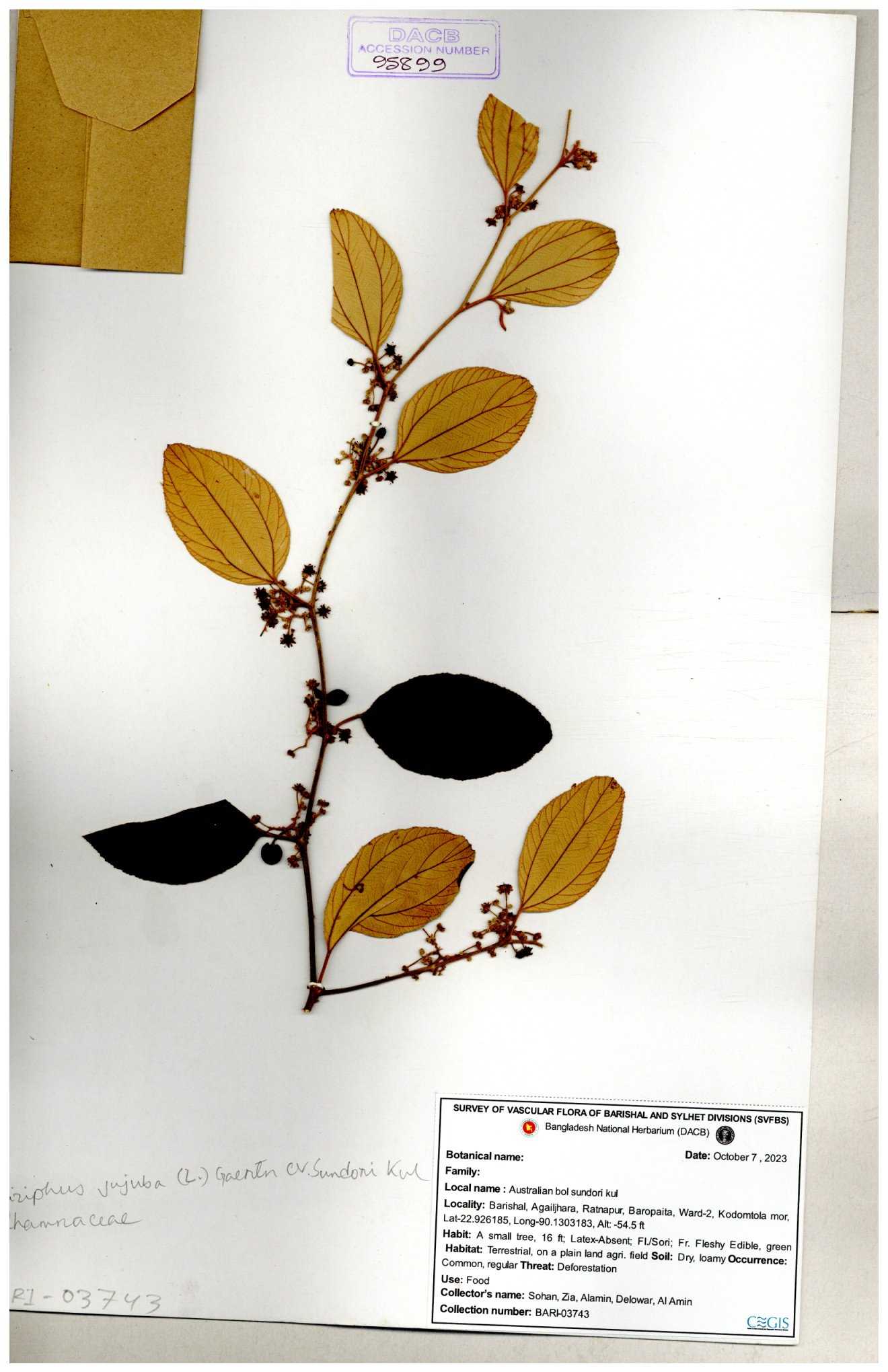 | 47850 | Rhamnaceae | Ziziphus jujuba | Boroi | Naimur Rahman | NR-1334 15-01-2019 |