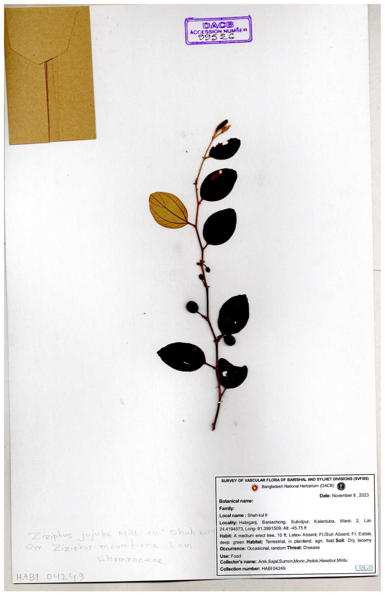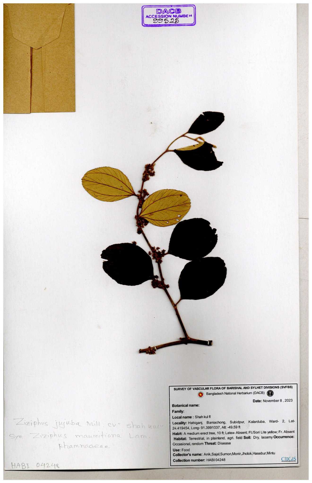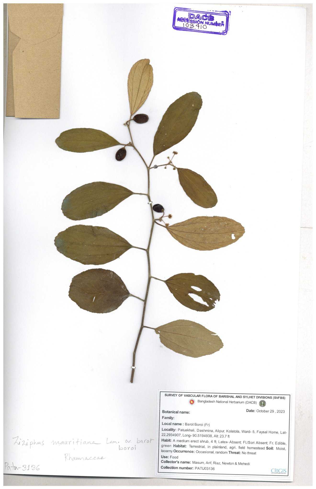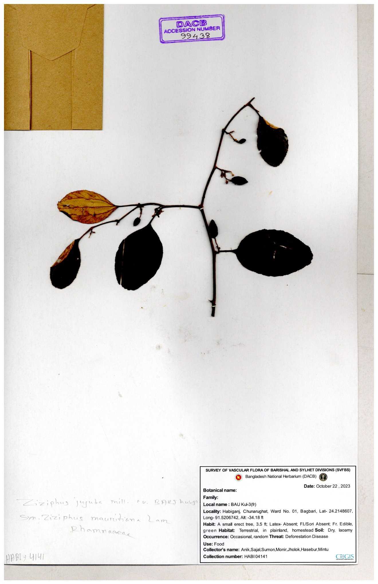 | 47850 | Rhamnaceae | Ziziphus jujuba | Boroi | Naimur Rahman | NR-1334 15-01-2019 |