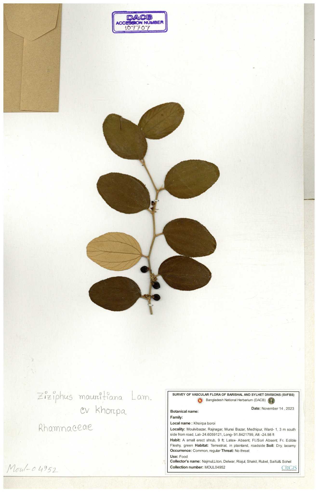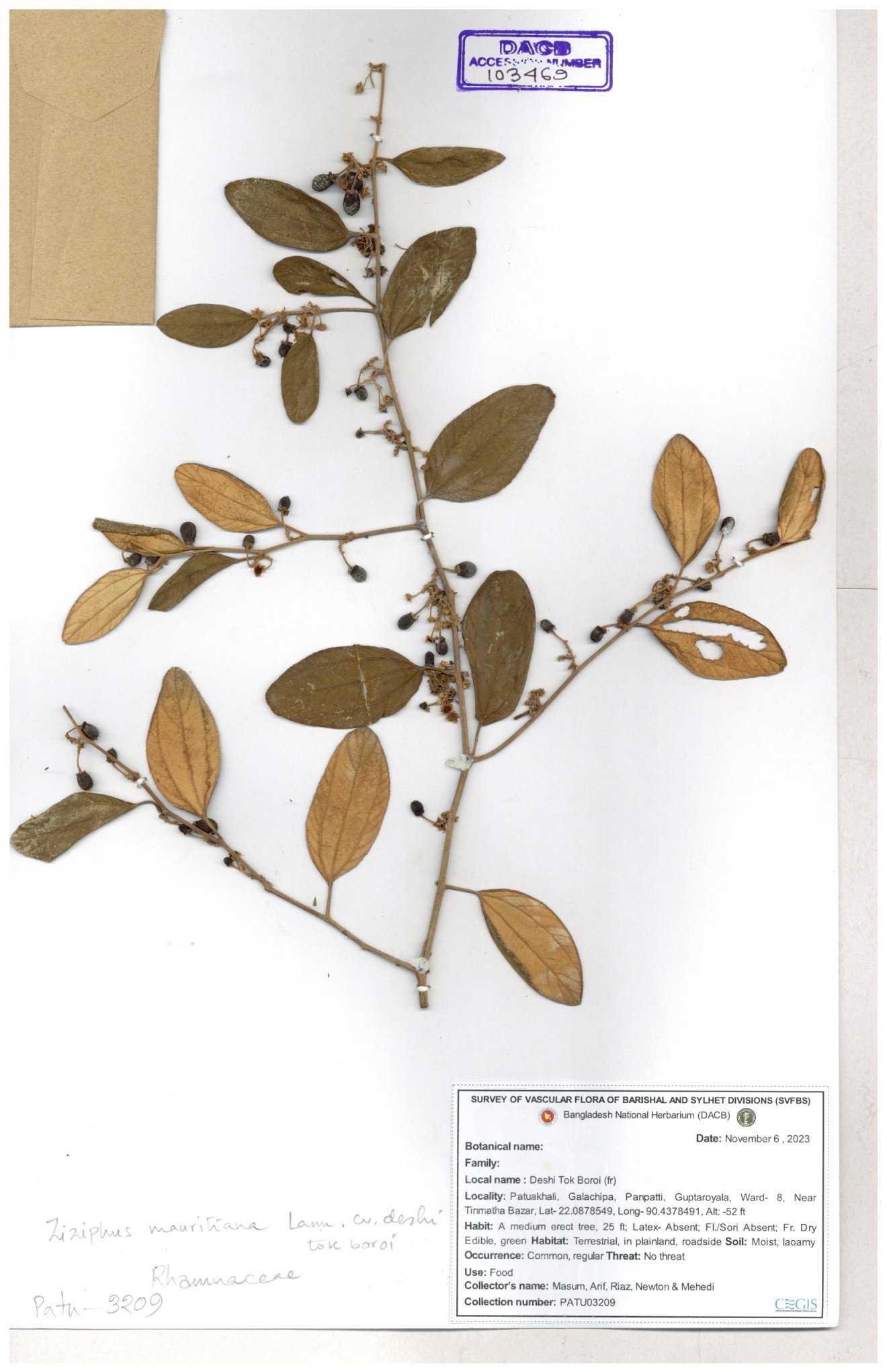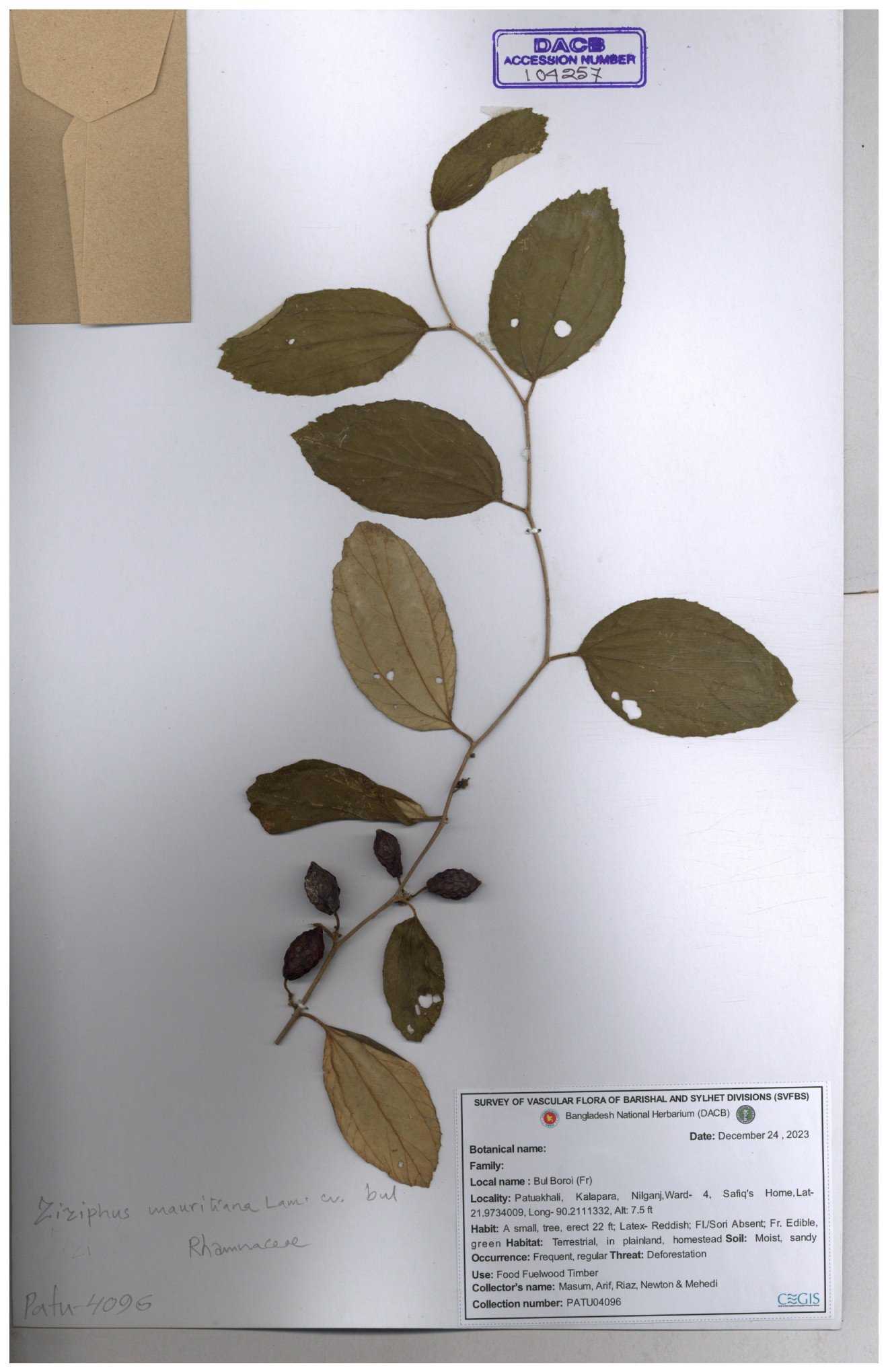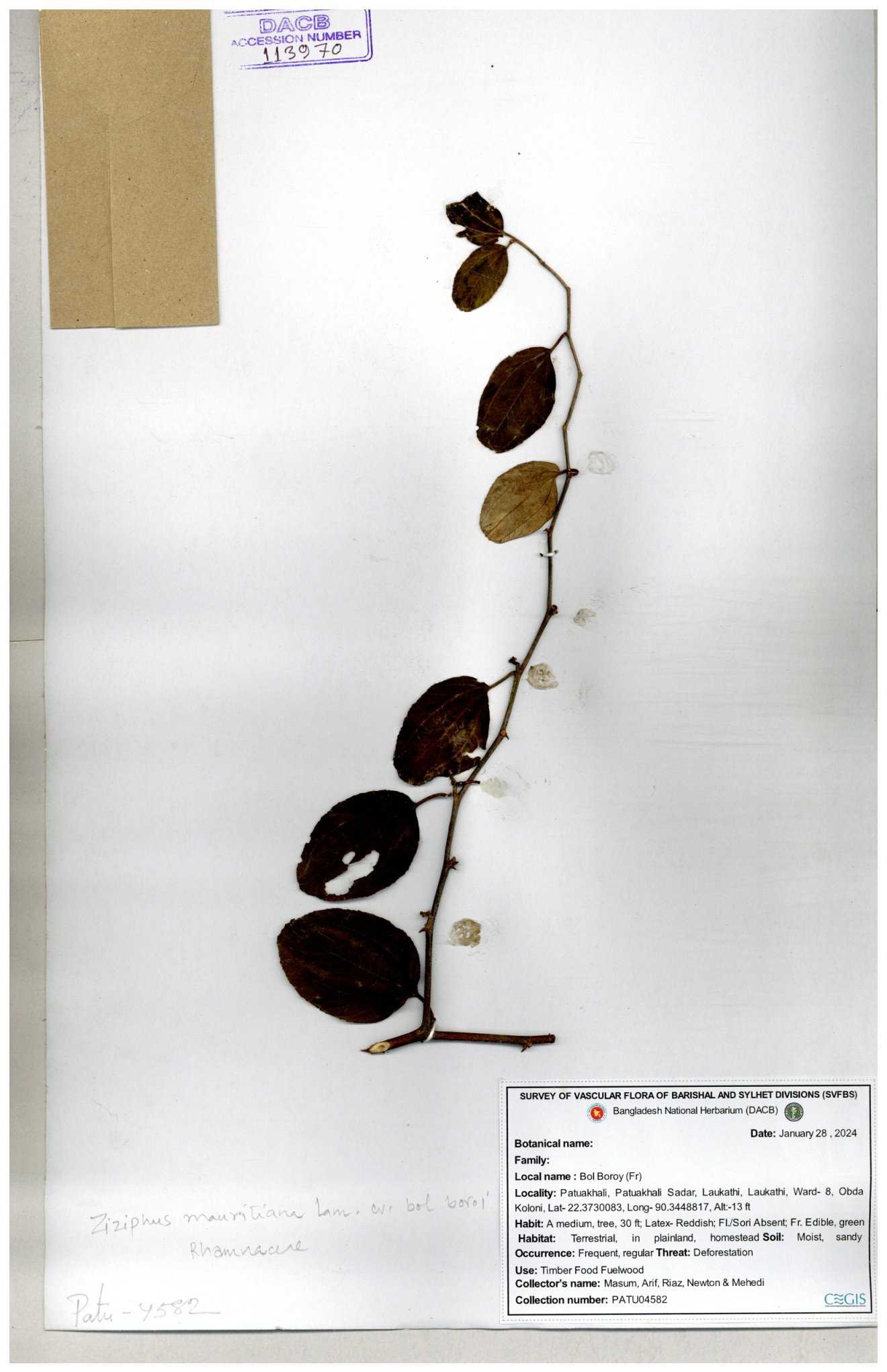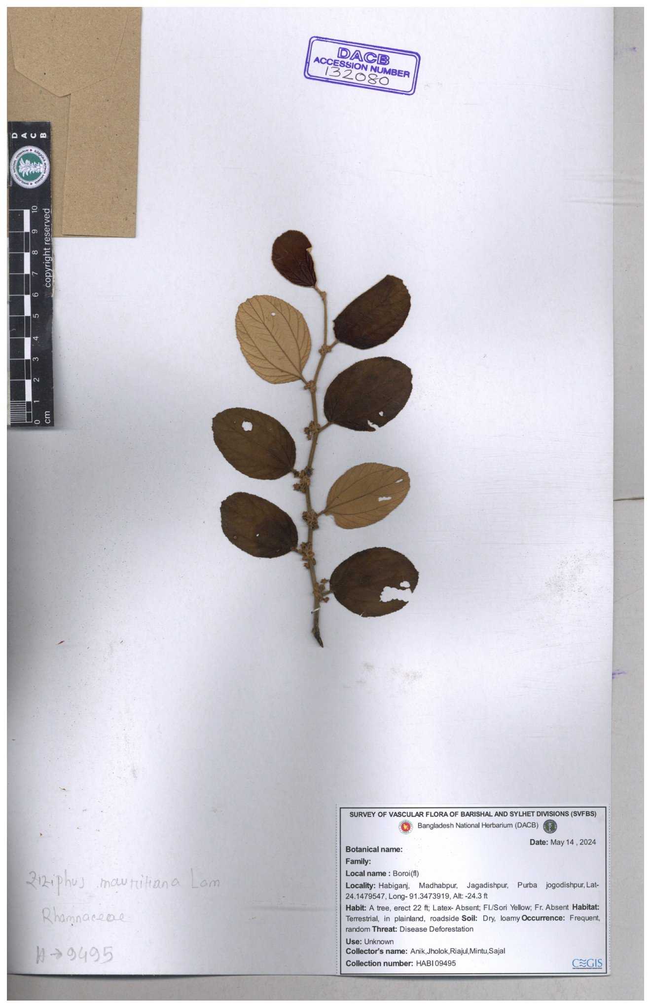 | 69858 | Rhamnaceae | Ziziphus Rugosus Lam. | Bonboroi | I Hossen, Ms. Islam & MR Miah | IH-4240 30-11--0001 |