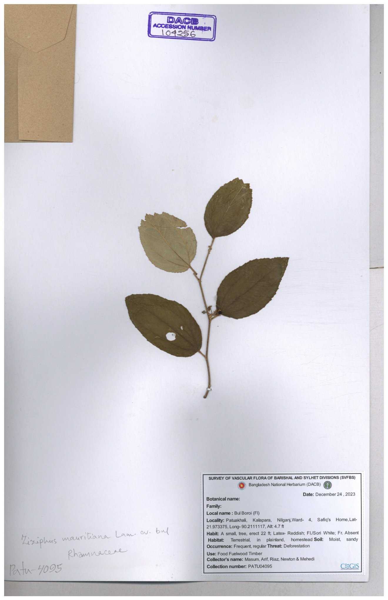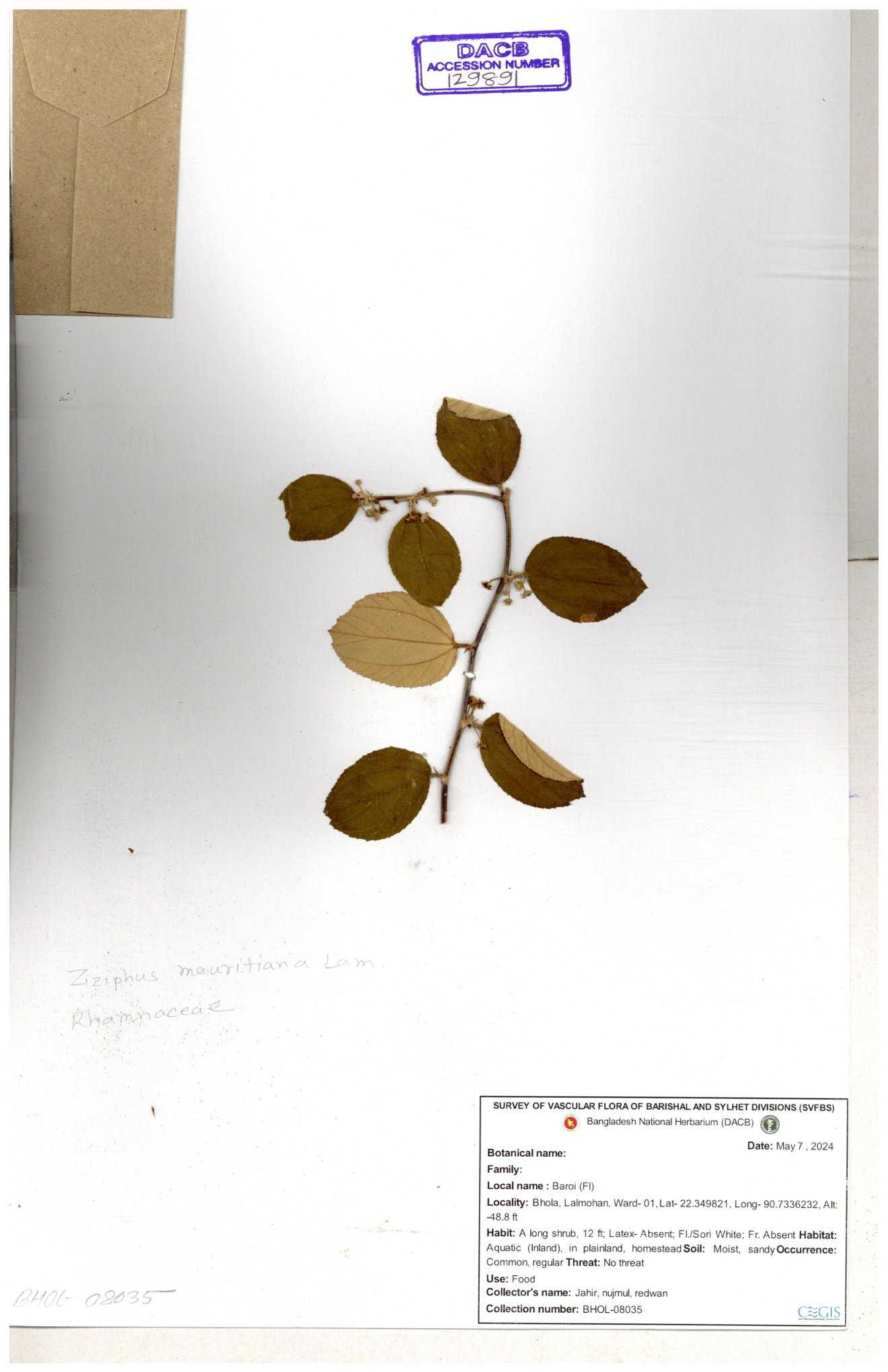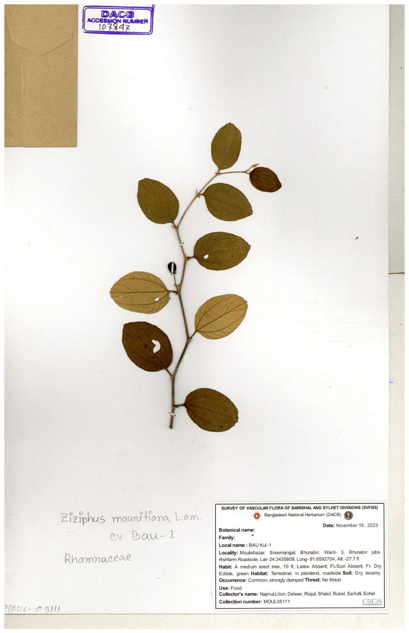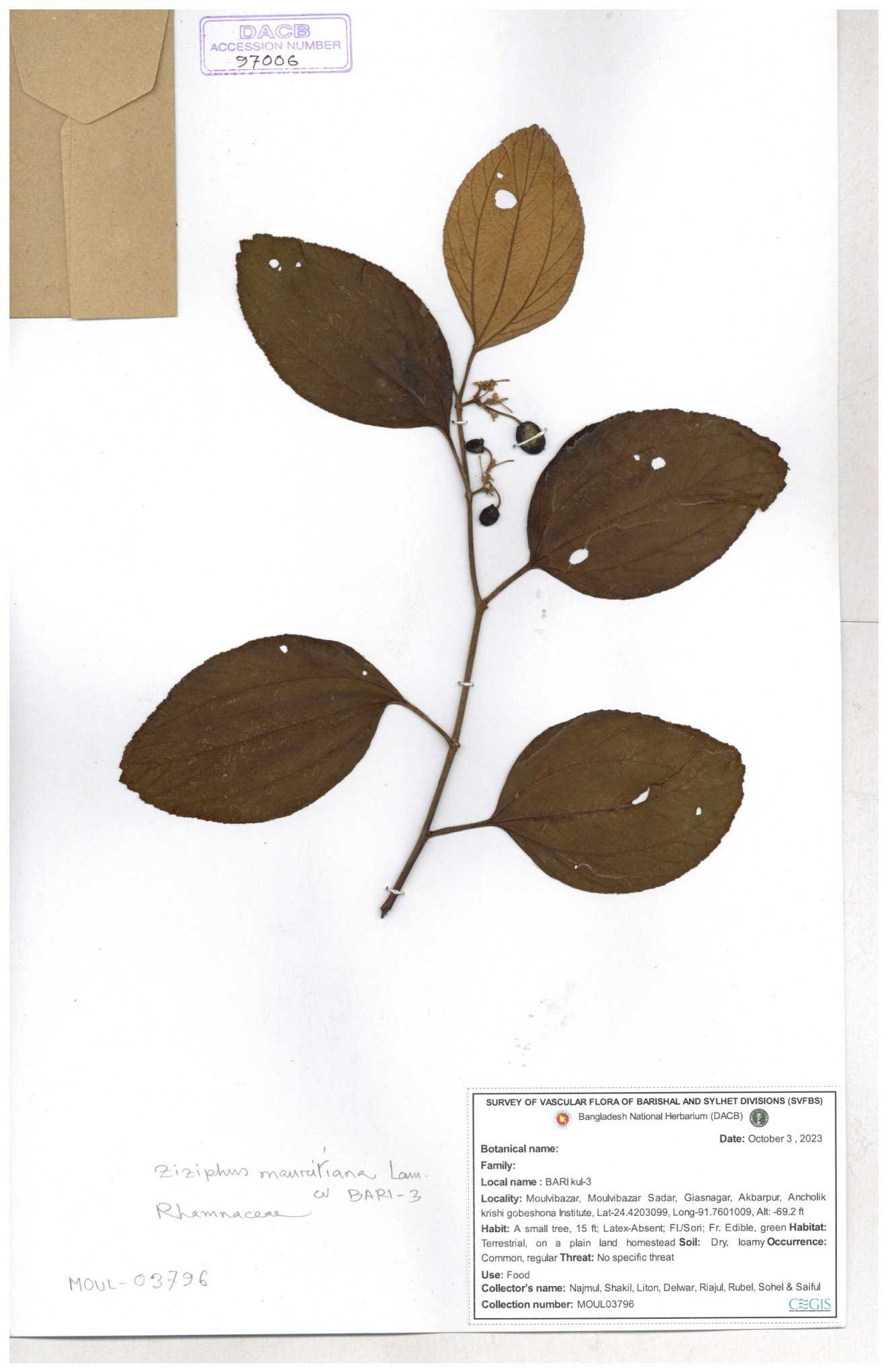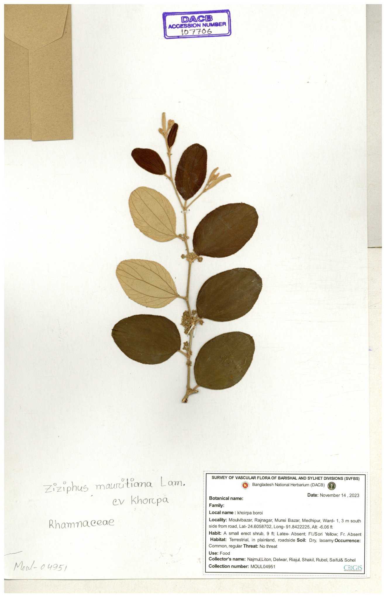| 69858 | Rhamnaceae | Ziziphus Rugosus Lam. | Bonboroi | I Hossen, Ms. Islam & MR Miah | IH-4240 30-11--0001 |