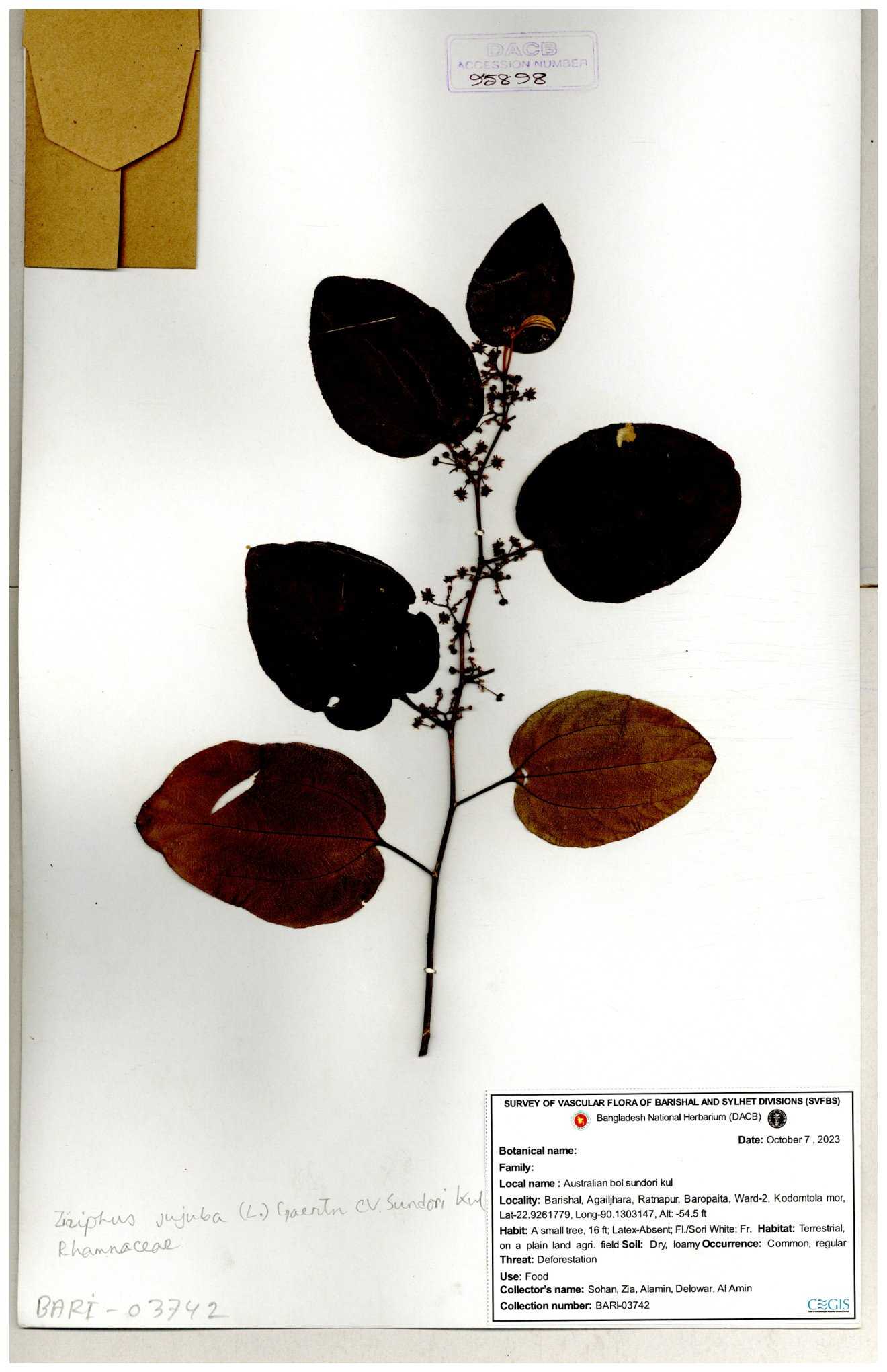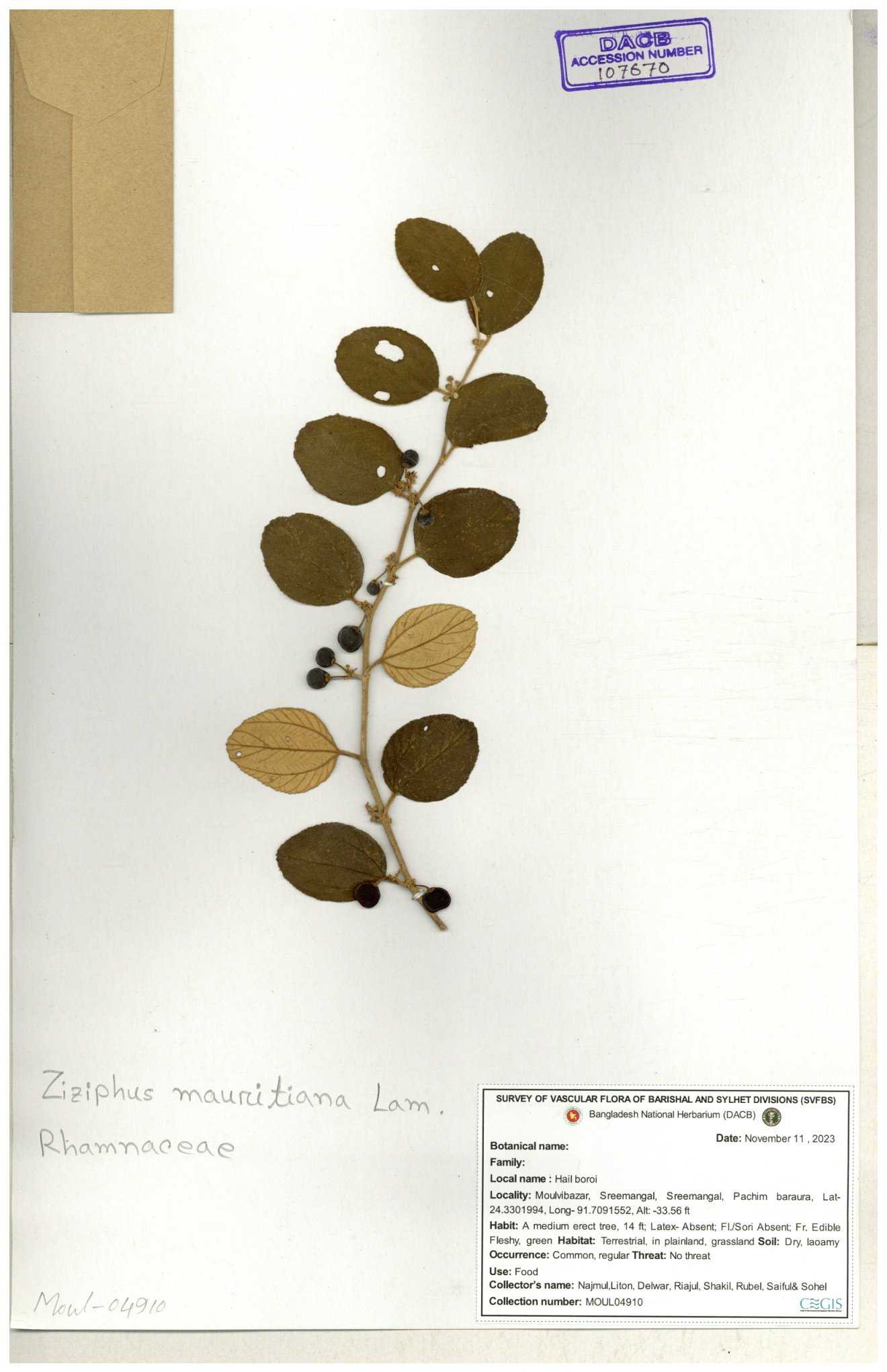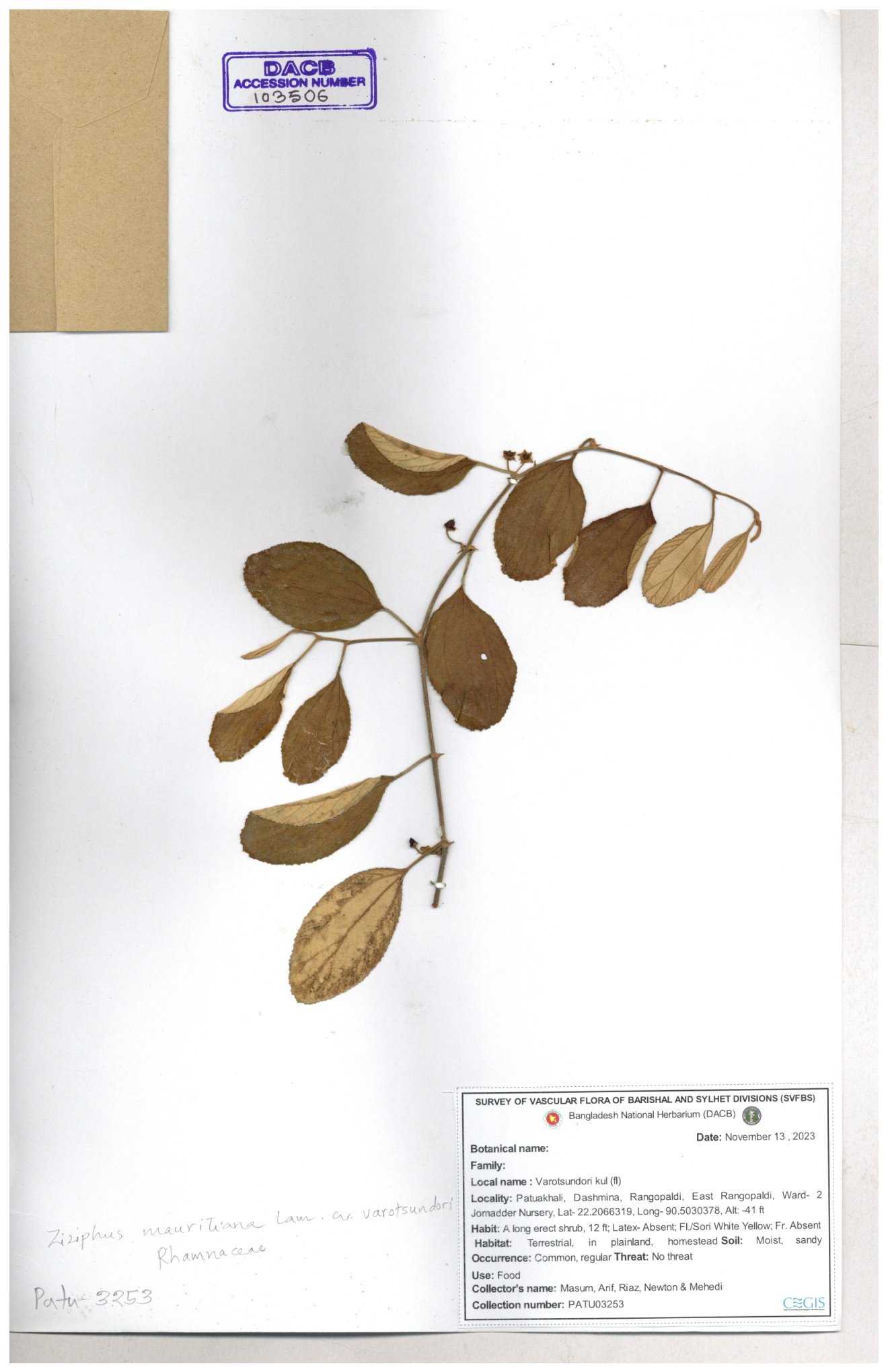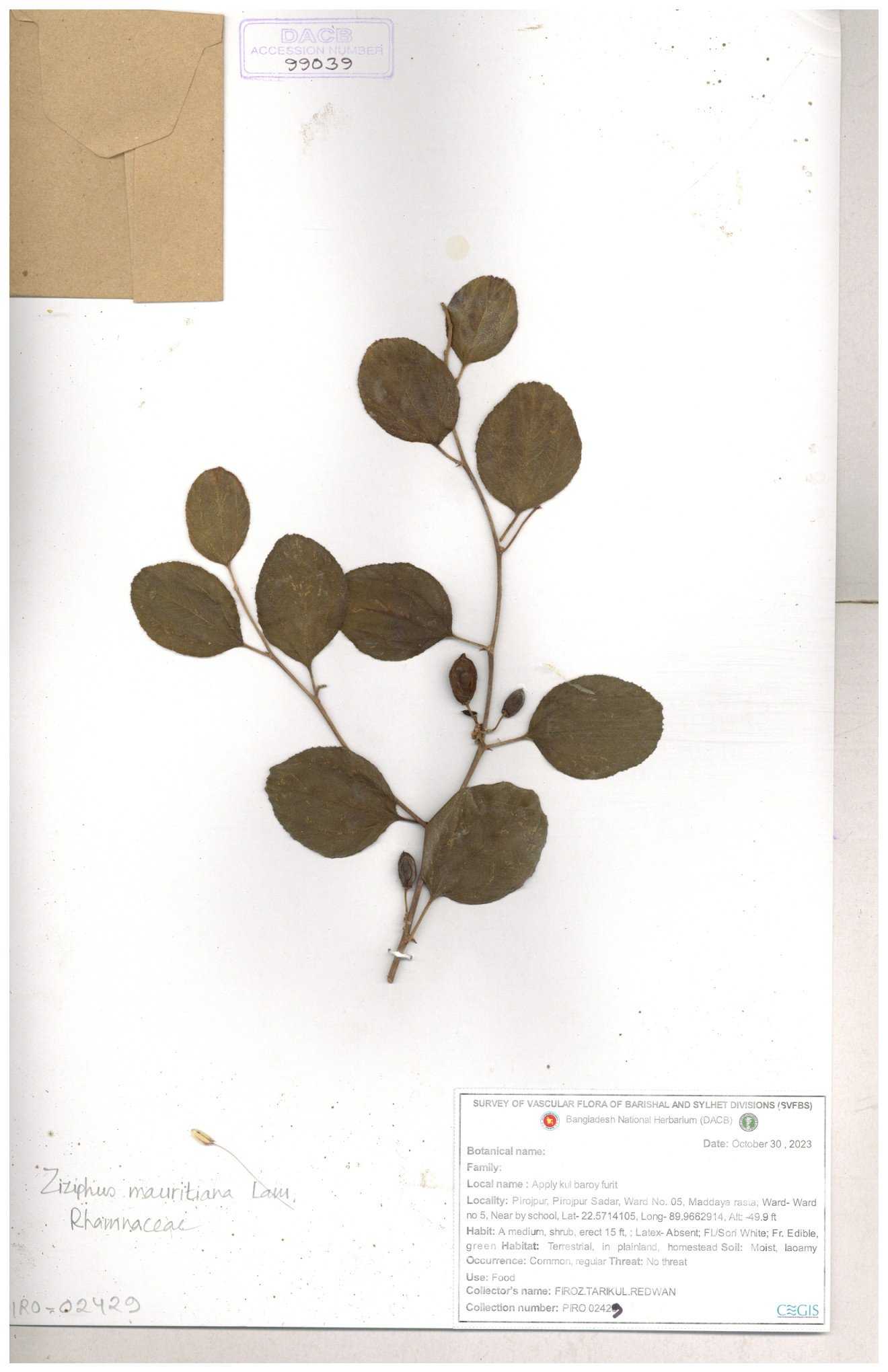 | 69858 | Rhamnaceae | Ziziphus Rugosus Lam. | Bonboroi | I Hossen, Ms. Islam & MR Miah | IH-4240 30-11--0001 |