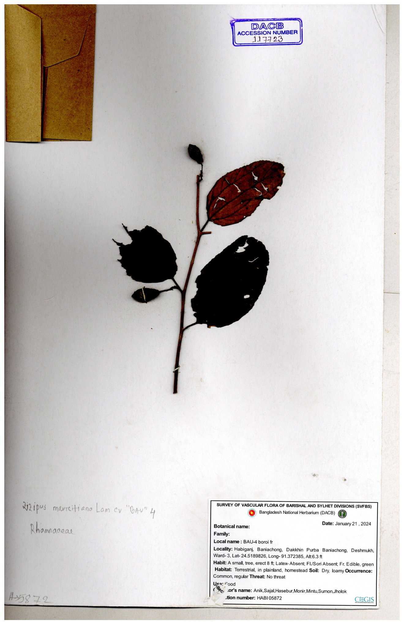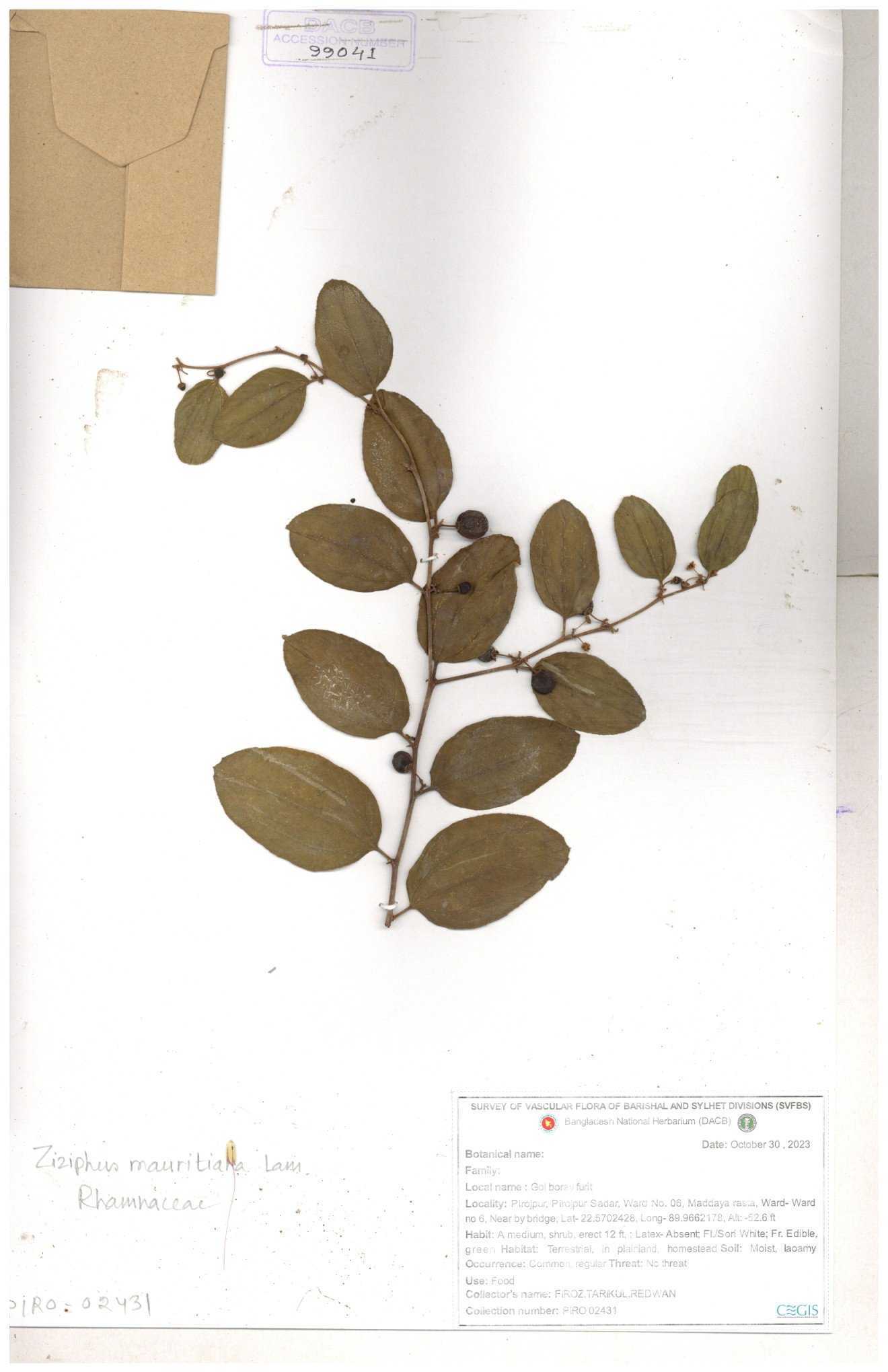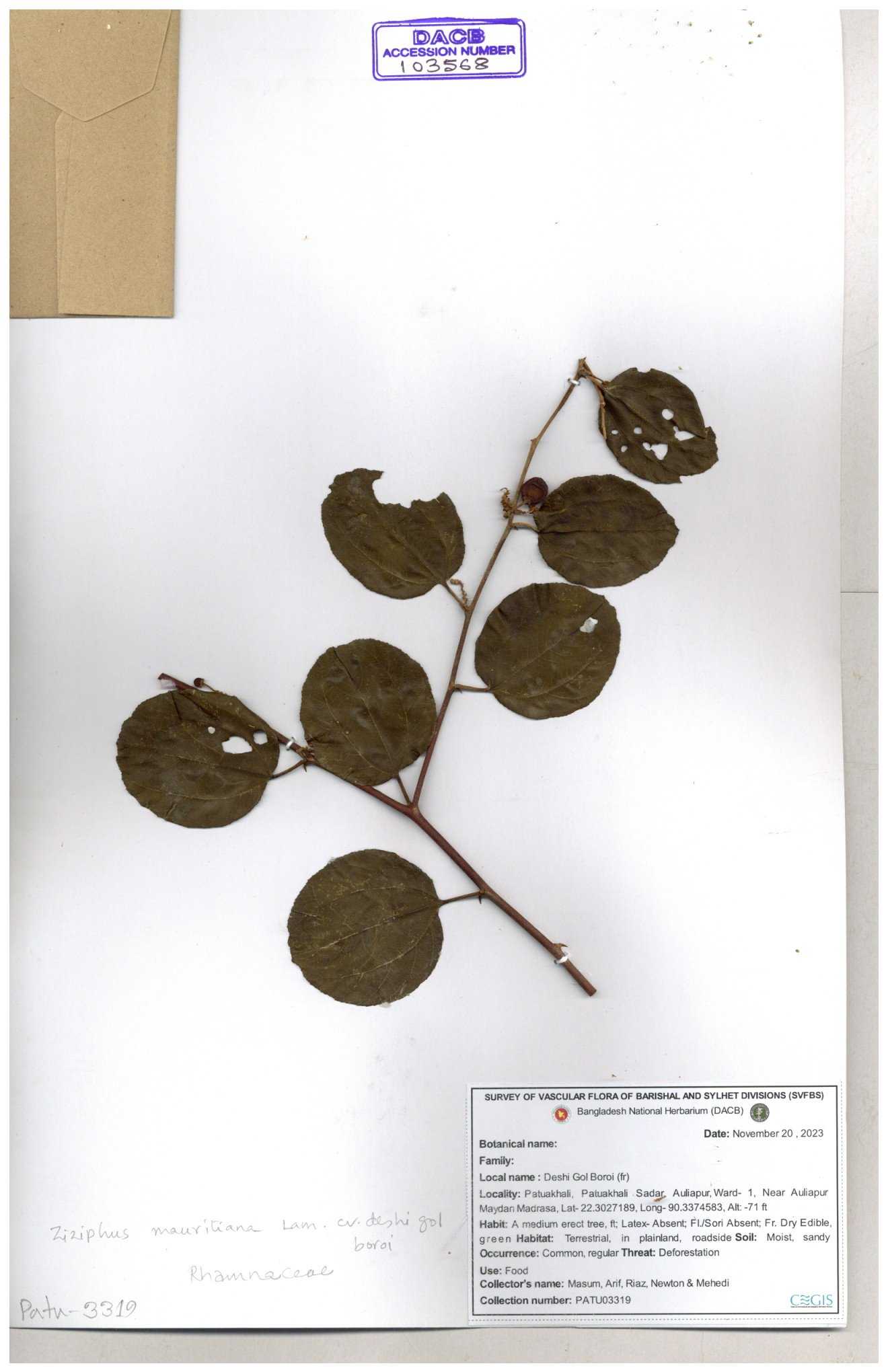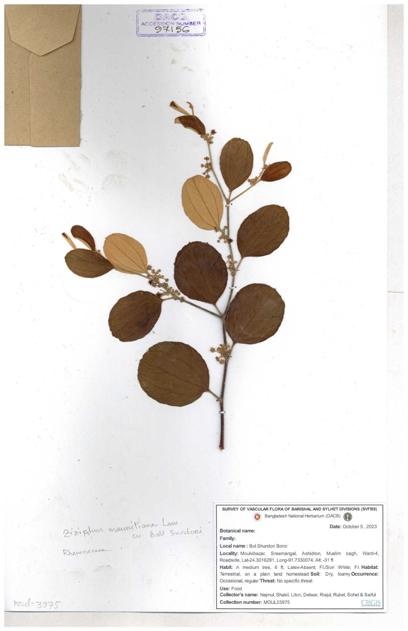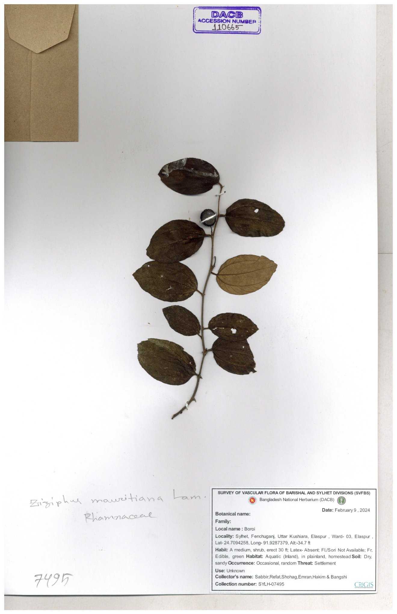 | 69858 | Rhamnaceae | Ziziphus Rugosus Lam. | Bonboroi | I Hossen, Ms. Islam & MR Miah | IH-4240 30-11--0001 |