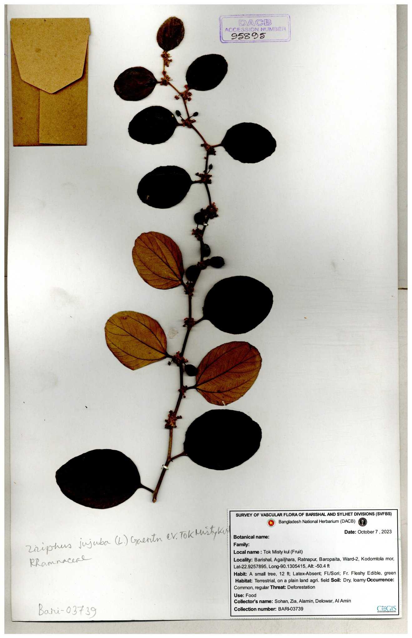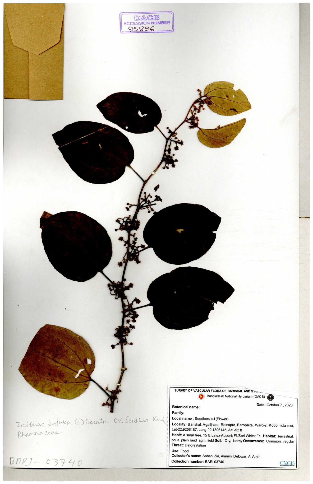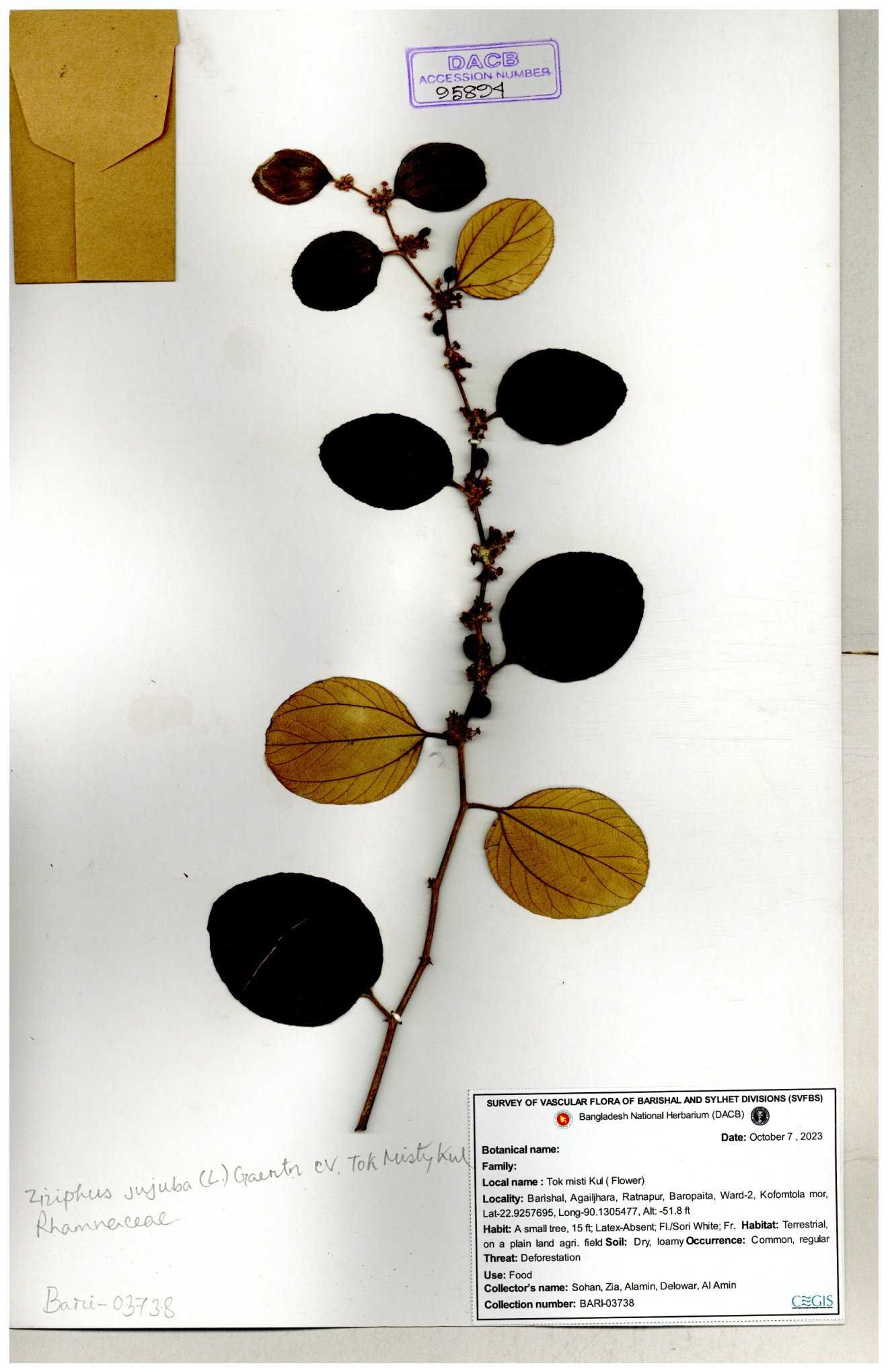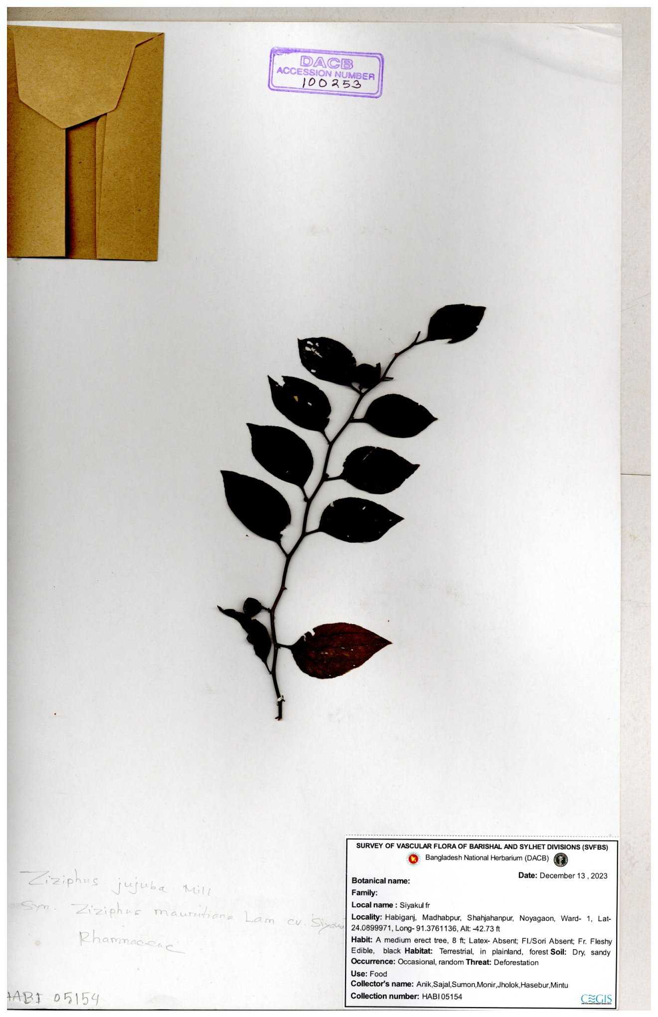 | 52915 | Rhamnaceae | Ziziphus jujuba Mill | Boroi | Tajul, Owahid & Kawsar | TOK-3545 31-01-2017 |