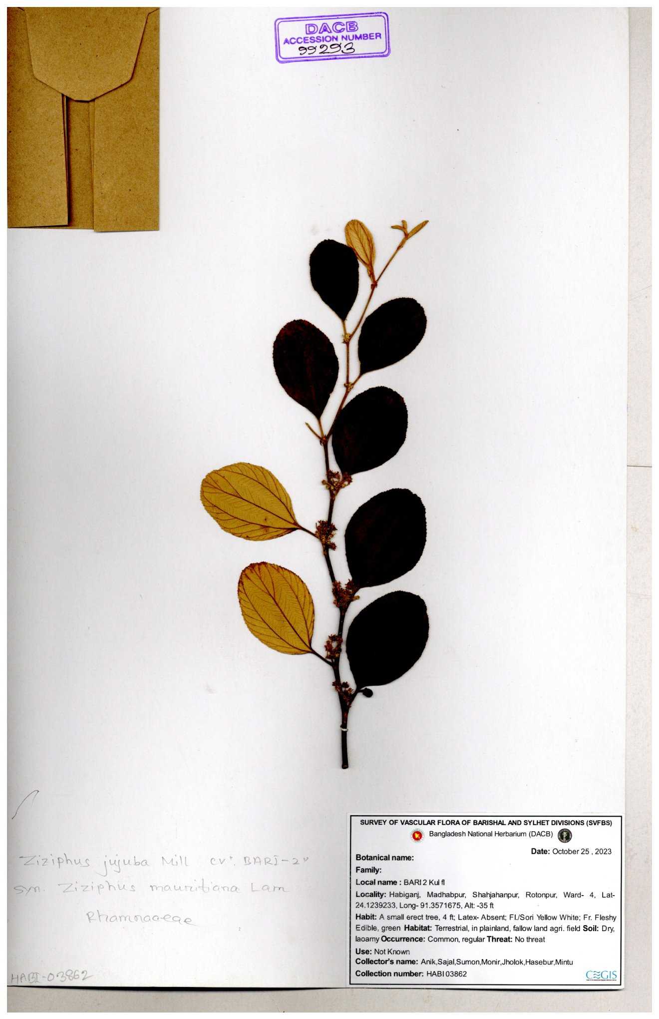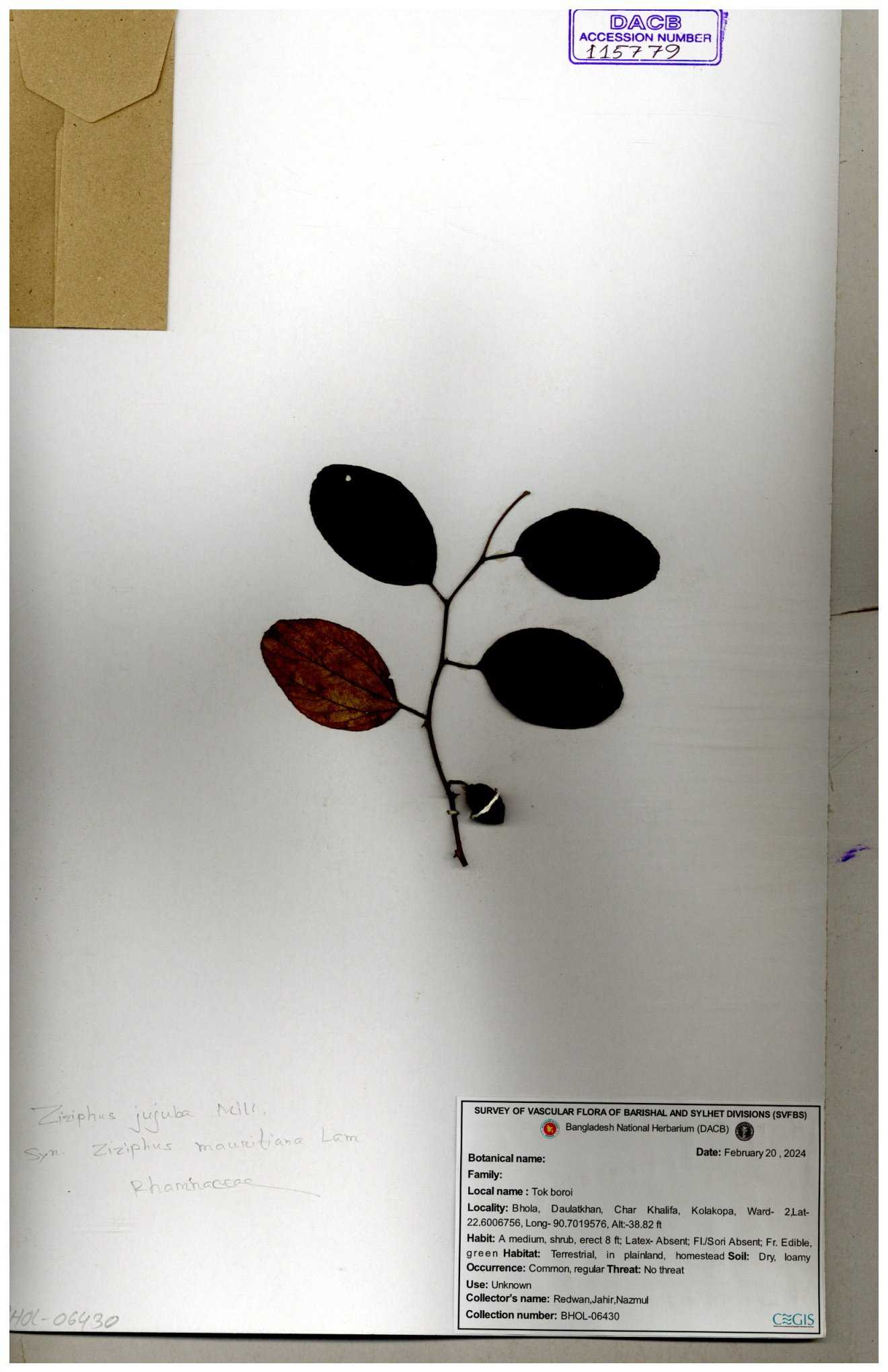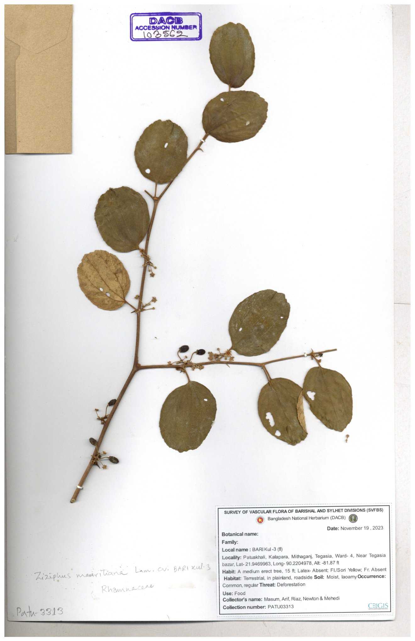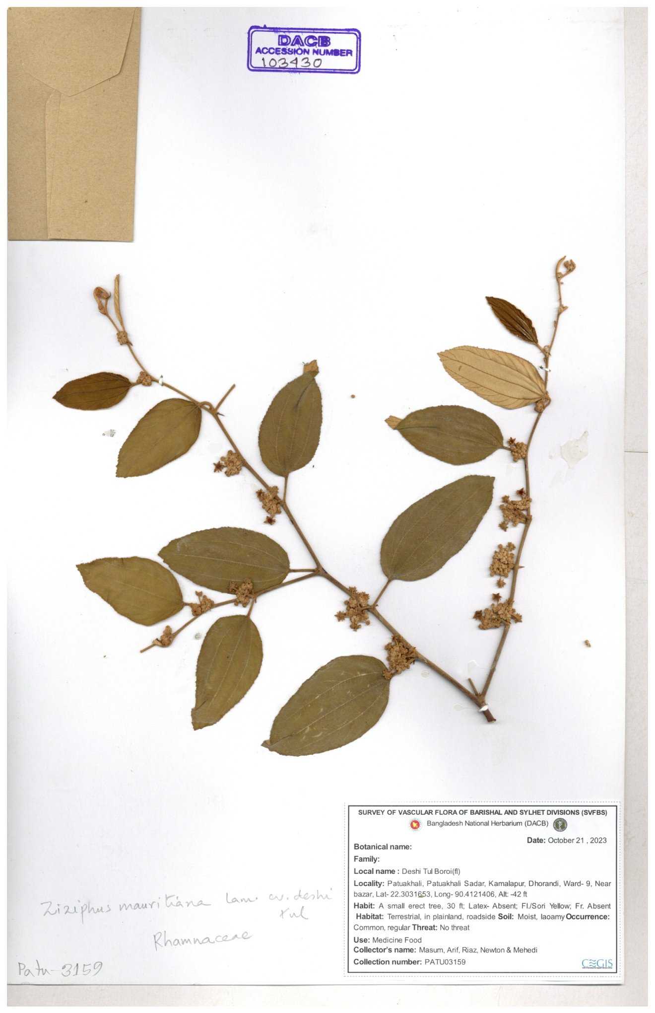 | 52915 | Rhamnaceae | Ziziphus jujuba Mill | Boroi | Tajul, Owahid & Kawsar | TOK-3545 31-01-2017 |