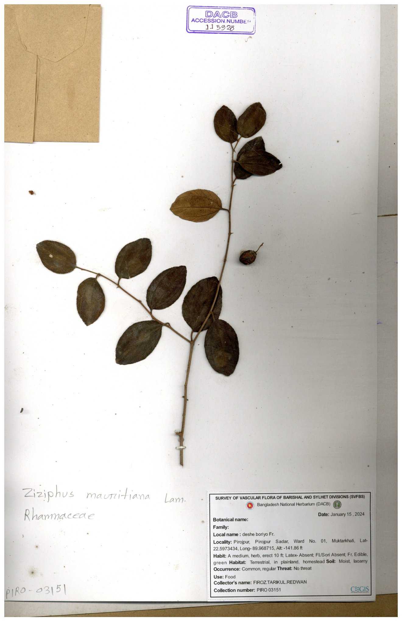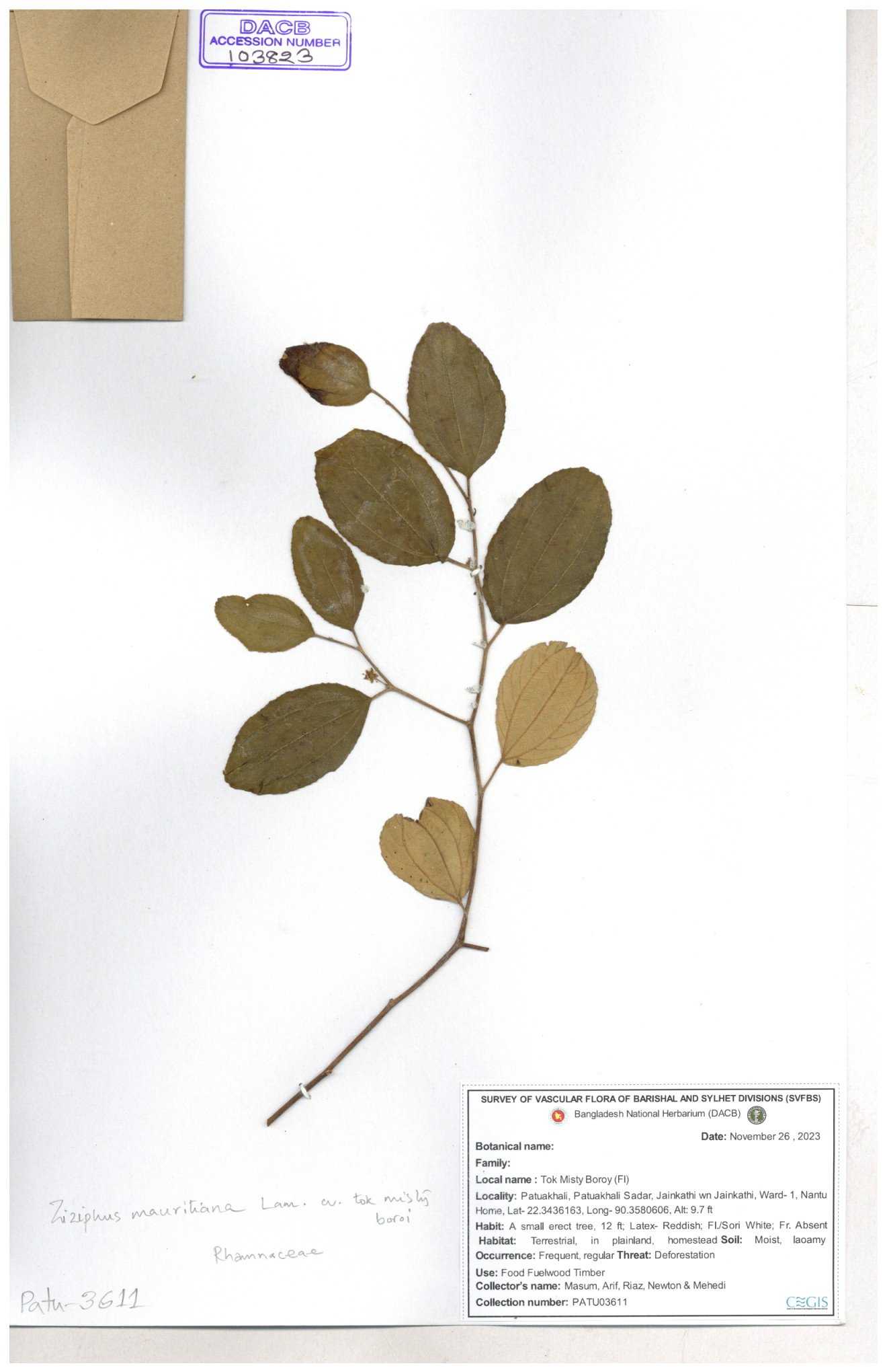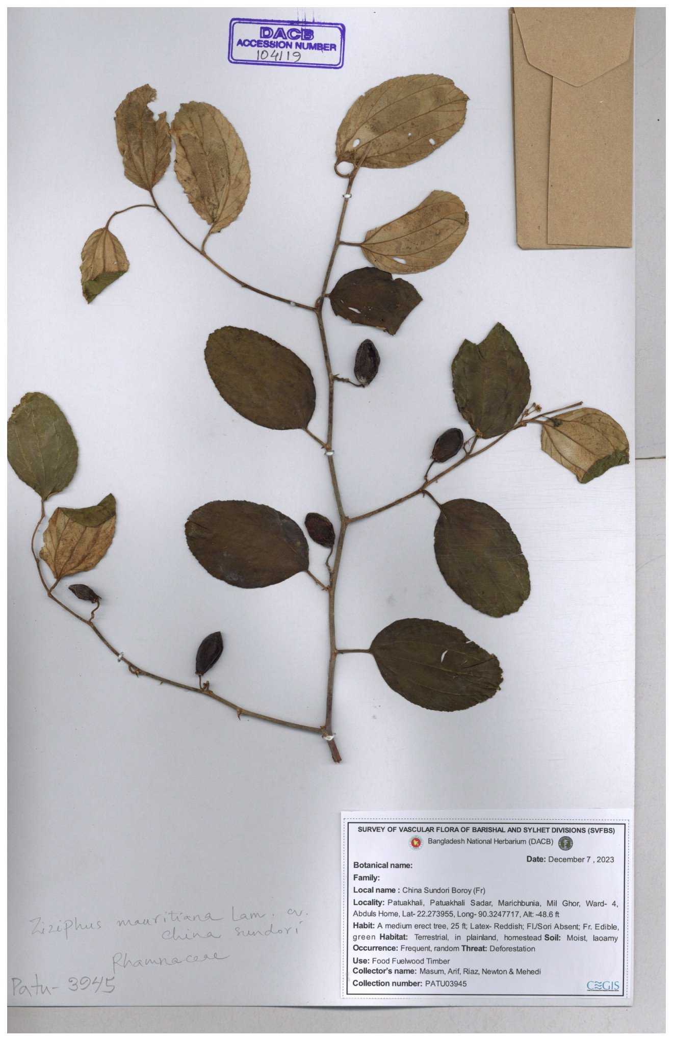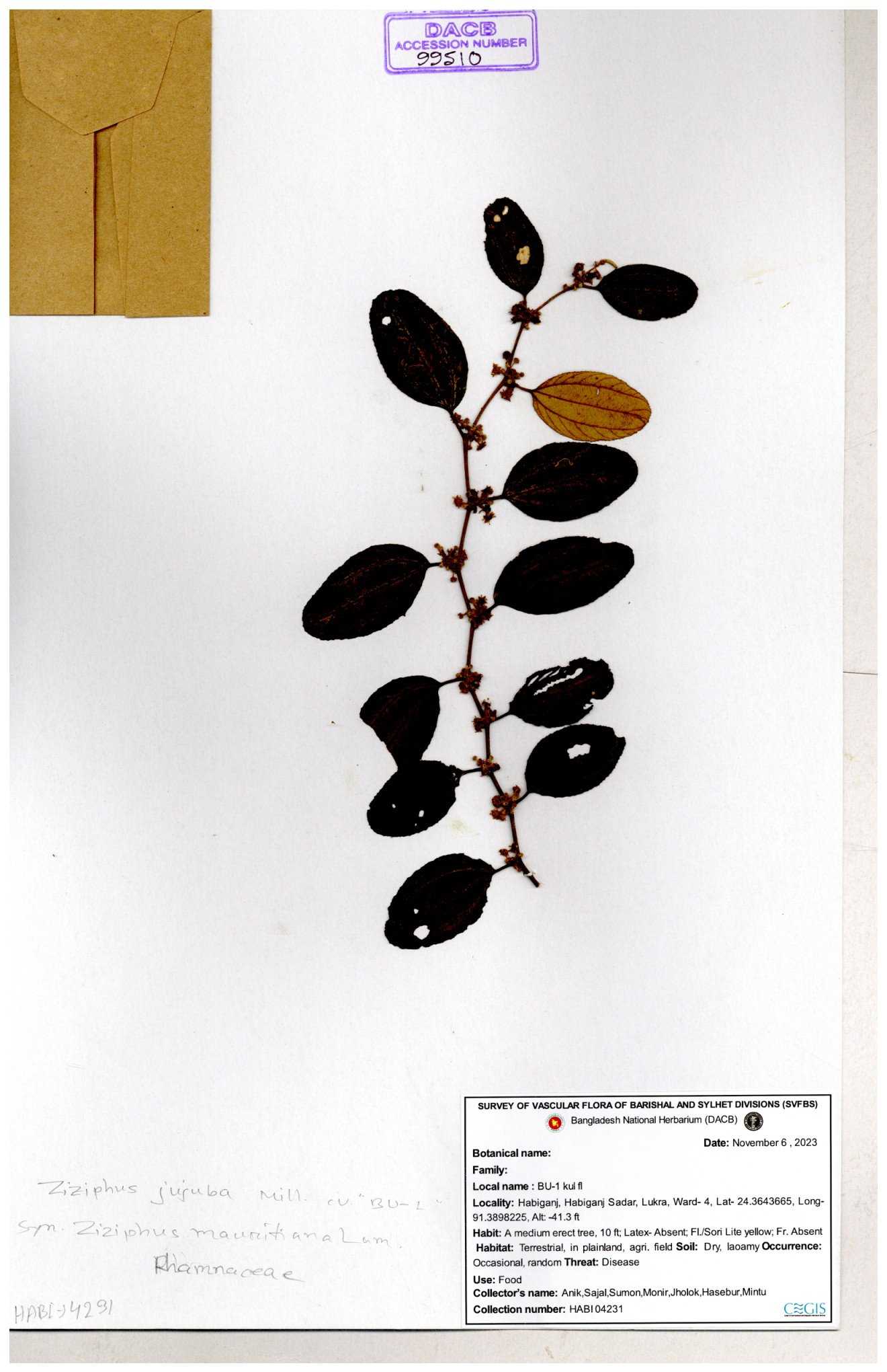 | 52915 | Rhamnaceae | Ziziphus jujuba Mill | Boroi | Tajul, Owahid & Kawsar | TOK-3545 31-01-2017 |