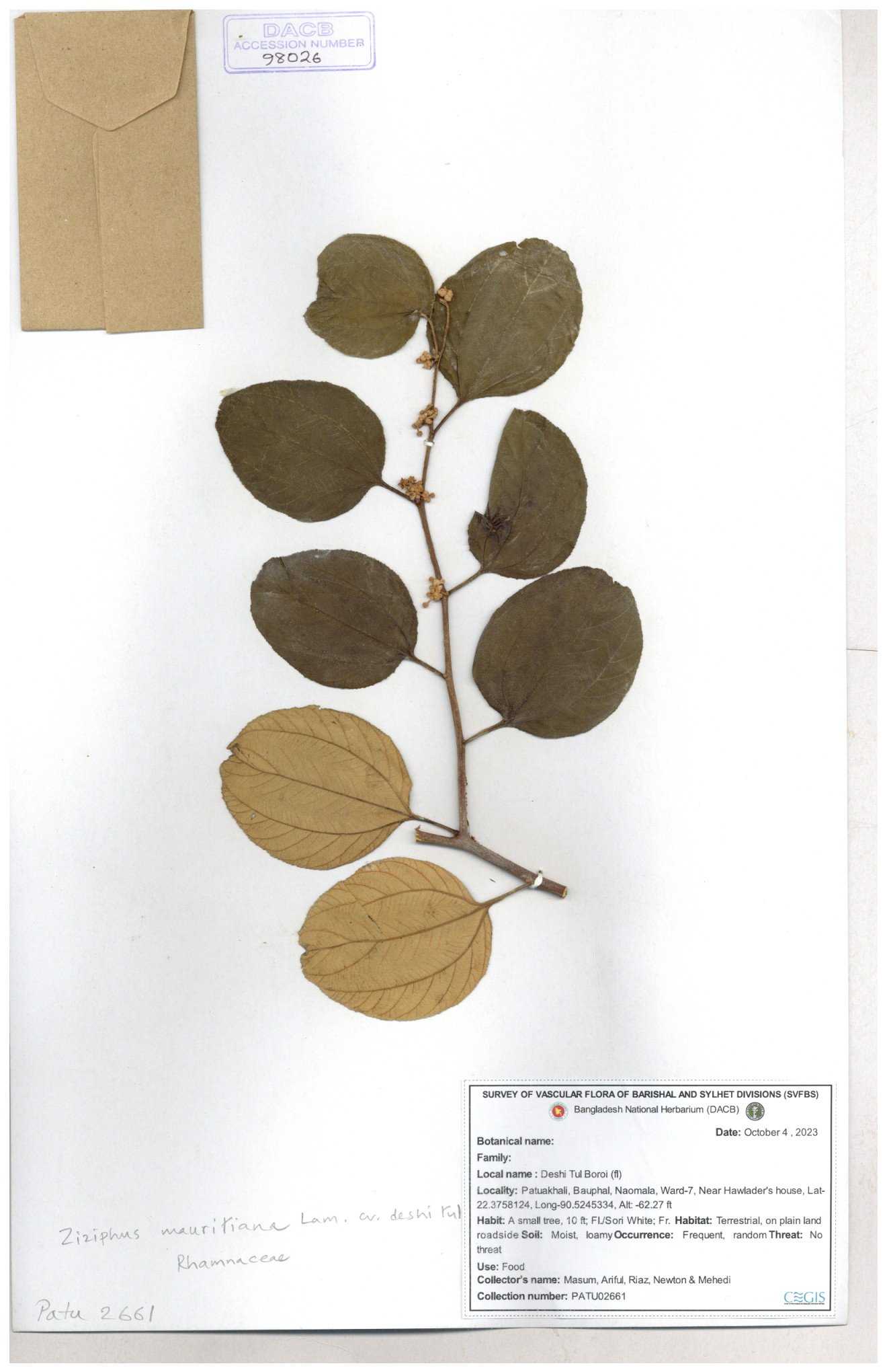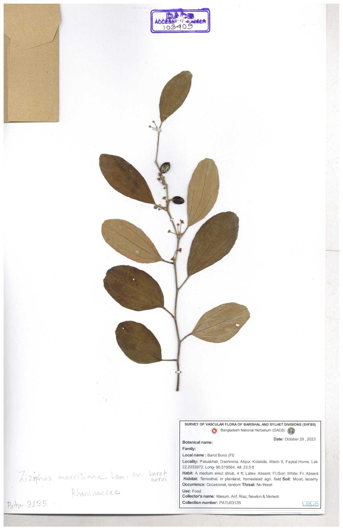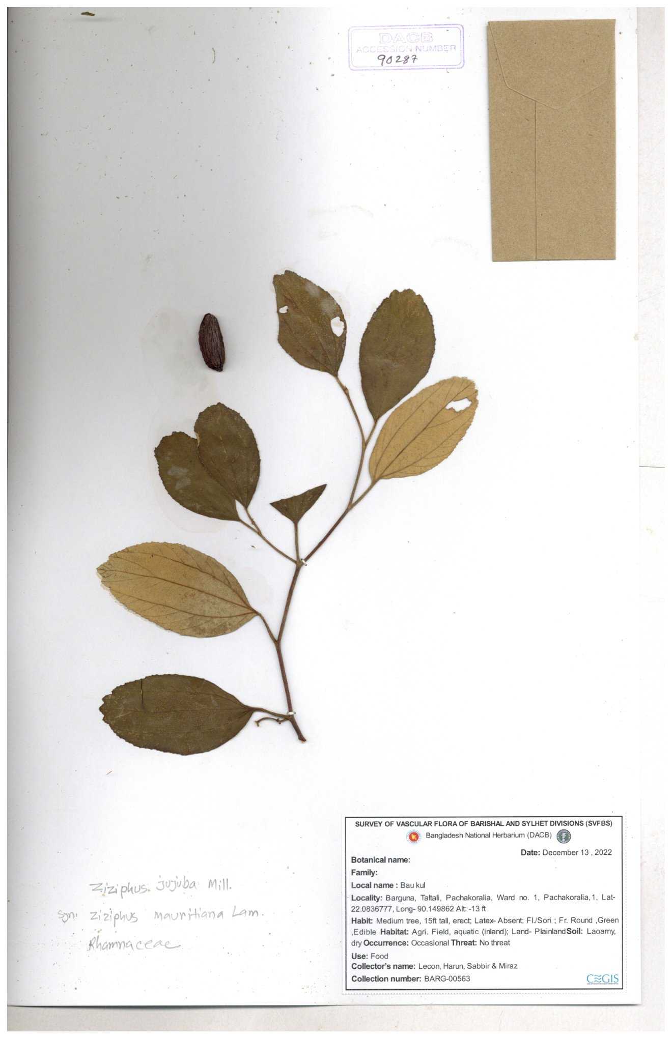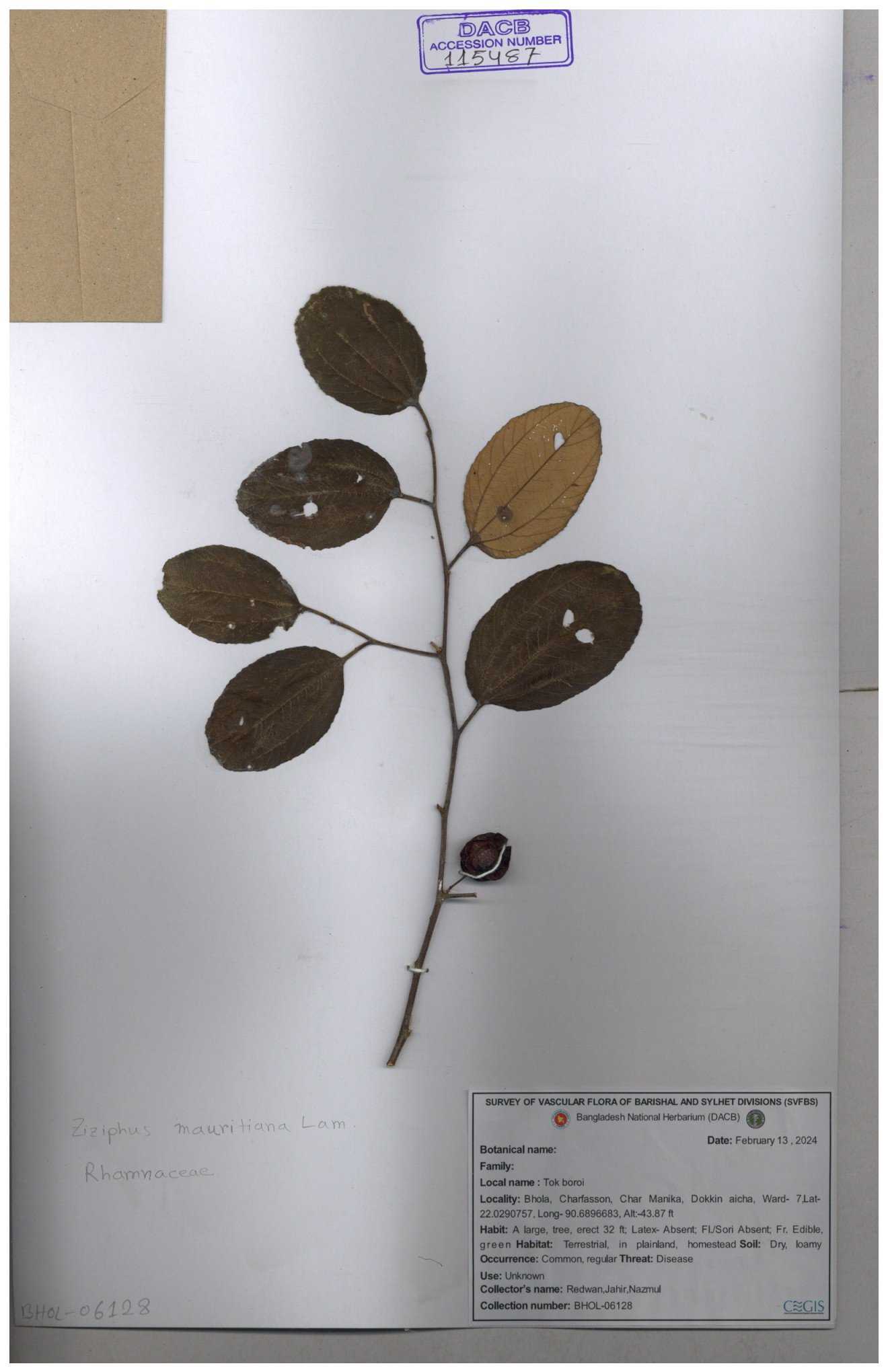 | 52915 | Rhamnaceae | Ziziphus jujuba Mill | Boroi | Tajul, Owahid & Kawsar | TOK-3545 31-01-2017 |