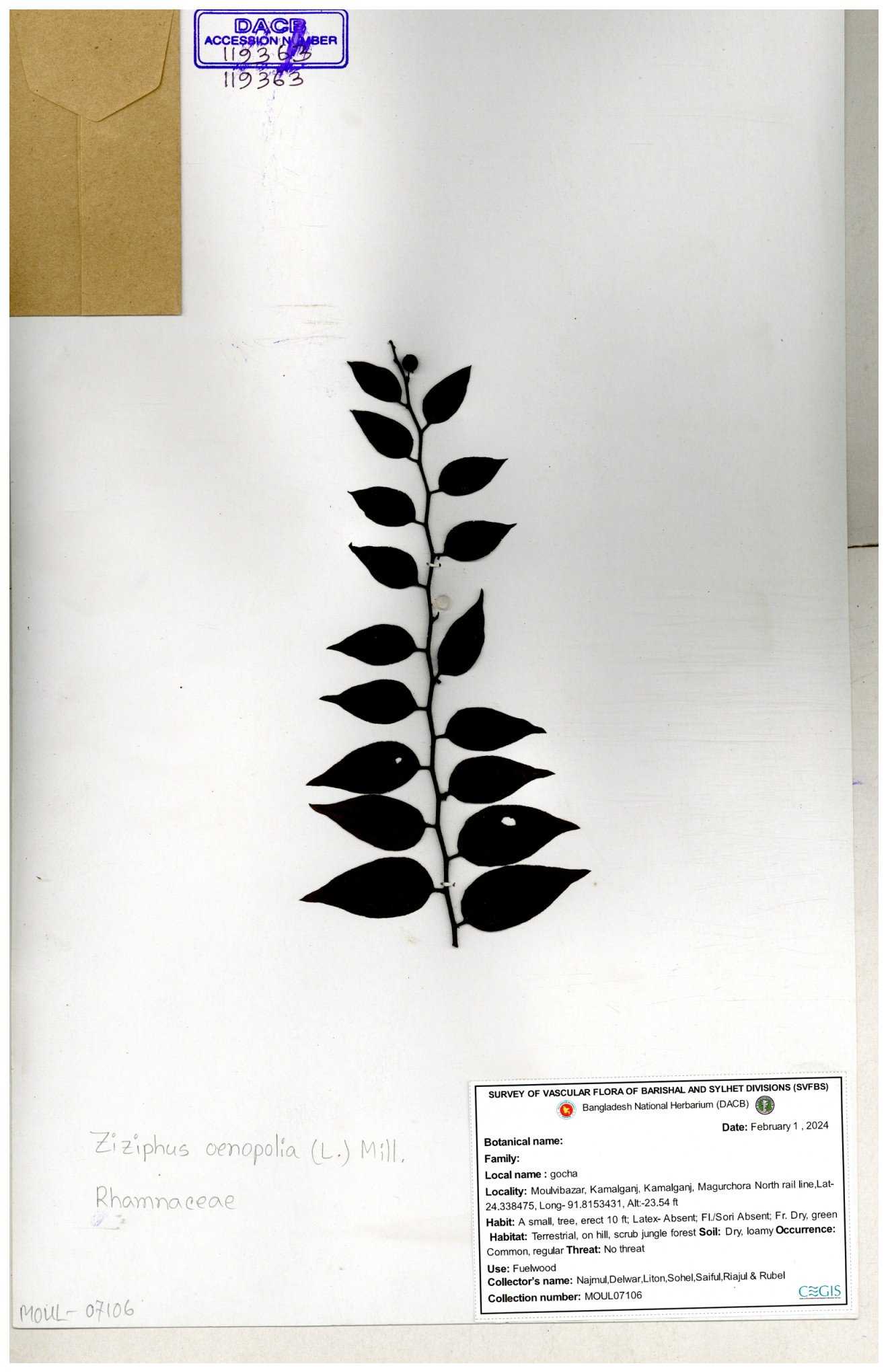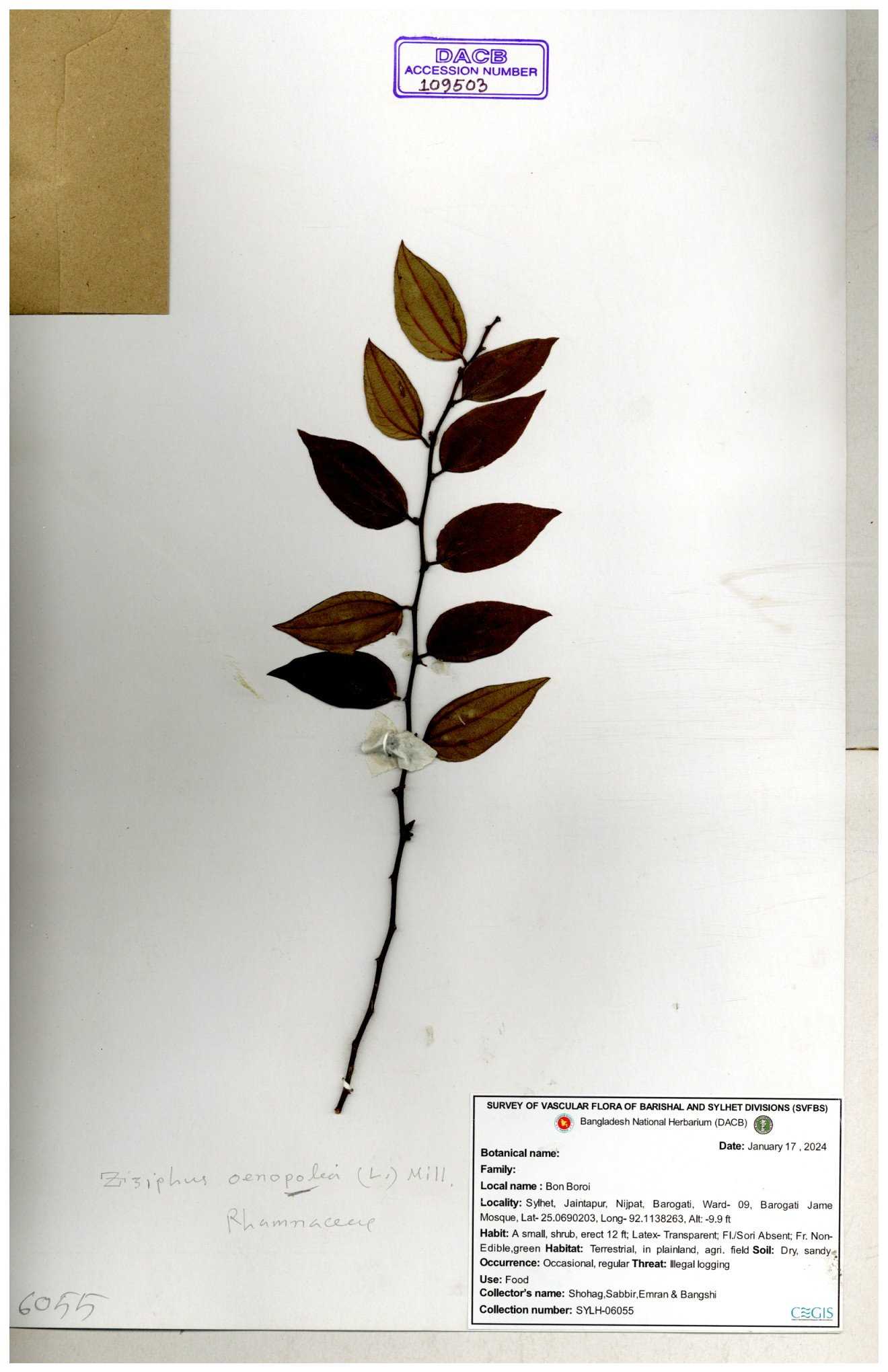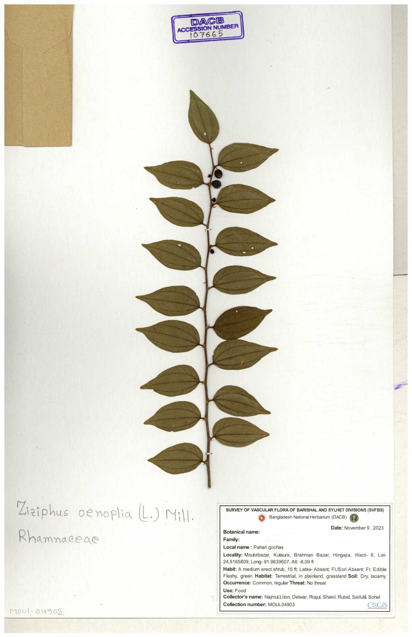 | 64962 | Rhamnaceae | Ziziphus oenopolia (L.) Mill. | Joyanta Chandra Roy, Mominur Rahman, Al amin | JCR-1838 28-11-2016 |