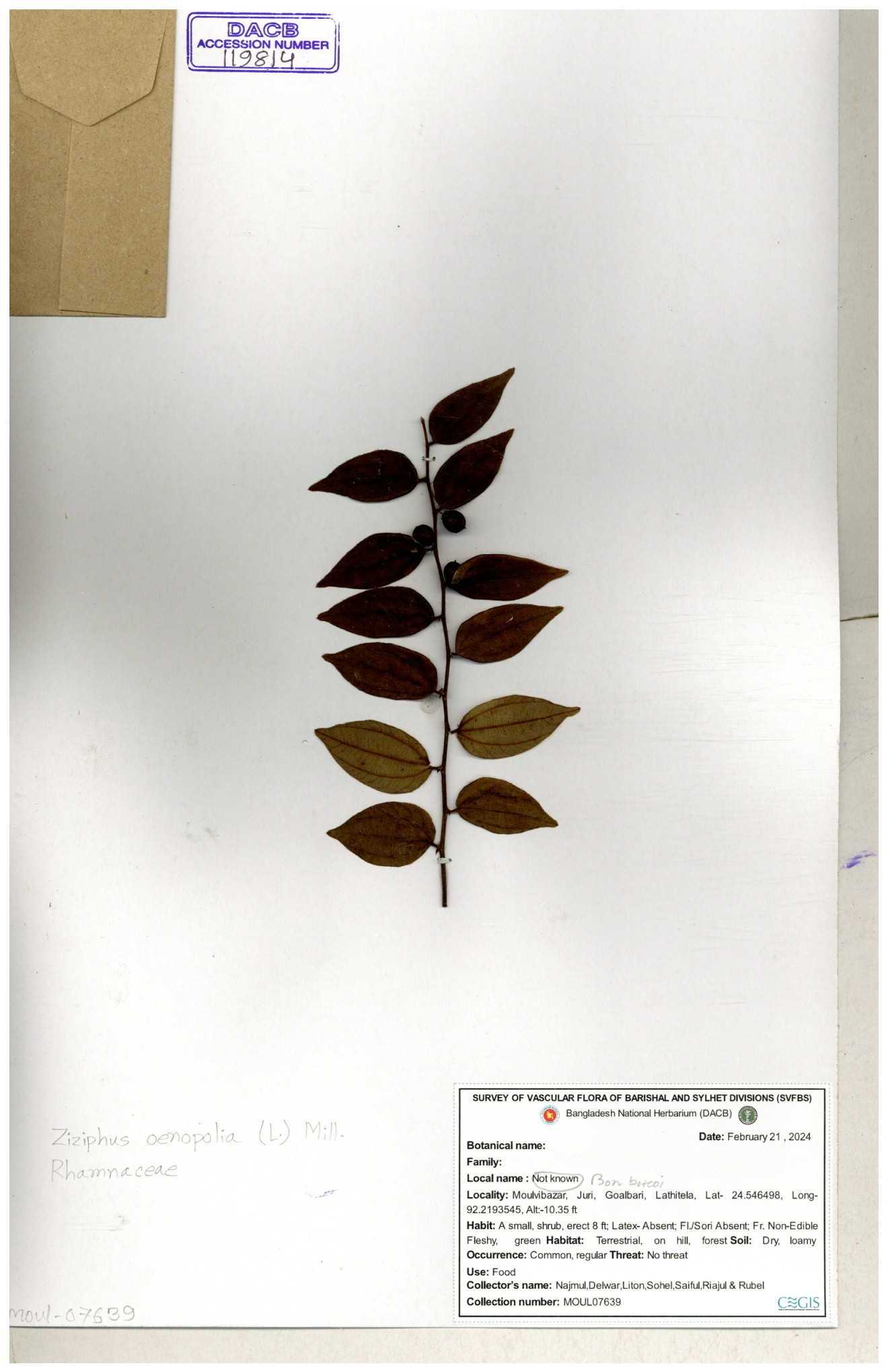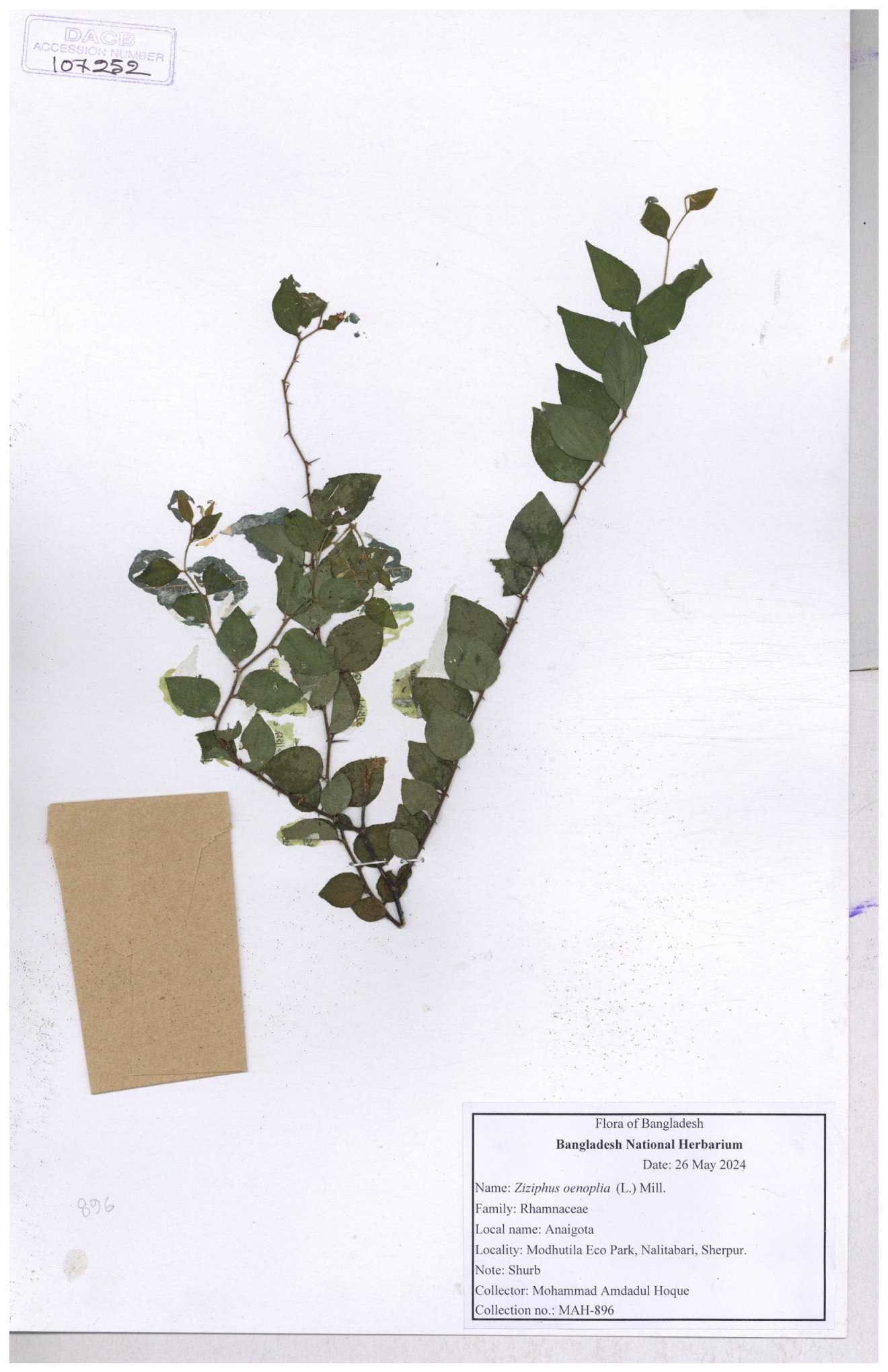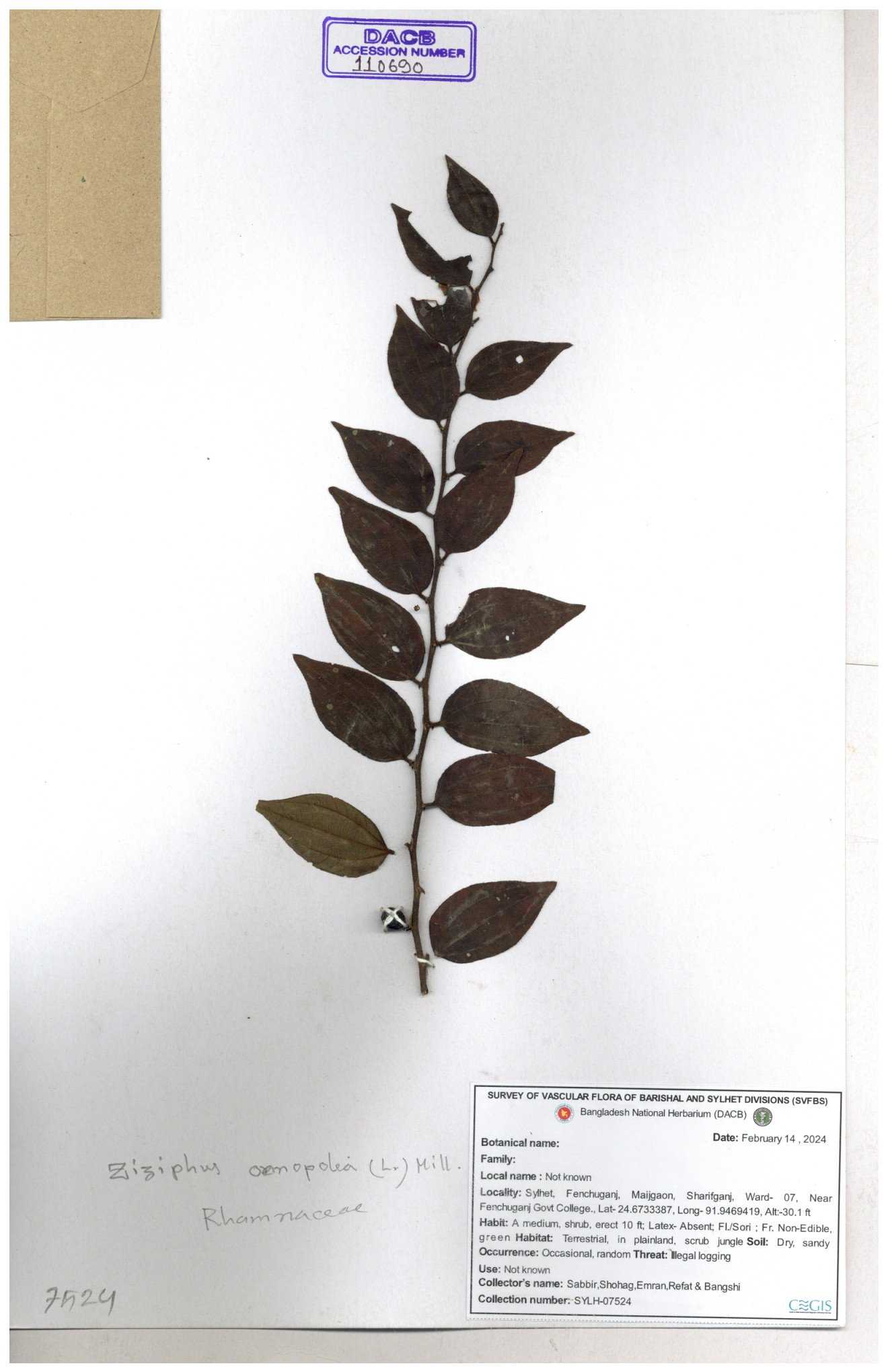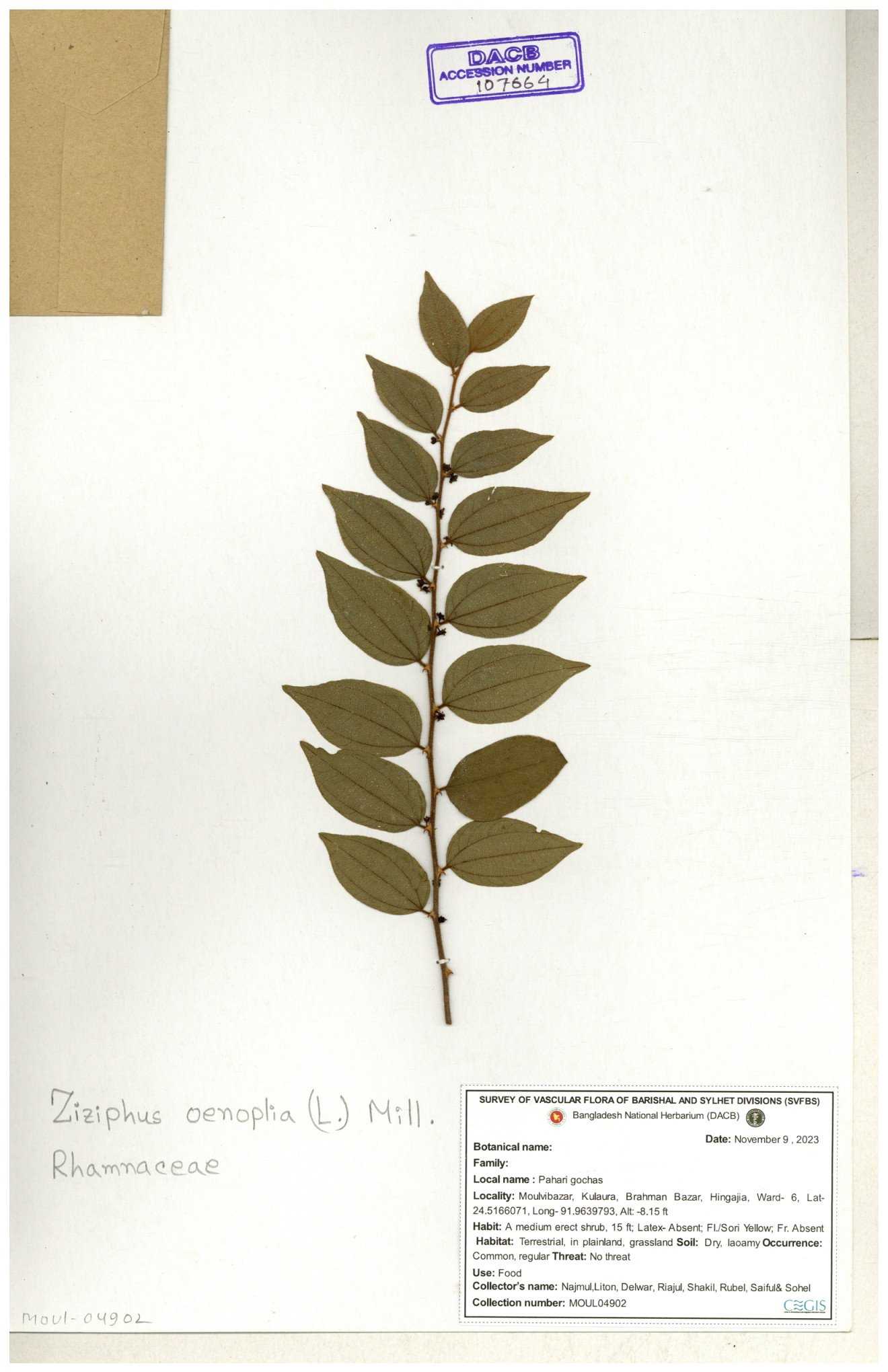 | 64962 | Rhamnaceae | Ziziphus oenopolia (L.) Mill. | Joyanta Chandra Roy, Mominur Rahman, Al amin | JCR-1838 28-11-2016 |