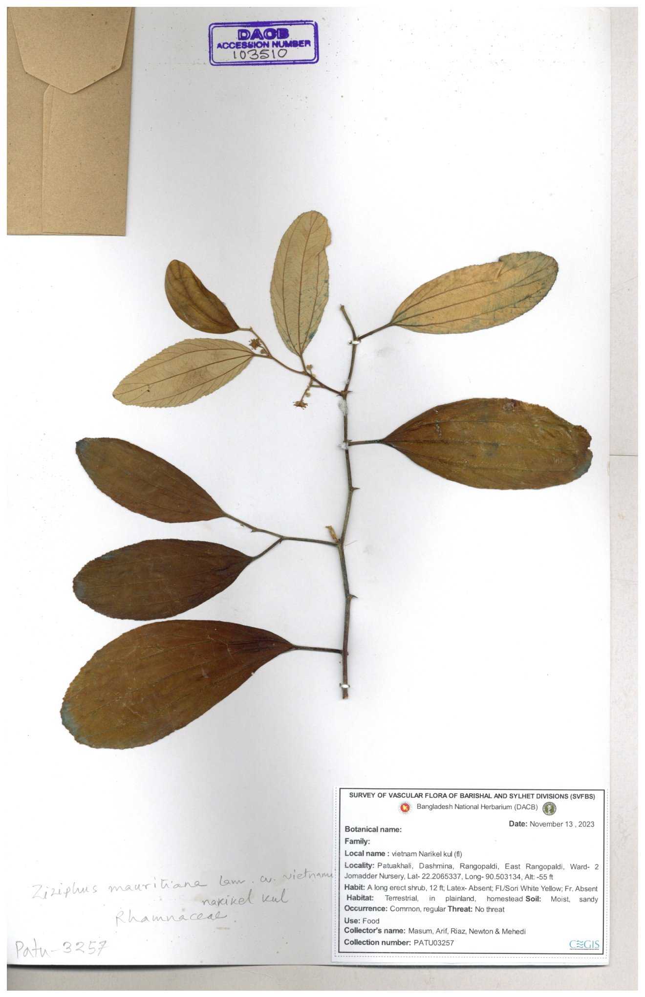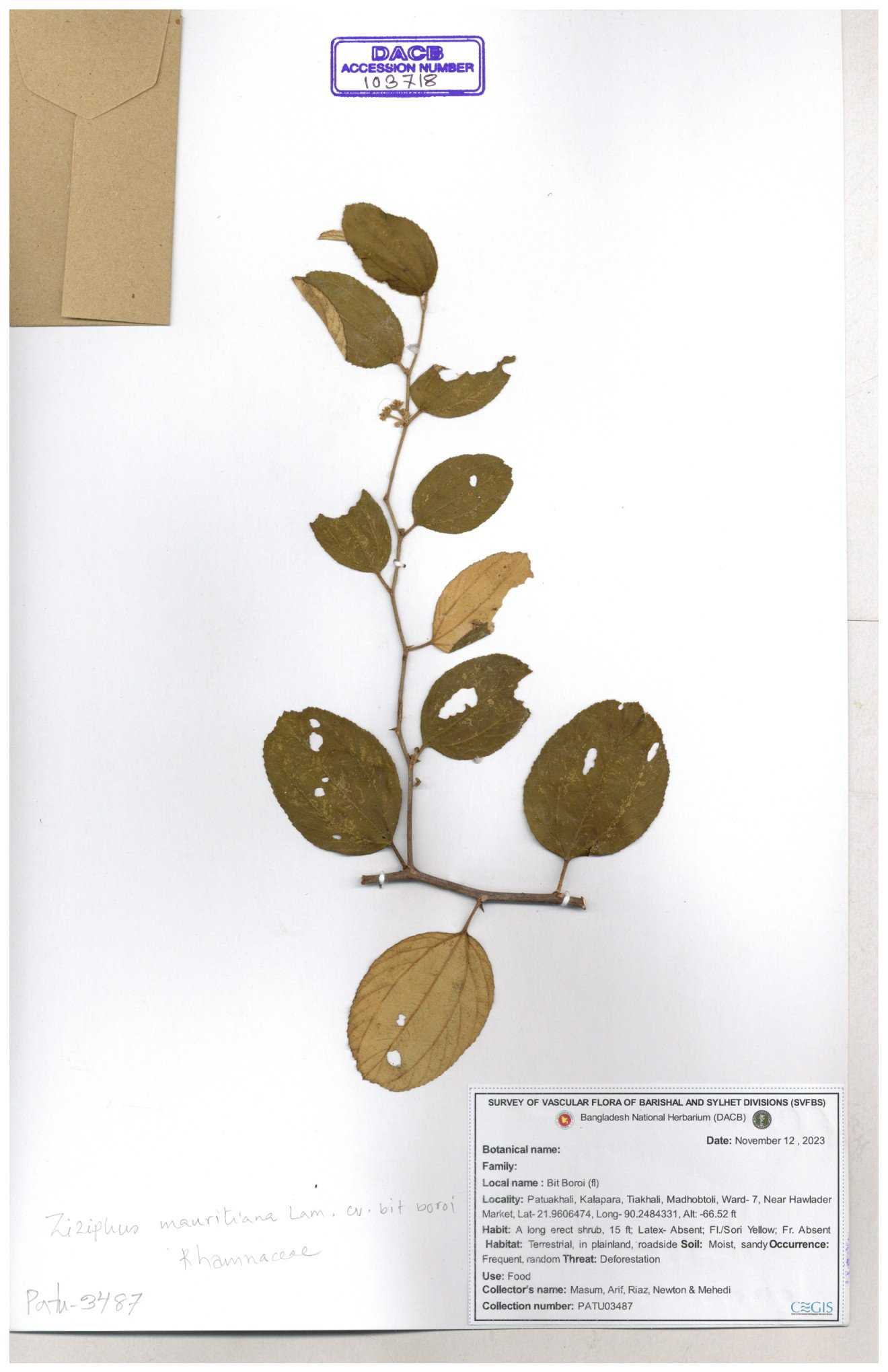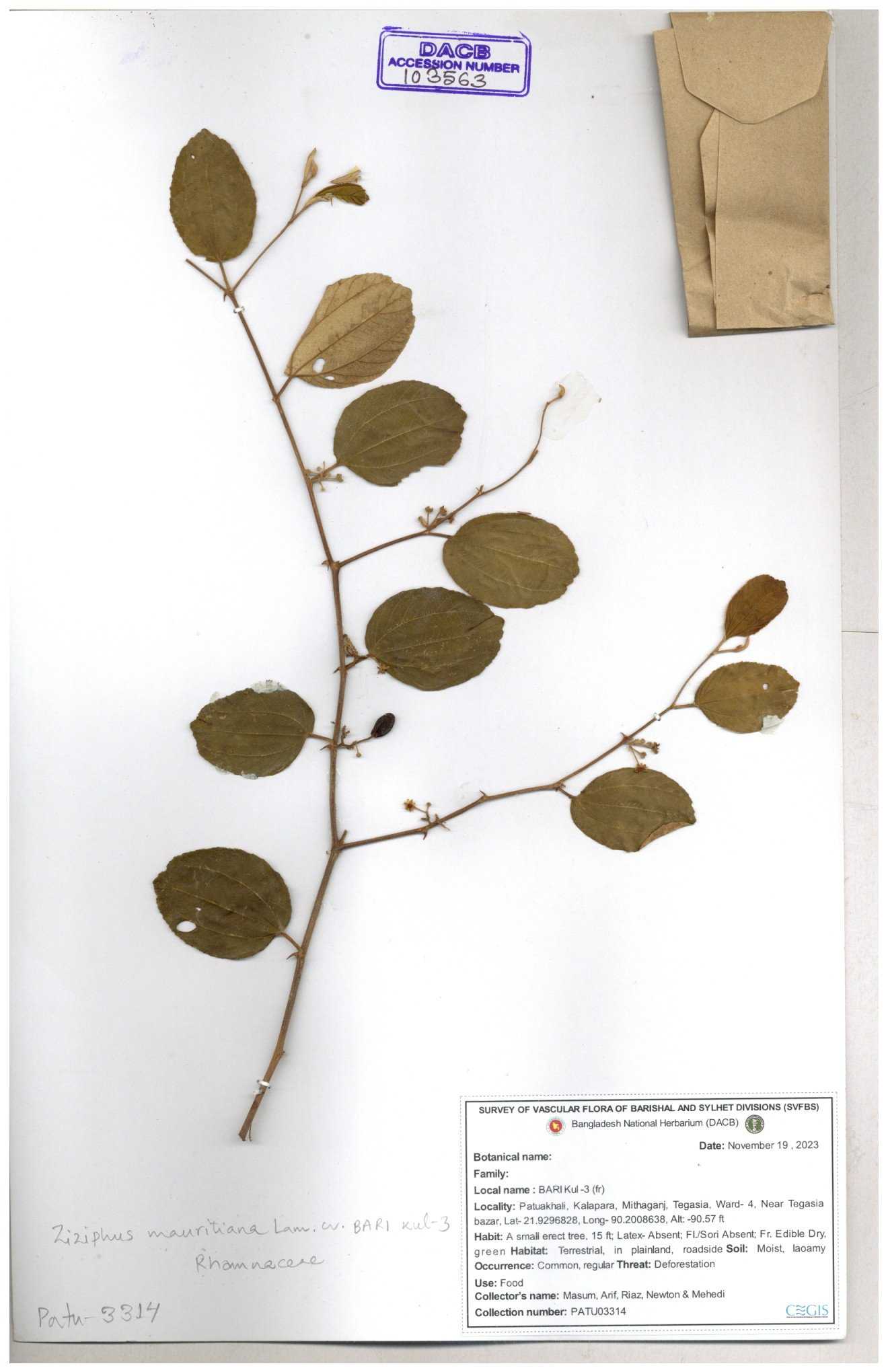 | 65811 | Rhamnaceae | Ziziphus sp. | Unknown | Naimur Rahman | NR- 1445 02-12-2020 |