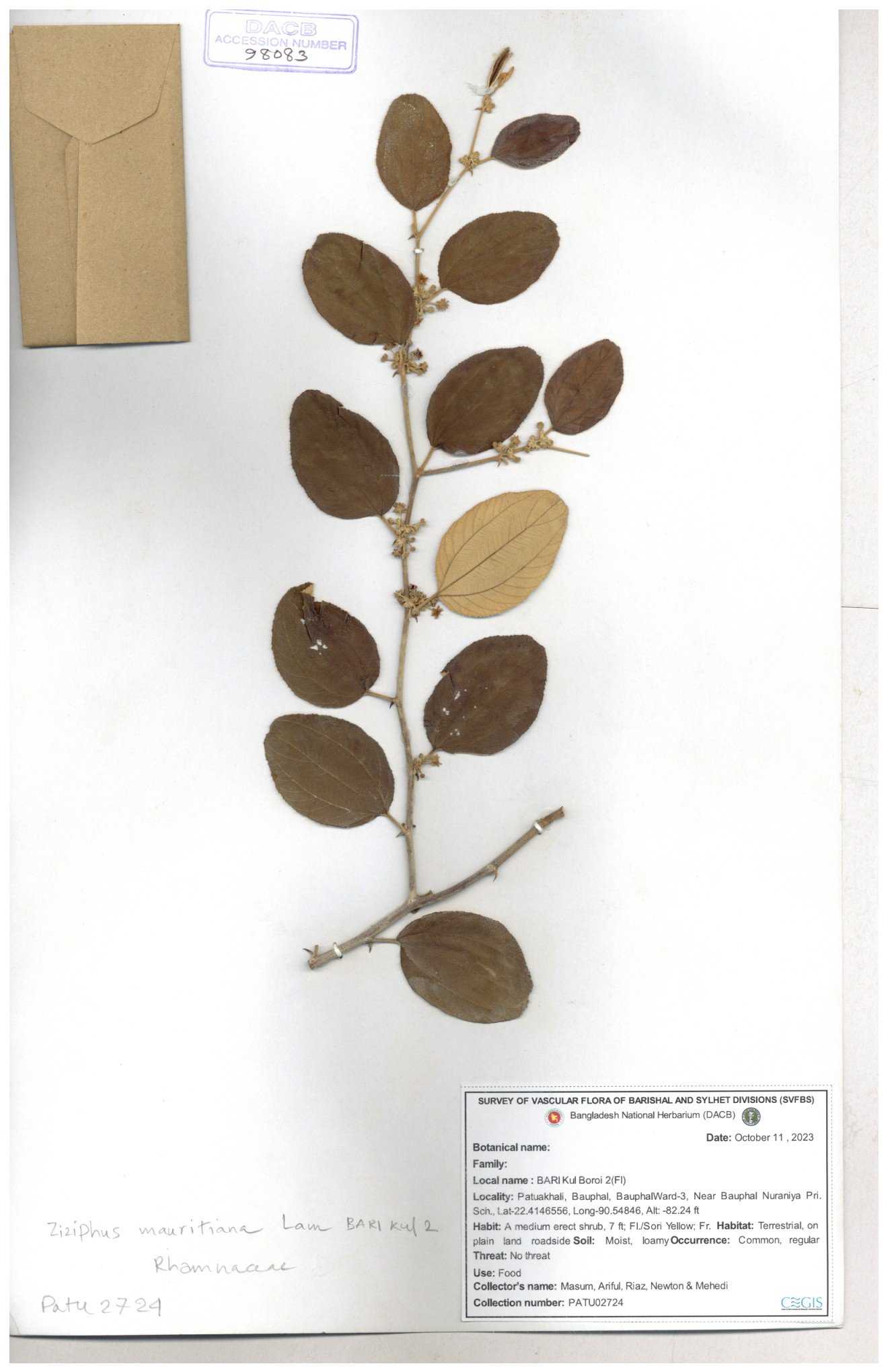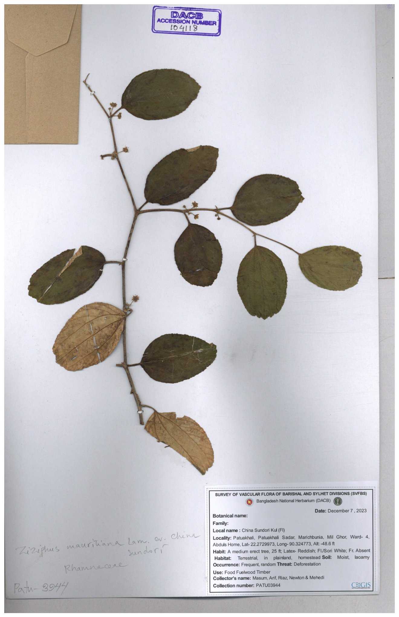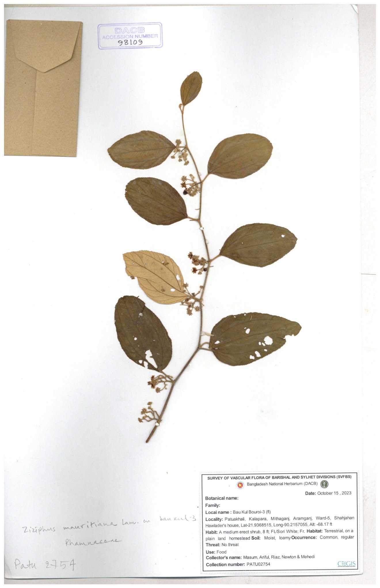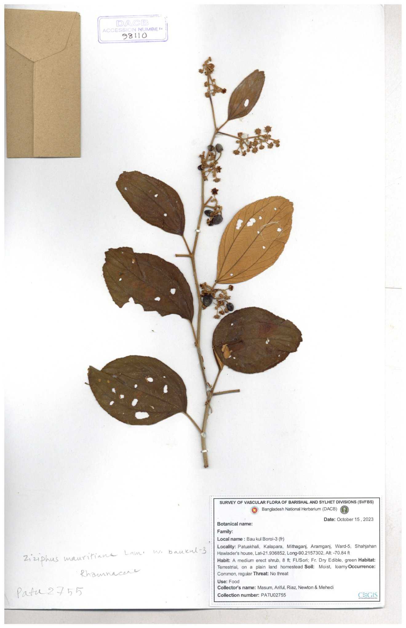 | 65811 | Rhamnaceae | Ziziphus sp. | Unknown | Naimur Rahman | NR- 1445 02-12-2020 |