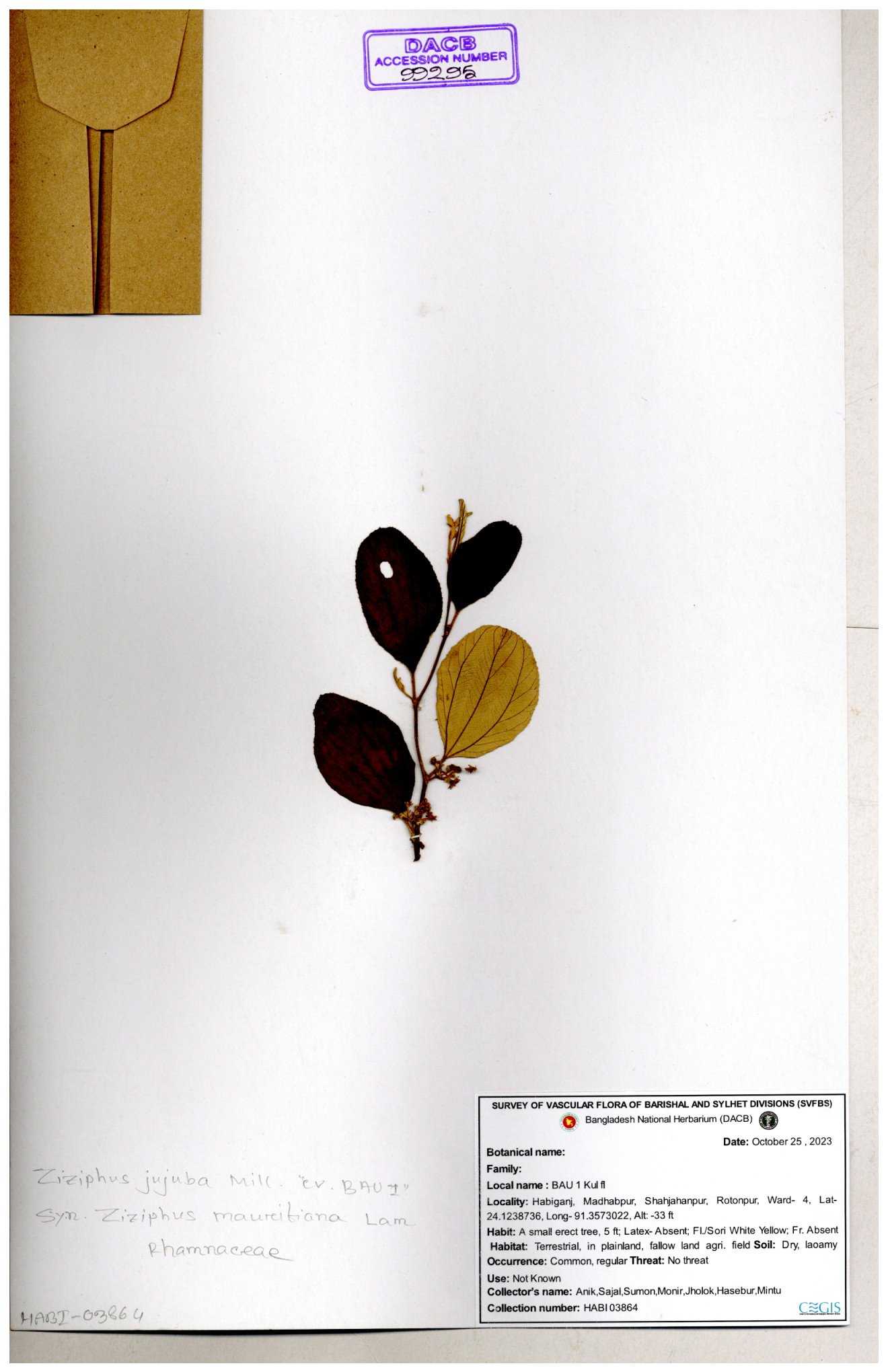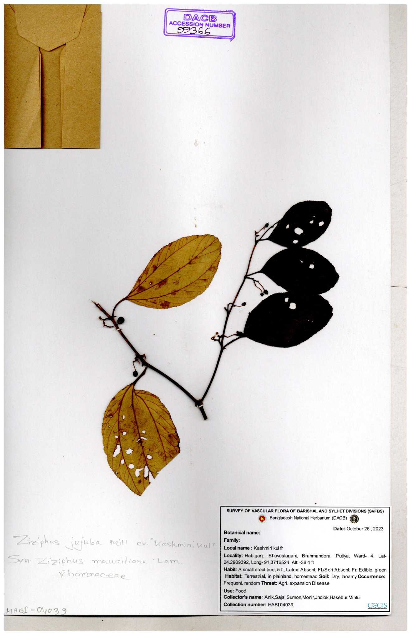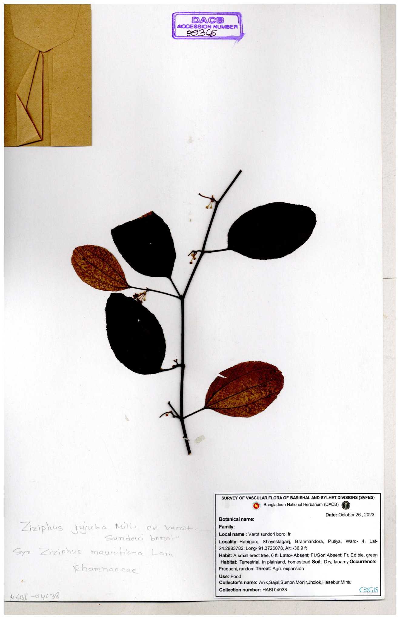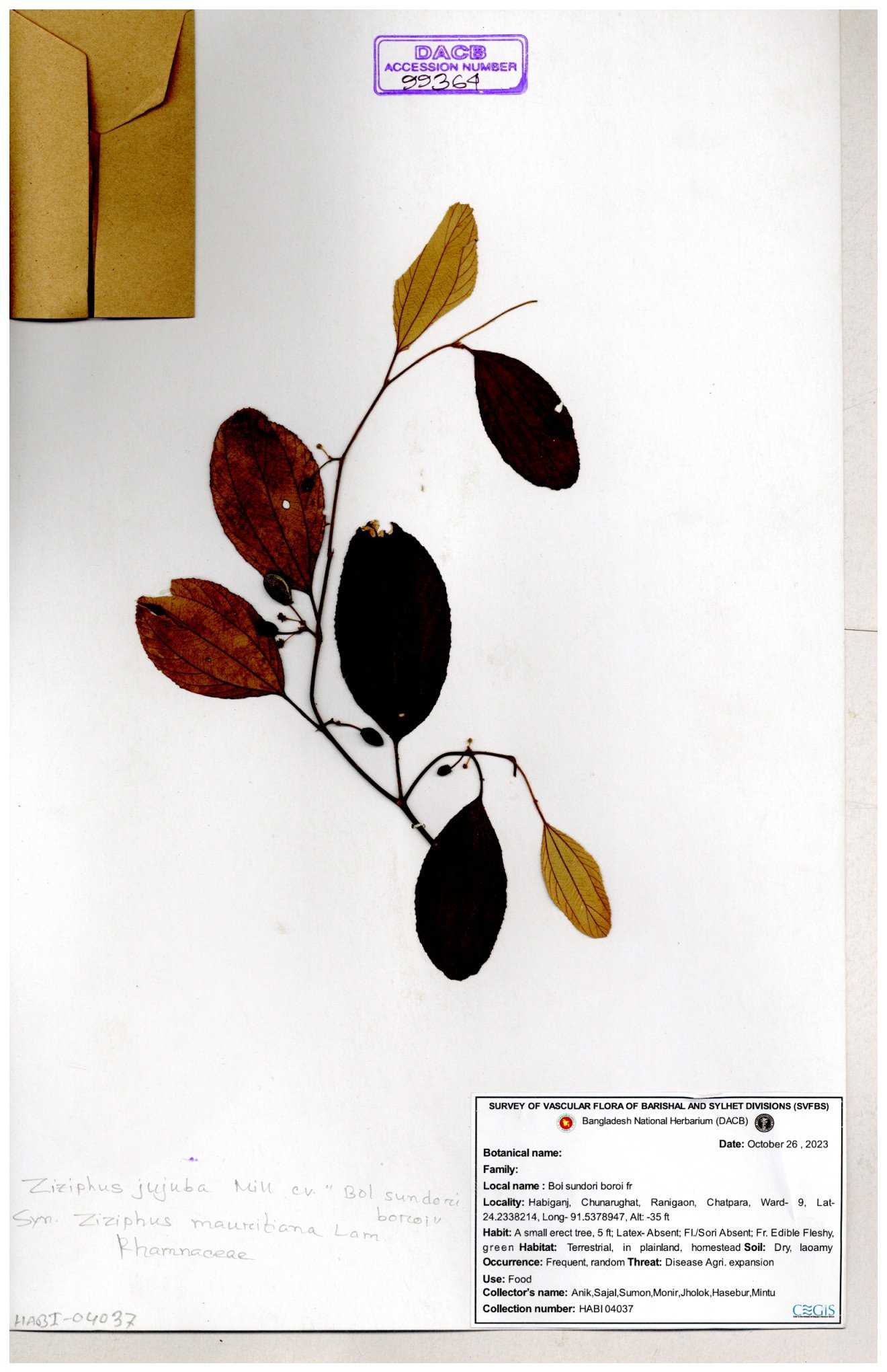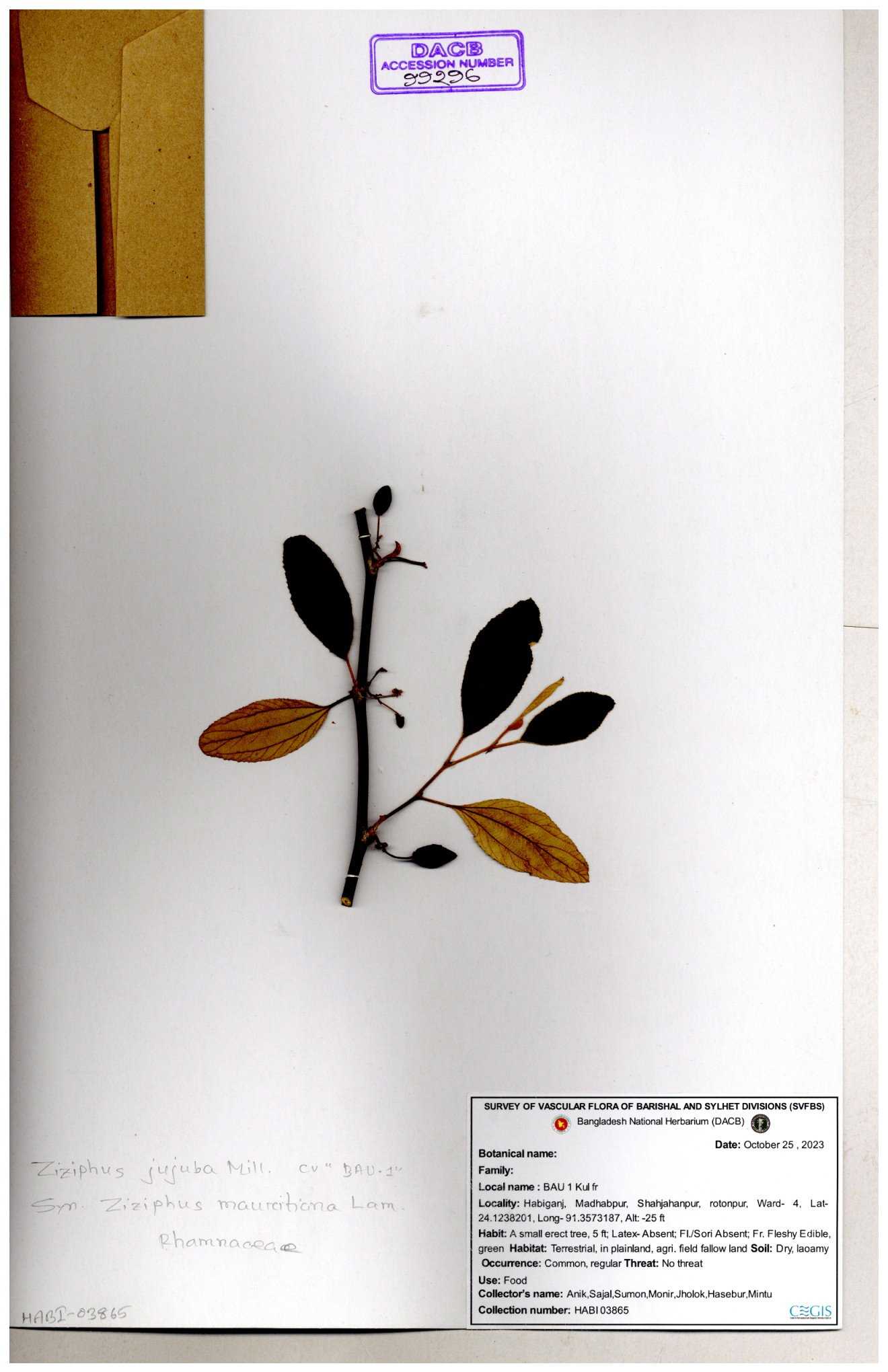| 65262 | Rhamnaceae | Ziziphus jujuba | Boroi | Niyamul Kabir, Jahid Hasan & Mehedi Hasan | NK-725 09-10-2016 |