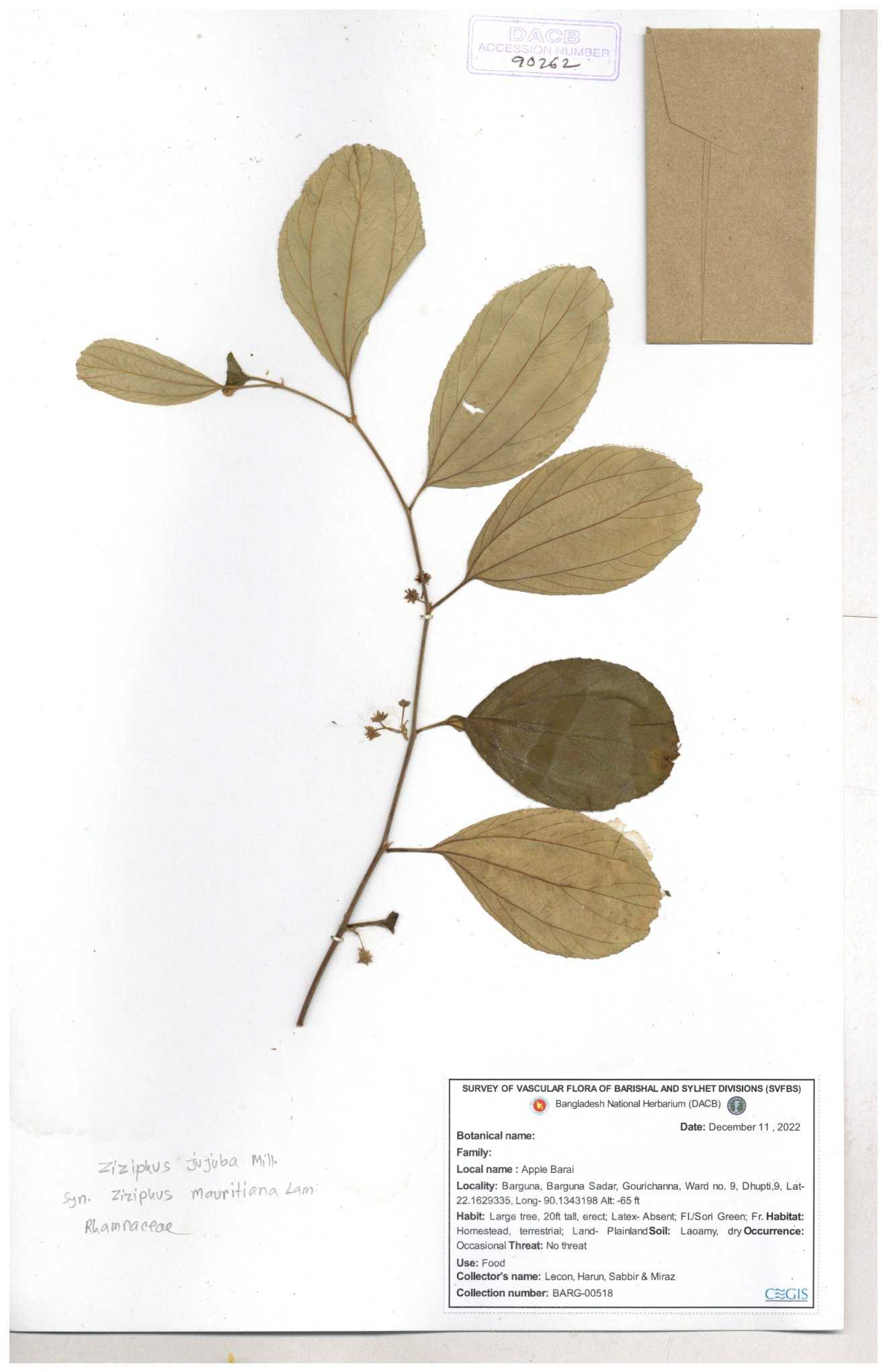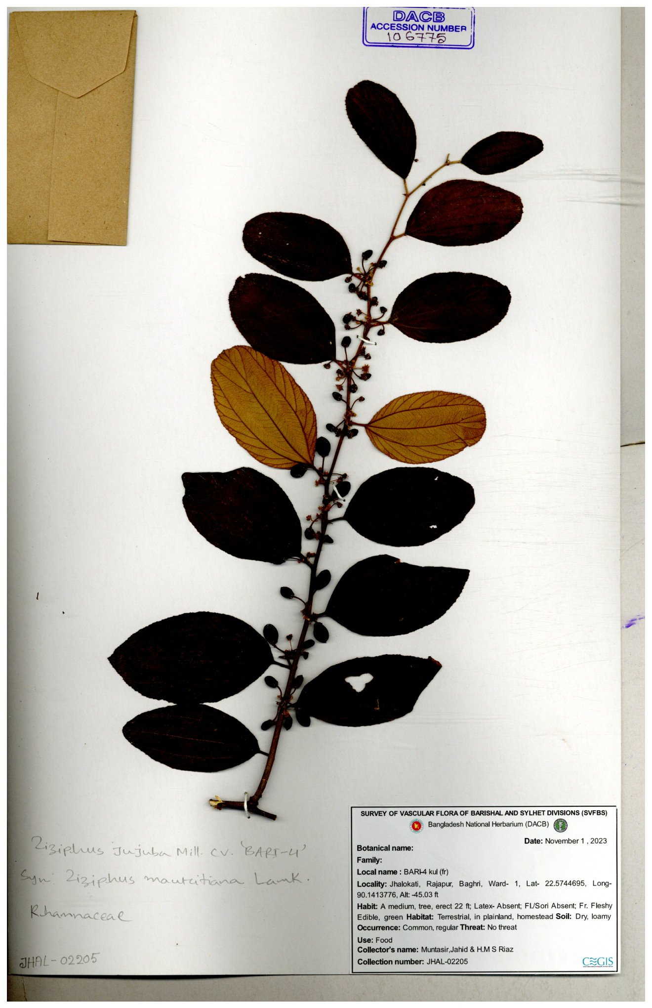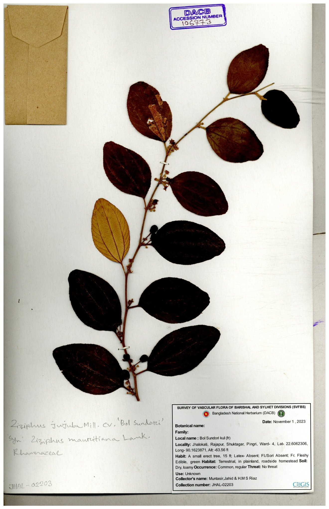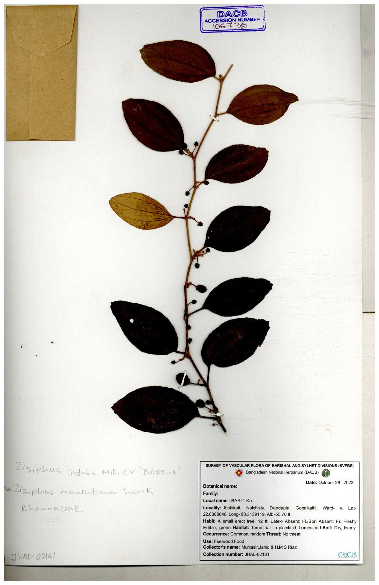 | 64956 | Rhamnaceae | Ziziphus jujuba Mill. | Mominur Rahman, Al amin & Kamrul Islam | JCR-1150 11-10-2016 |