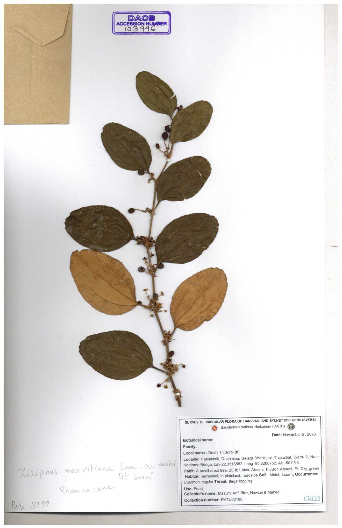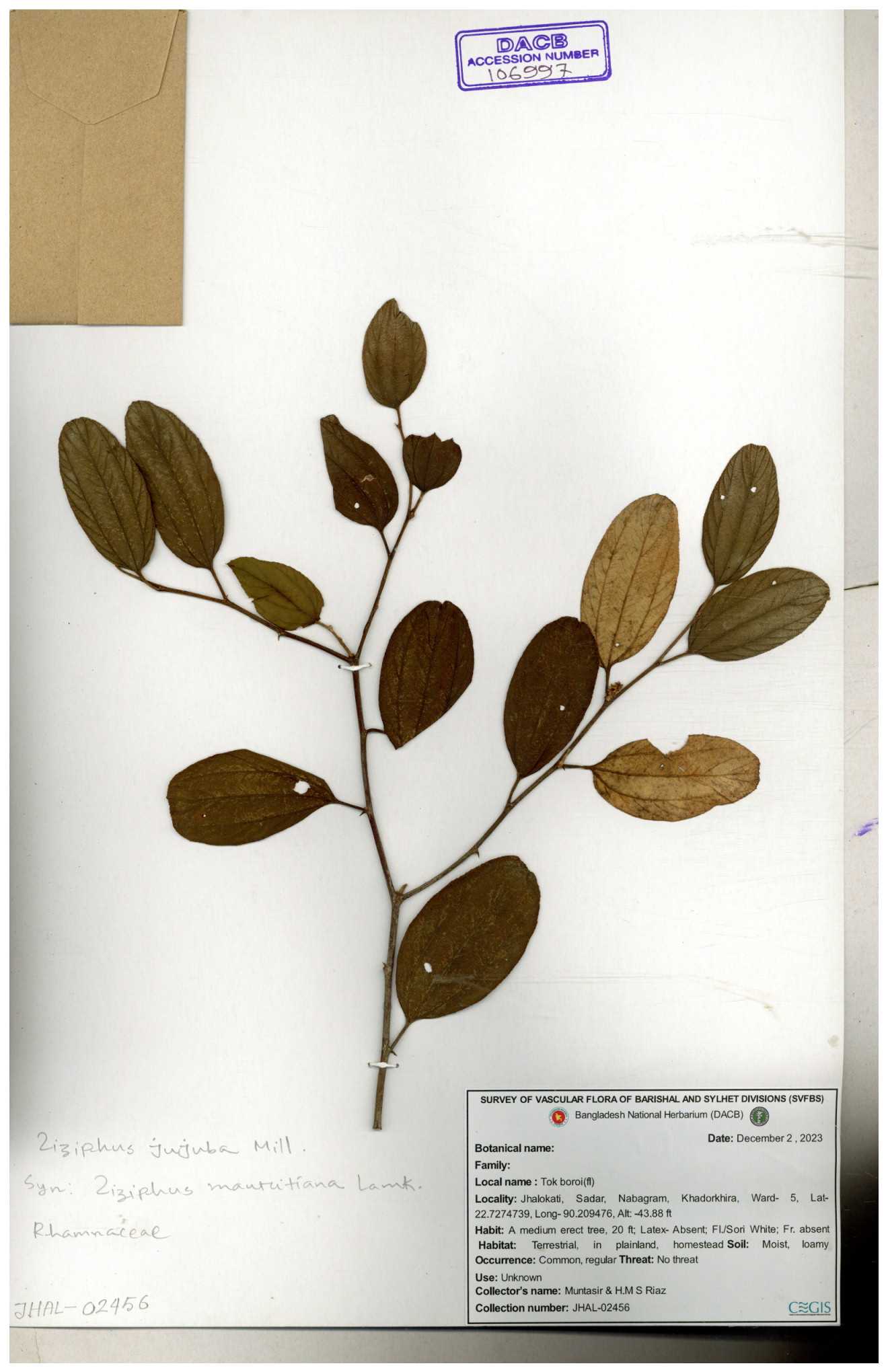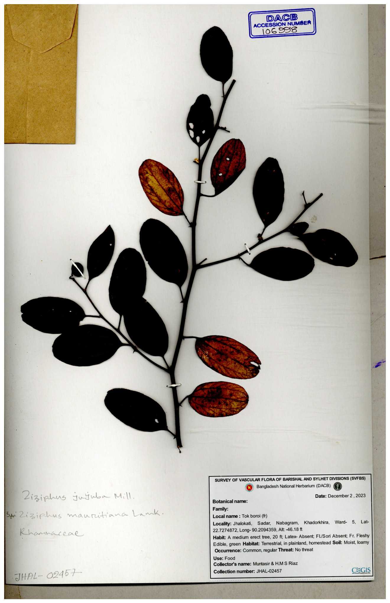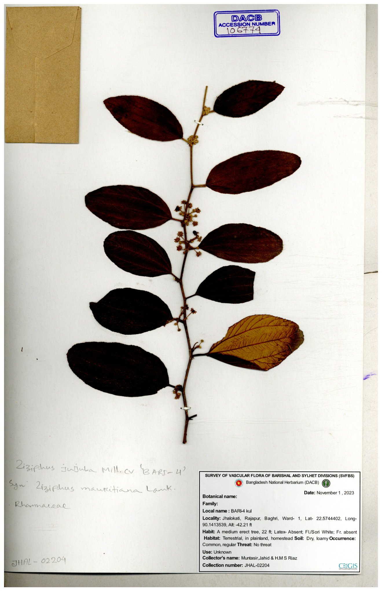 | 64956 | Rhamnaceae | Ziziphus jujuba Mill. | Mominur Rahman, Al amin & Kamrul Islam | JCR-1150 11-10-2016 |