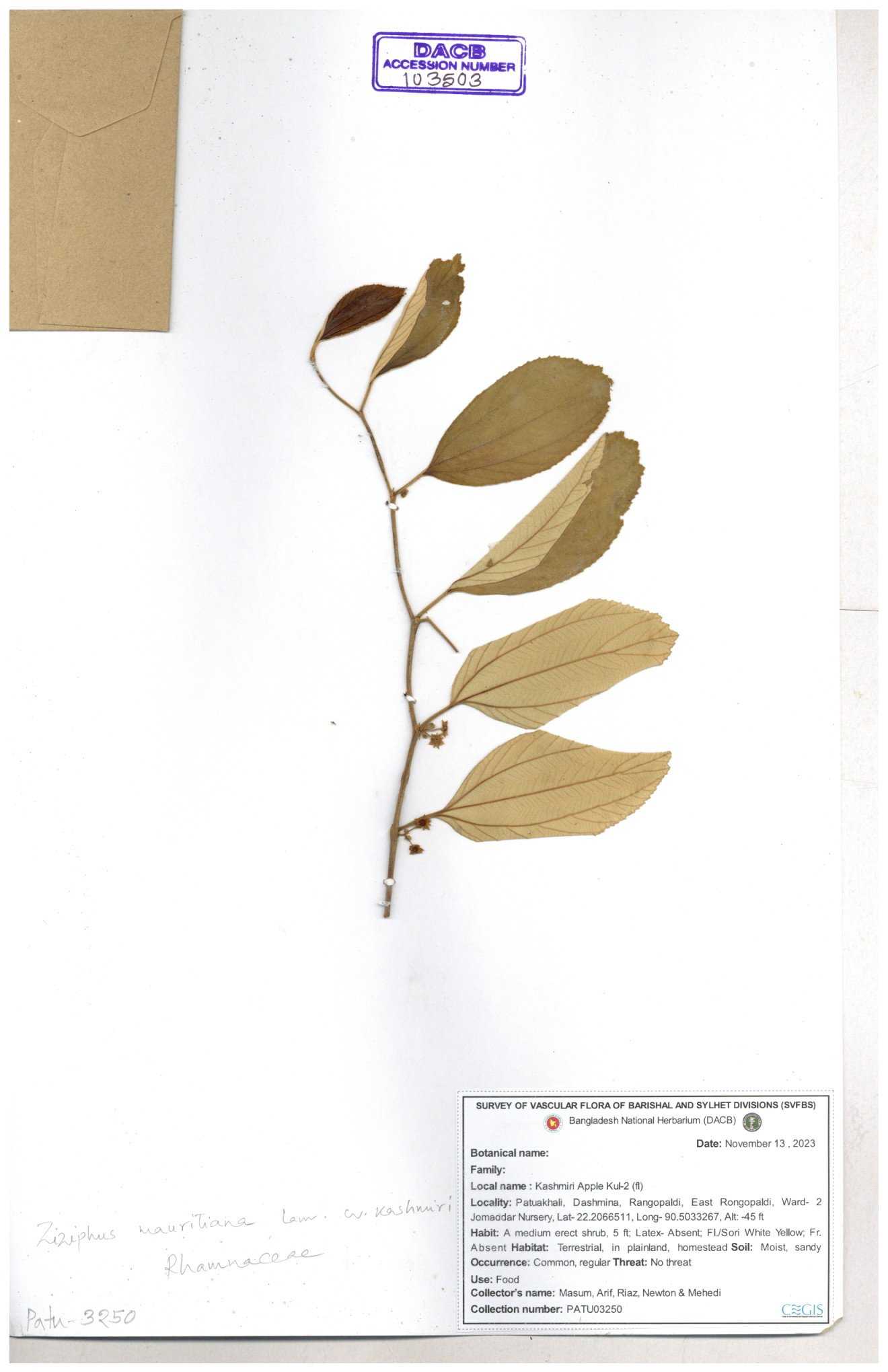 | 47707 | Rhamnaceae | Ziziphus jujuba | Khandakar Kamrul Islam | KKI-1541 12-11-2017 |