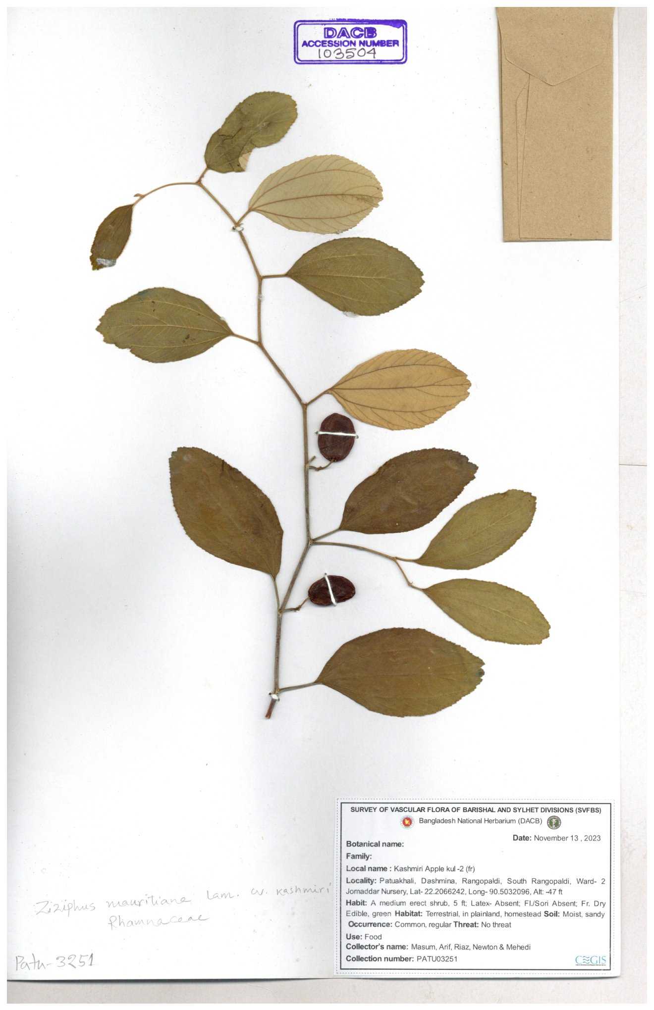 | 64862 | Rhamnaceae | Ziziphus jujuva Mill. | Ahmed Saqee & DR. Mahbuba Sultana | ASQ-104 14-10-2019 |