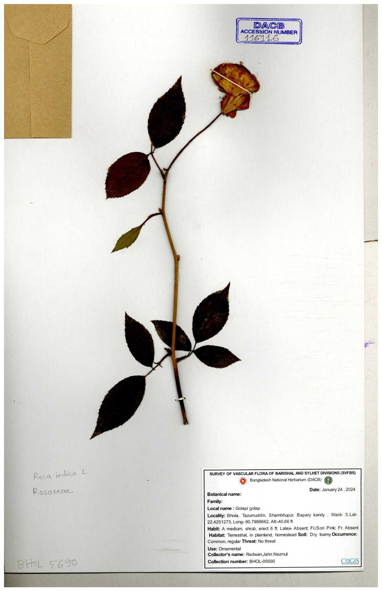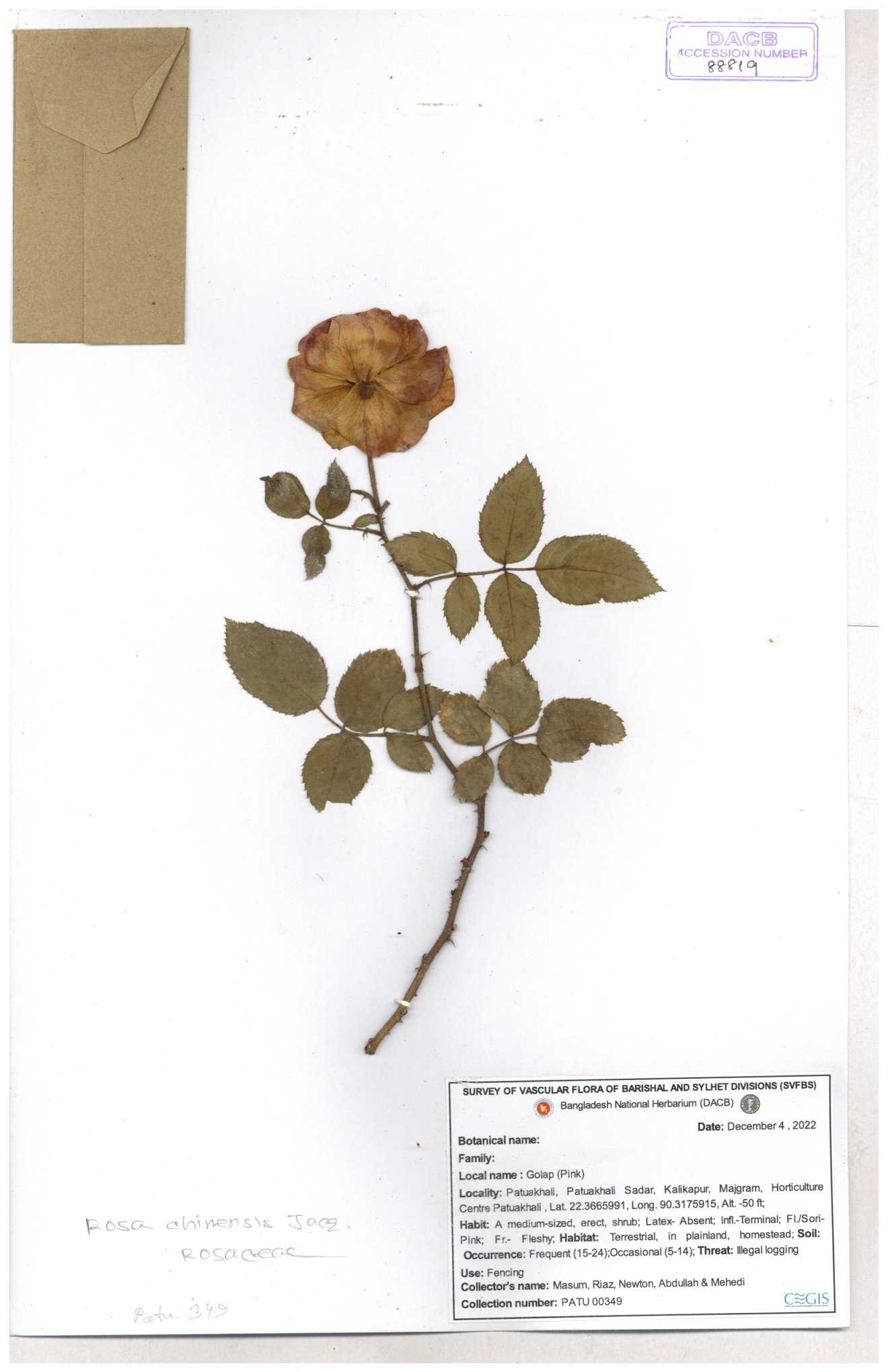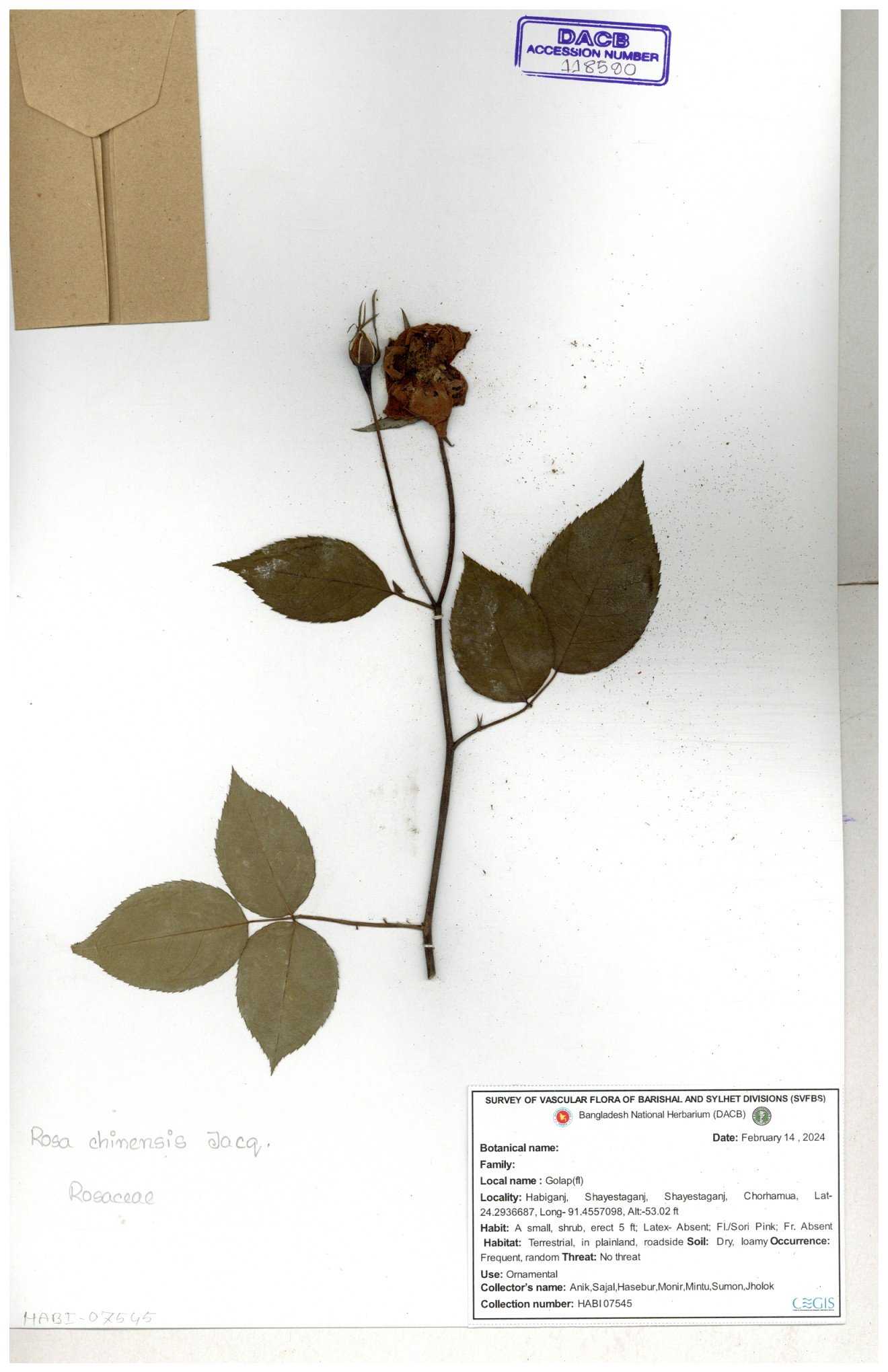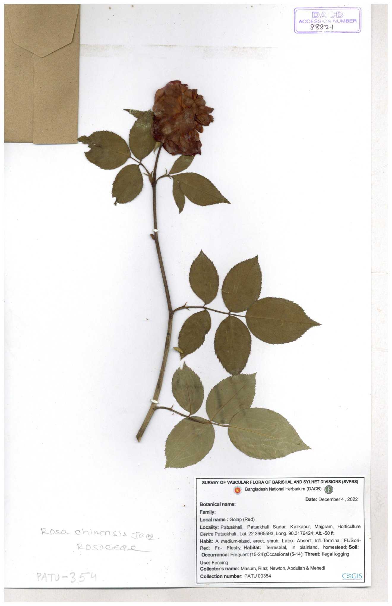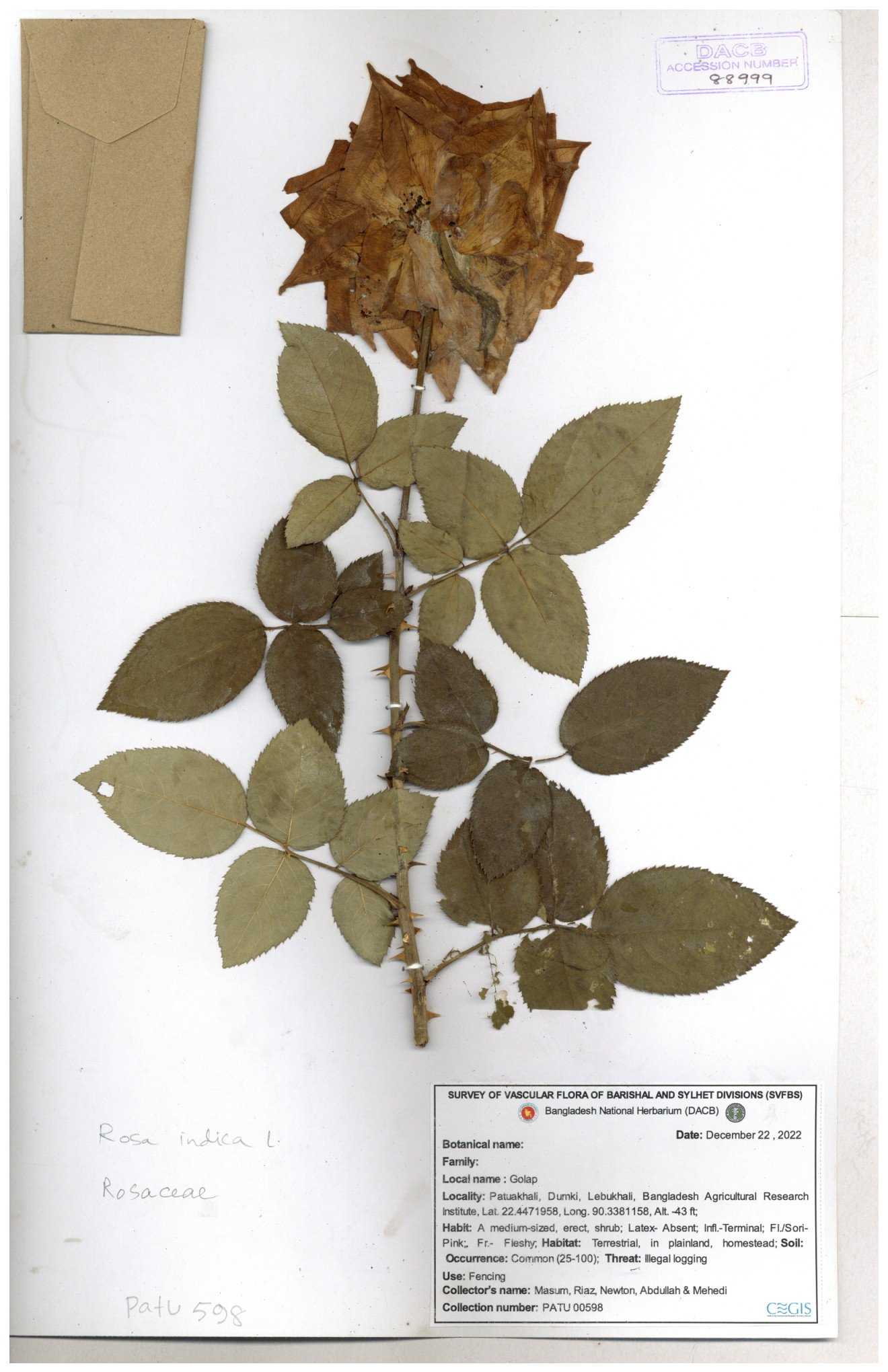 | 8452 | Rosaceae | Rosa indica | Rezia Khatun et al | RK. 490 15-02-1989 |
