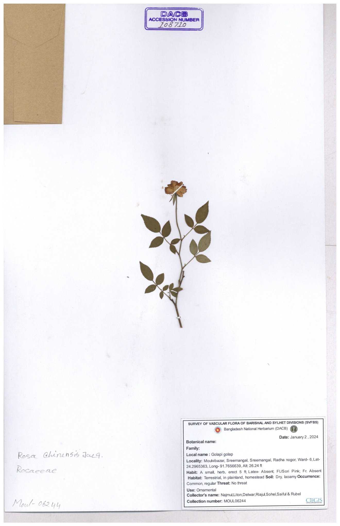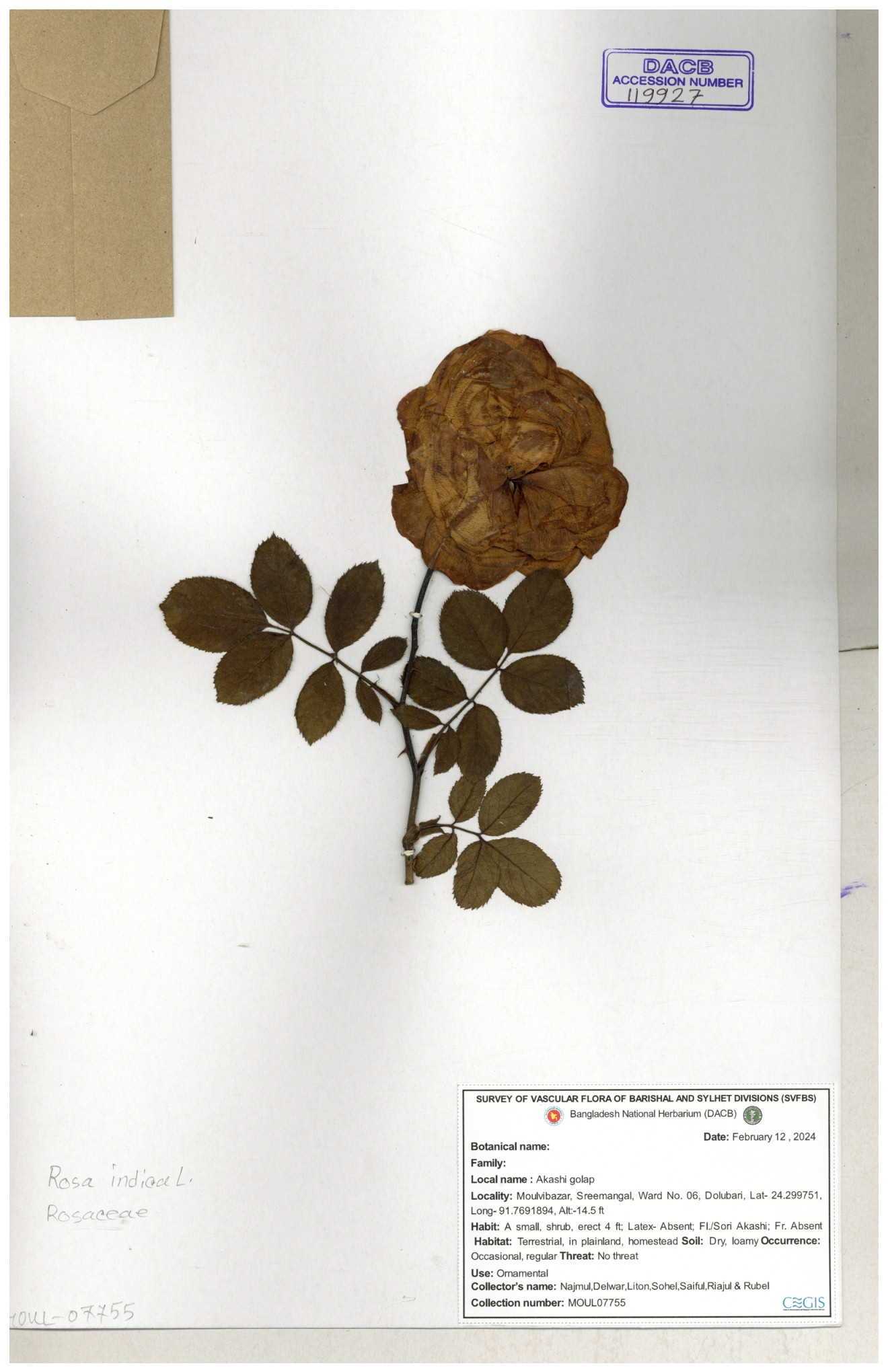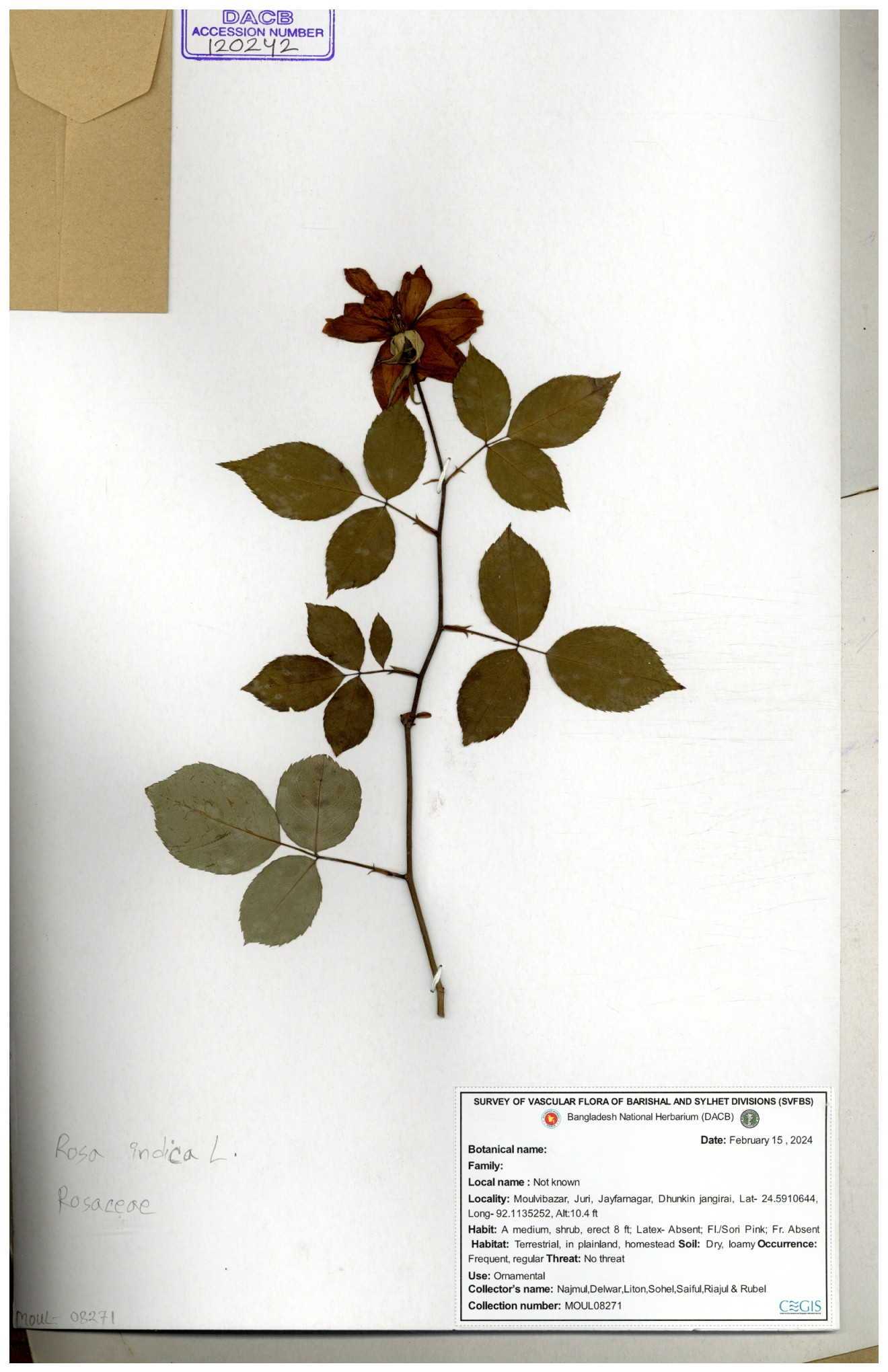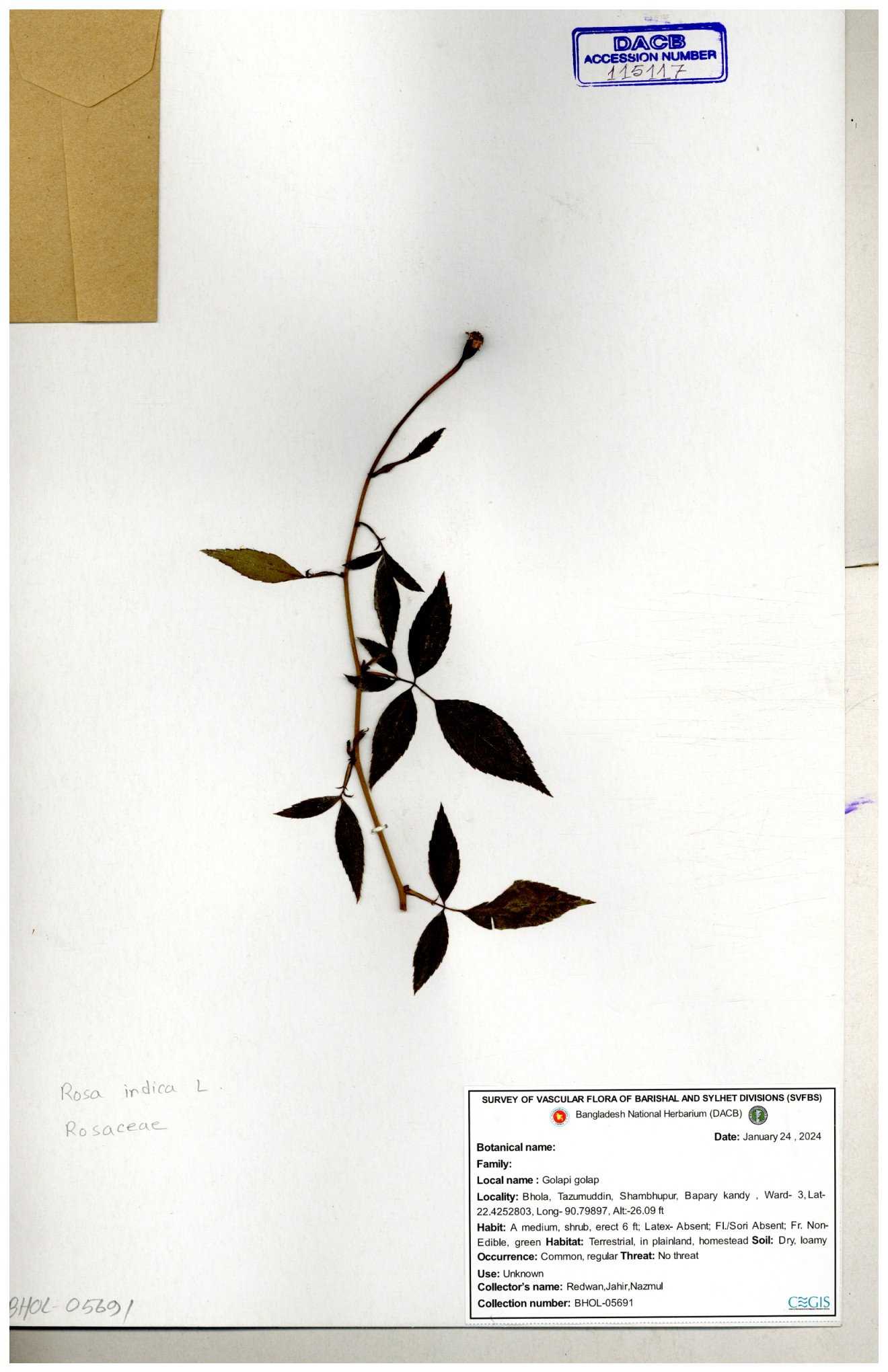 | 8452 | Rosaceae | Rosa indica | Rezia Khatun et al | RK. 490 15-02-1989 |