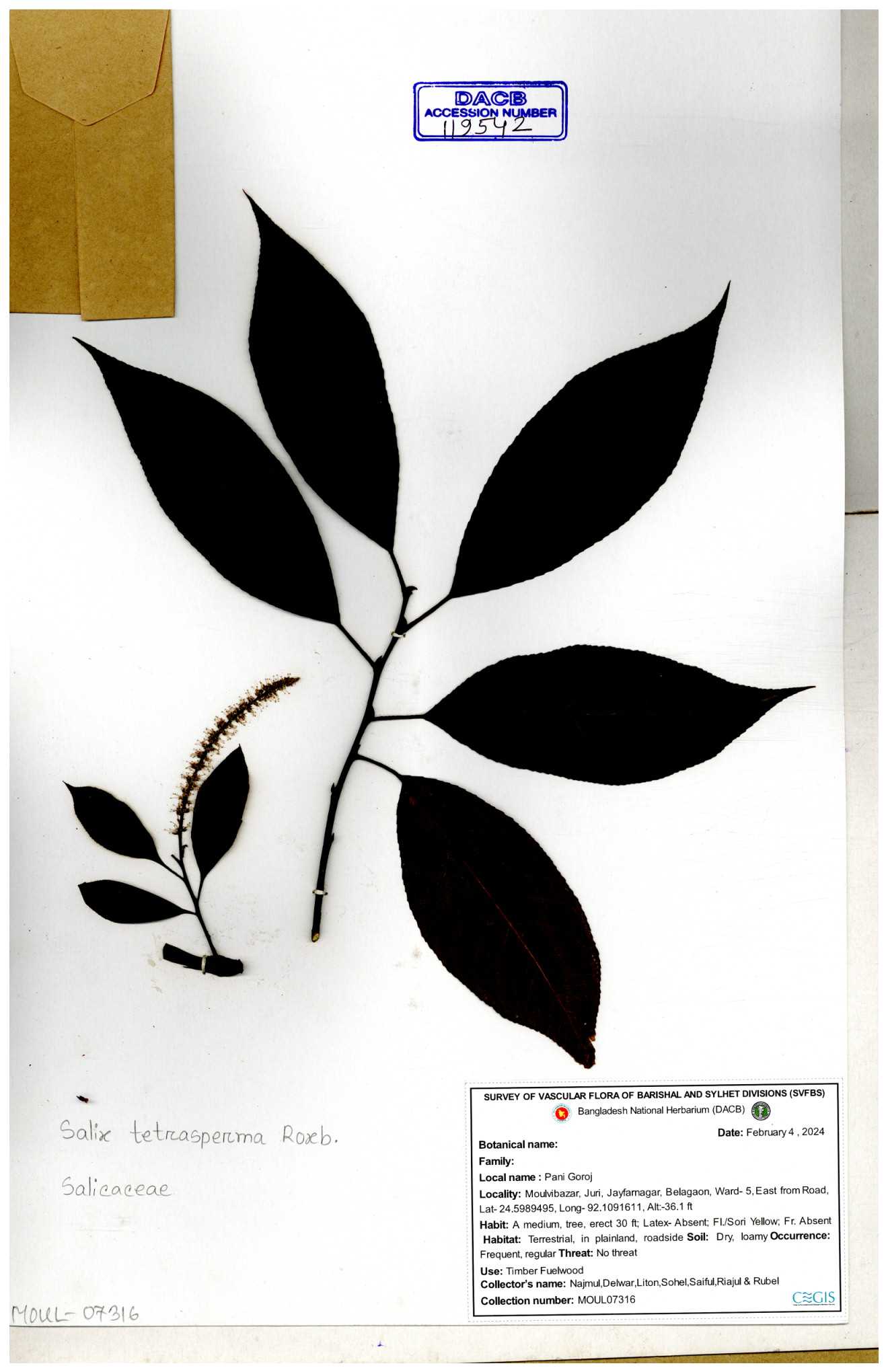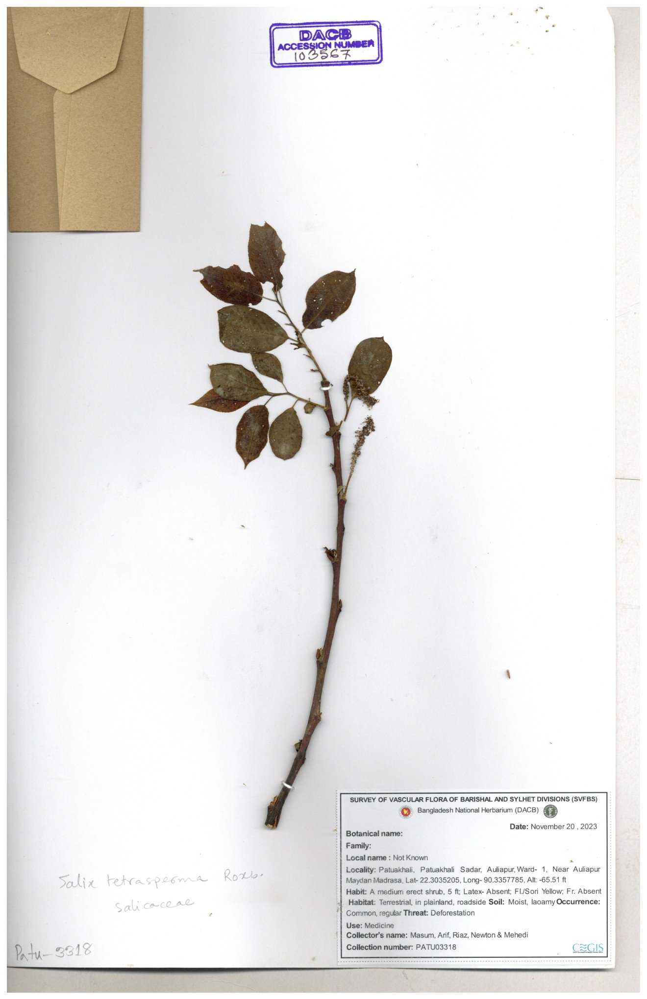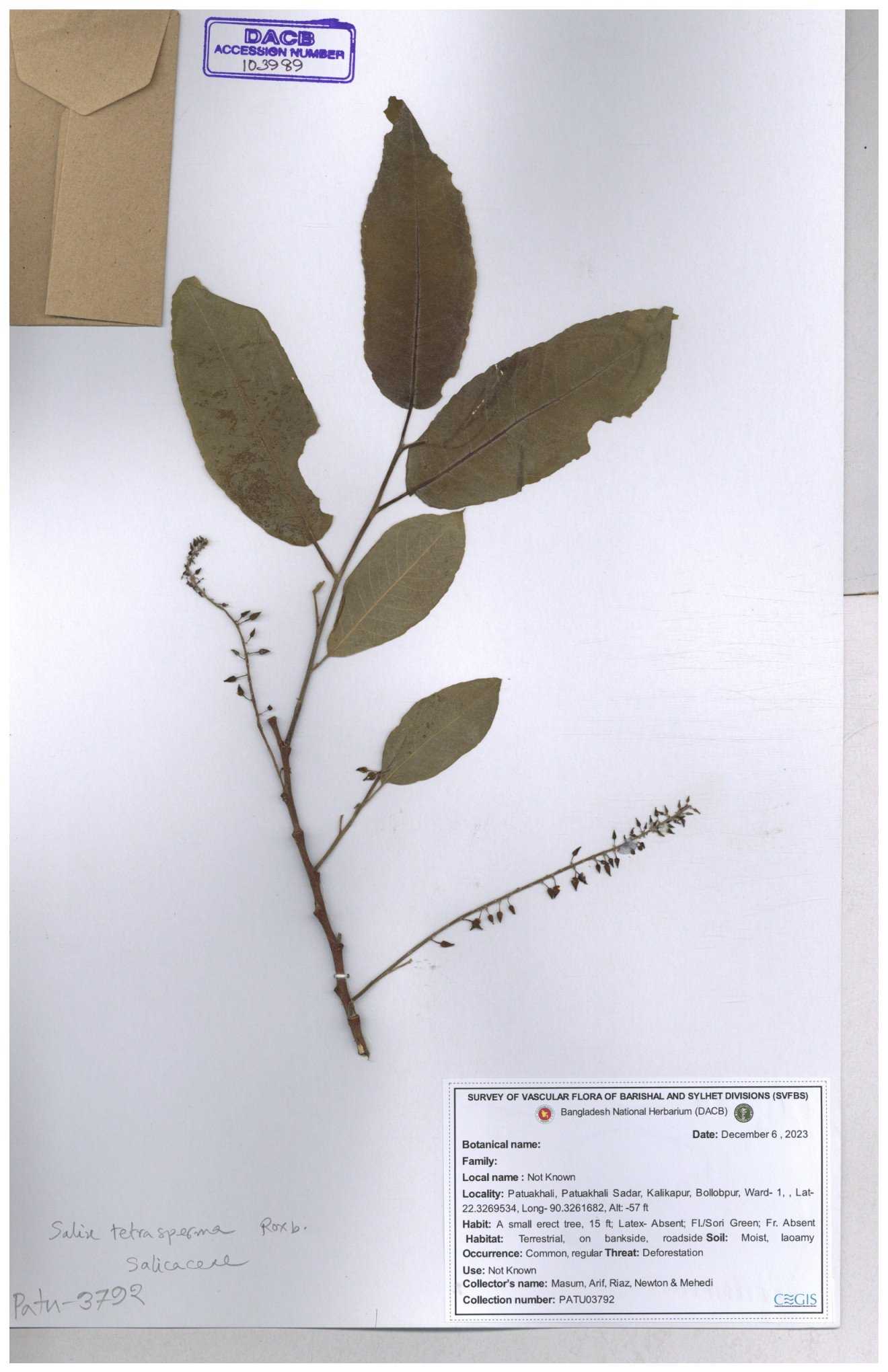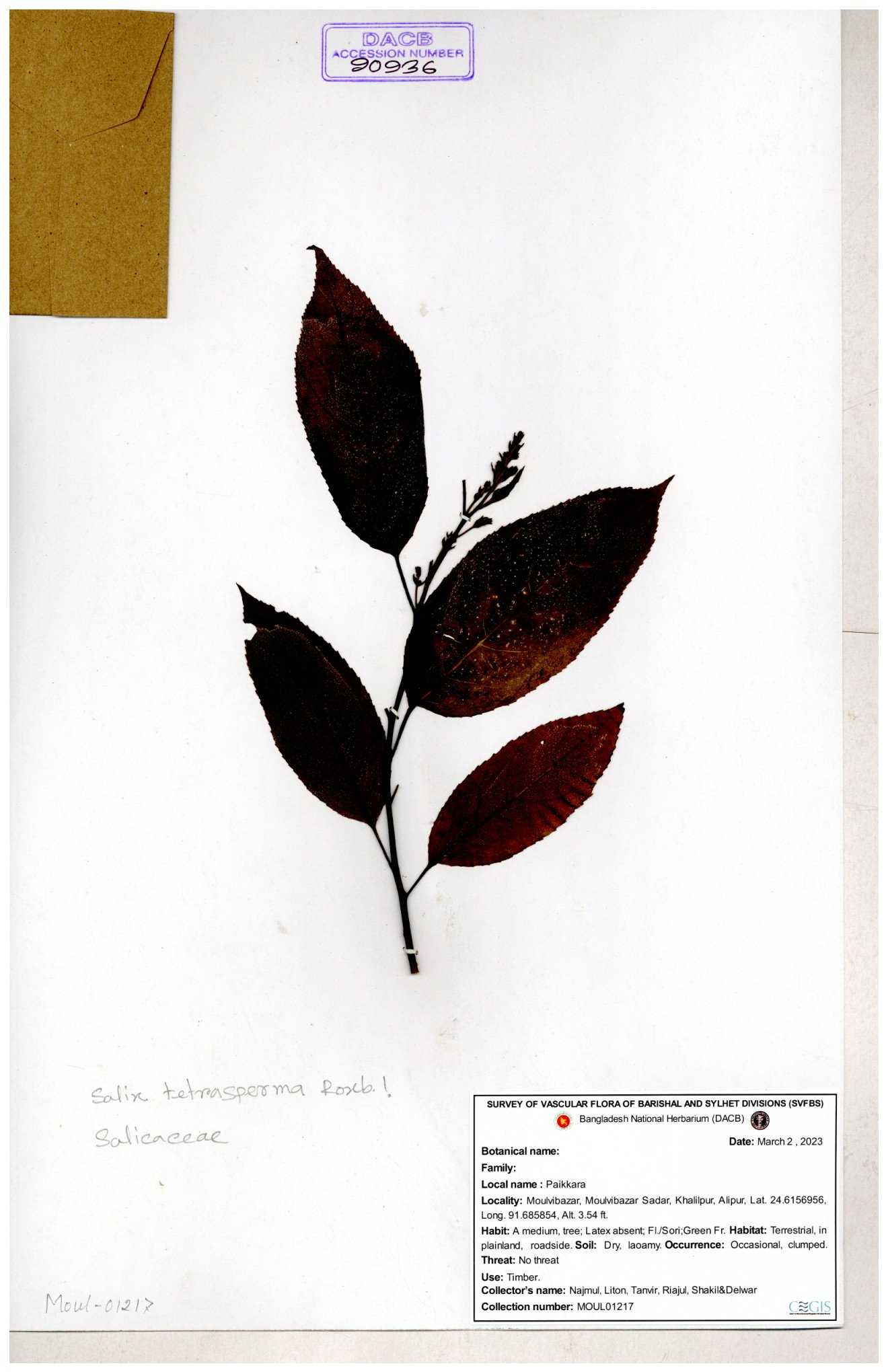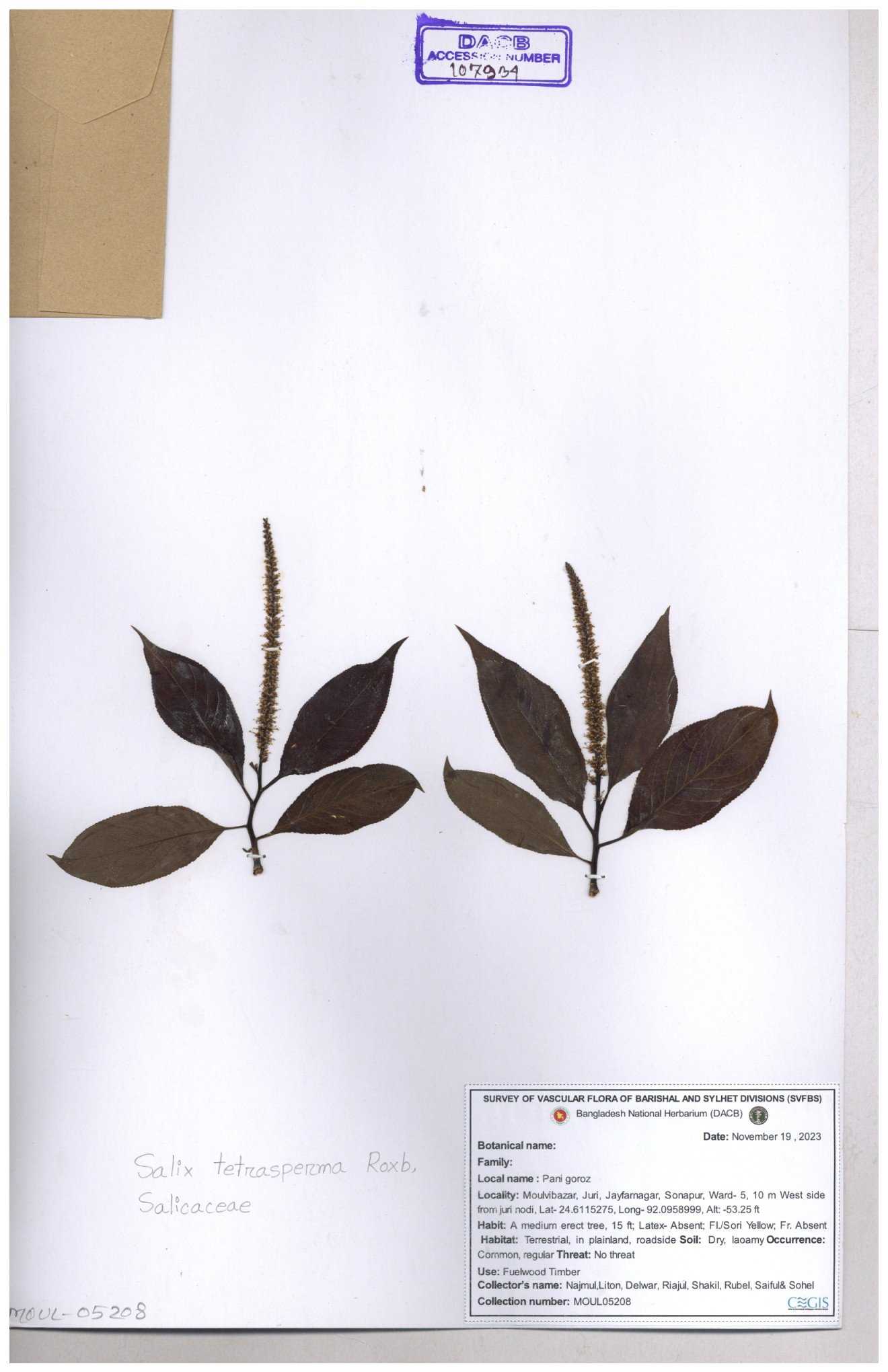 | 84948 | Salicaceae | Solea tetrasposma Lour. | Md. Moniruzzaman, Al-Amin & Kawsar. | MAK-6766 06-12-2017 |