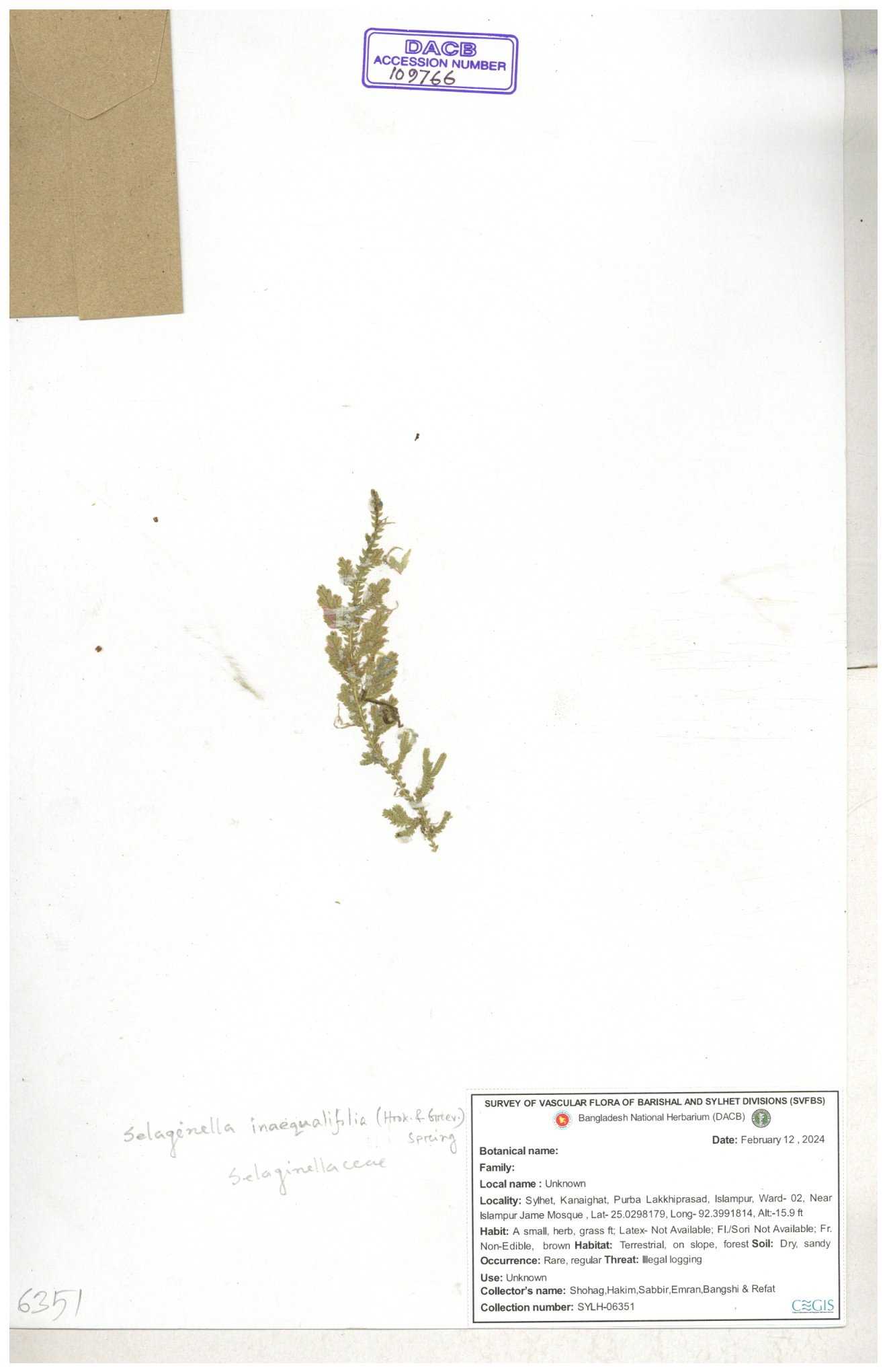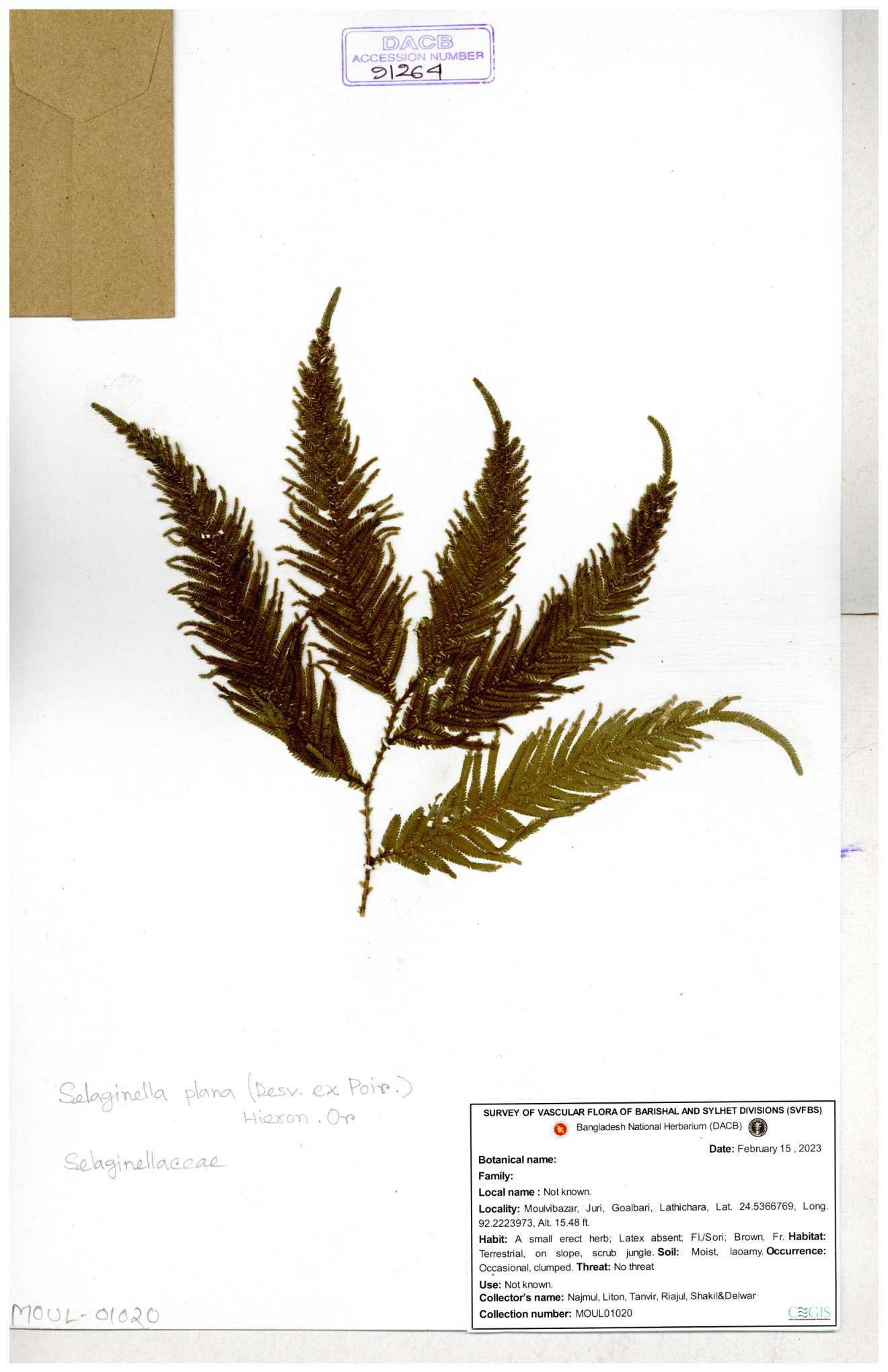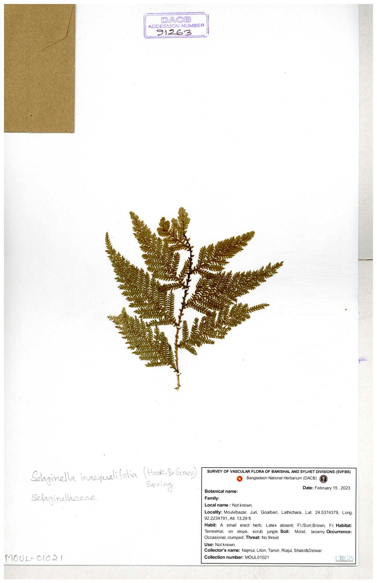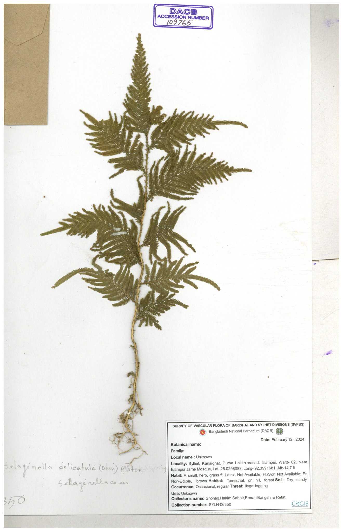 | 65734 | Selaginellaceae | Selaginella repanda (Desv. ex Poir.) Spring | Joyanta, Mominur, Al amin, Kamrul & Suborno | JCR-3176 14-02-2017 |