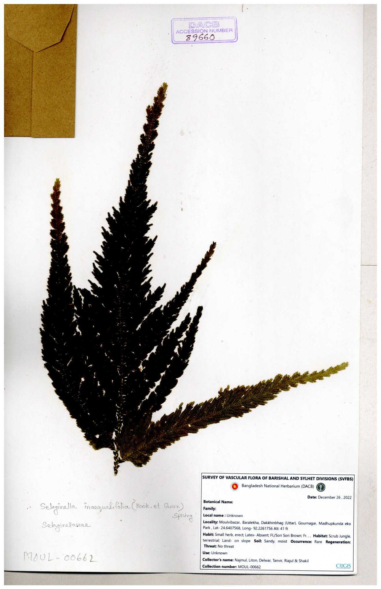 | 65733 | Selaginellaceae | Selaginella tenuissima Fée | Joyanta Chardra Roy, Kamrul Islam & Suborno Chakma | JCR-582 02-10-2016 |