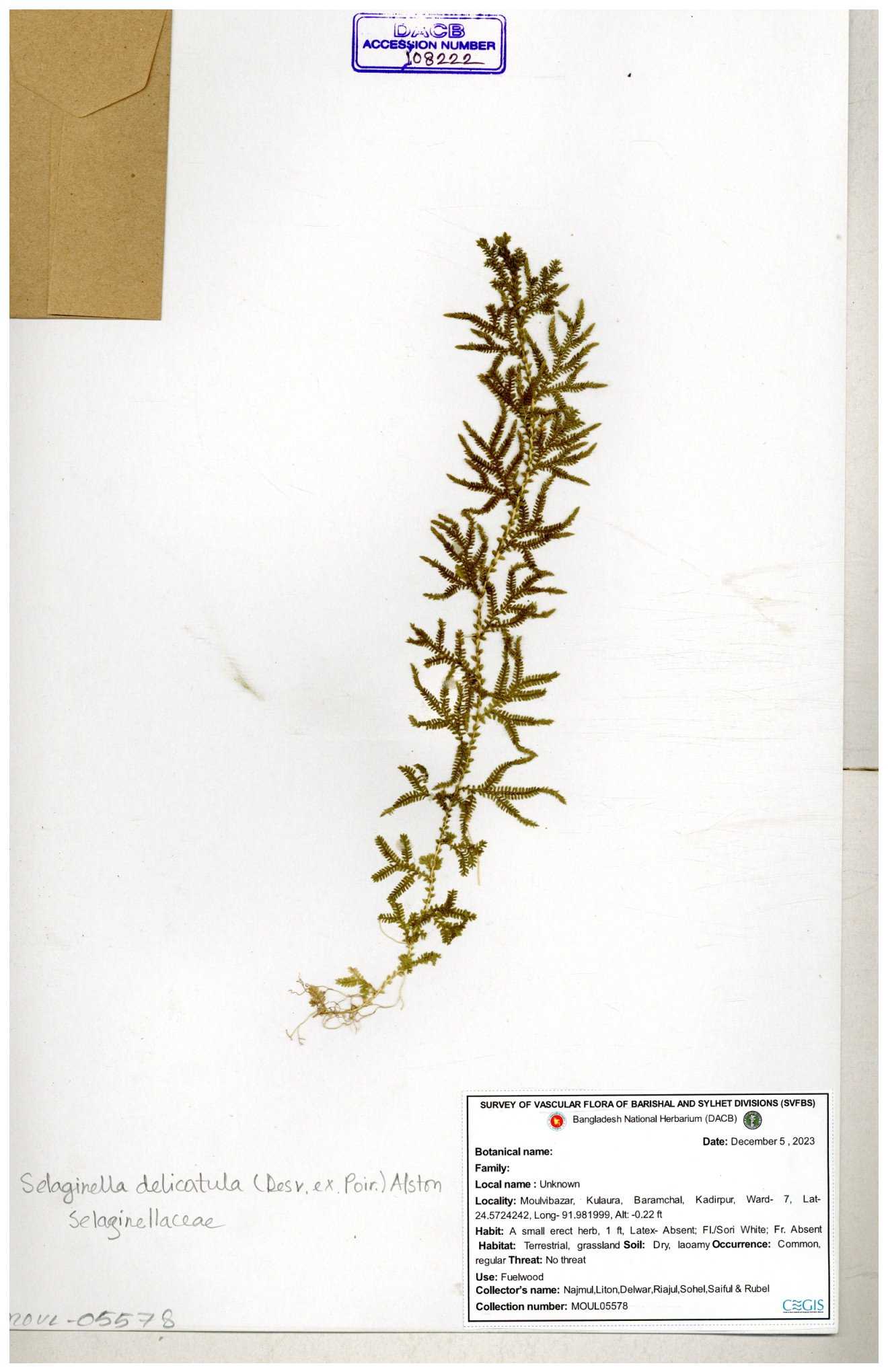 | 65732 | Selaginellaceae | Selaginella tenuissima Fée | Joyanta Chardra Roy, Raziur Rahman & Kamrul Islam | JCR-375 02-09-2016 |