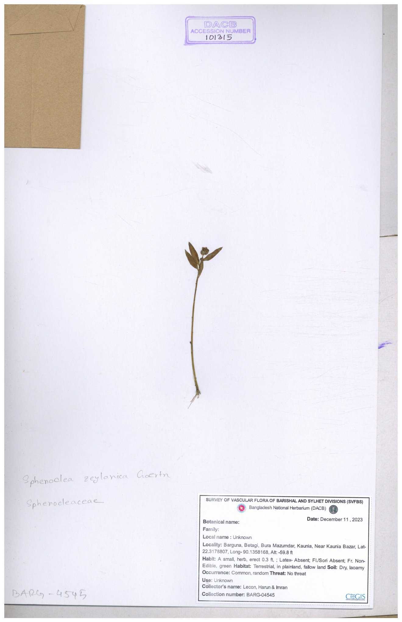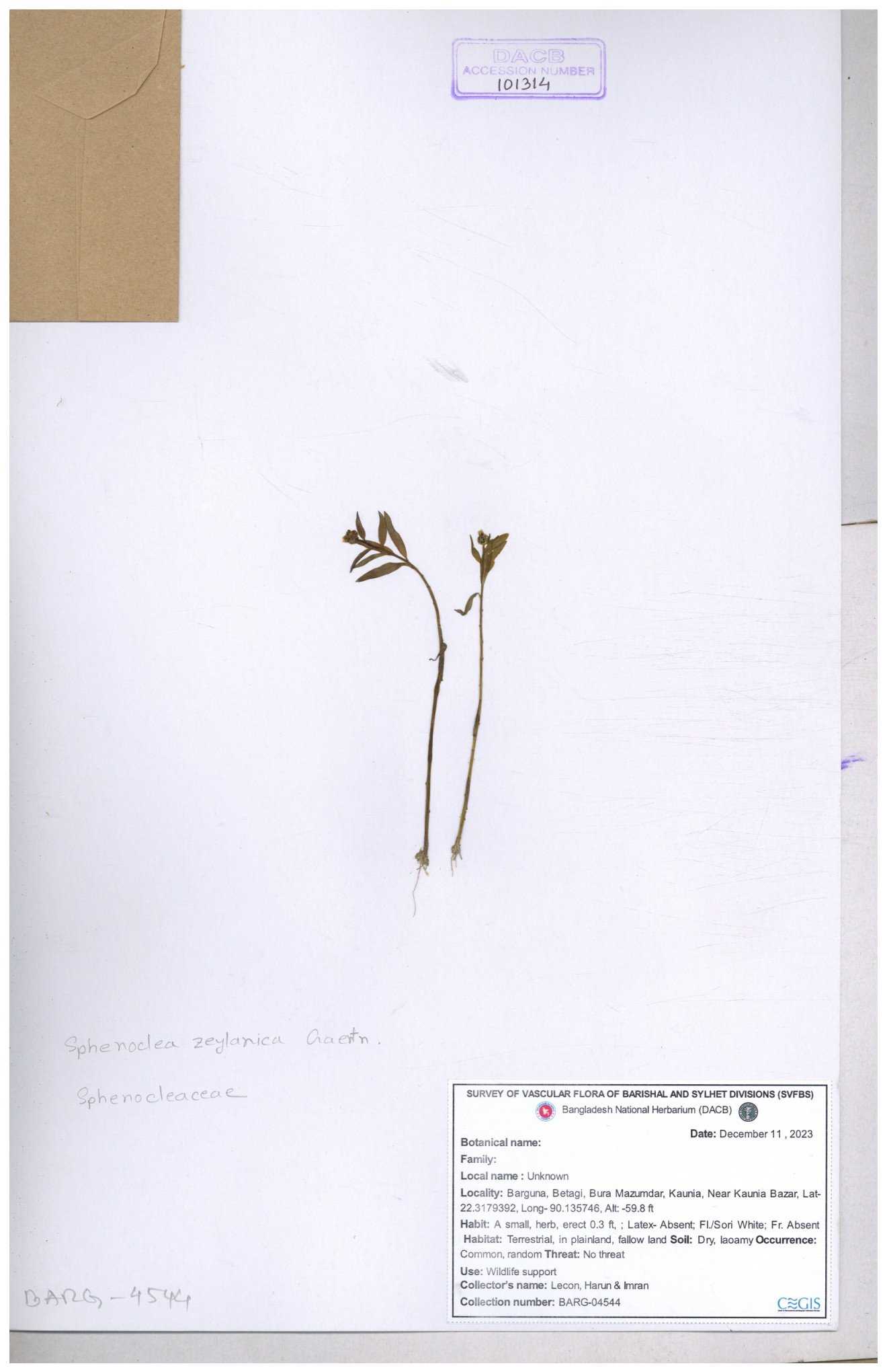 | 101314 | Sphenocleaceae | Sphenoclea zeylanica | 30-11--0001 |