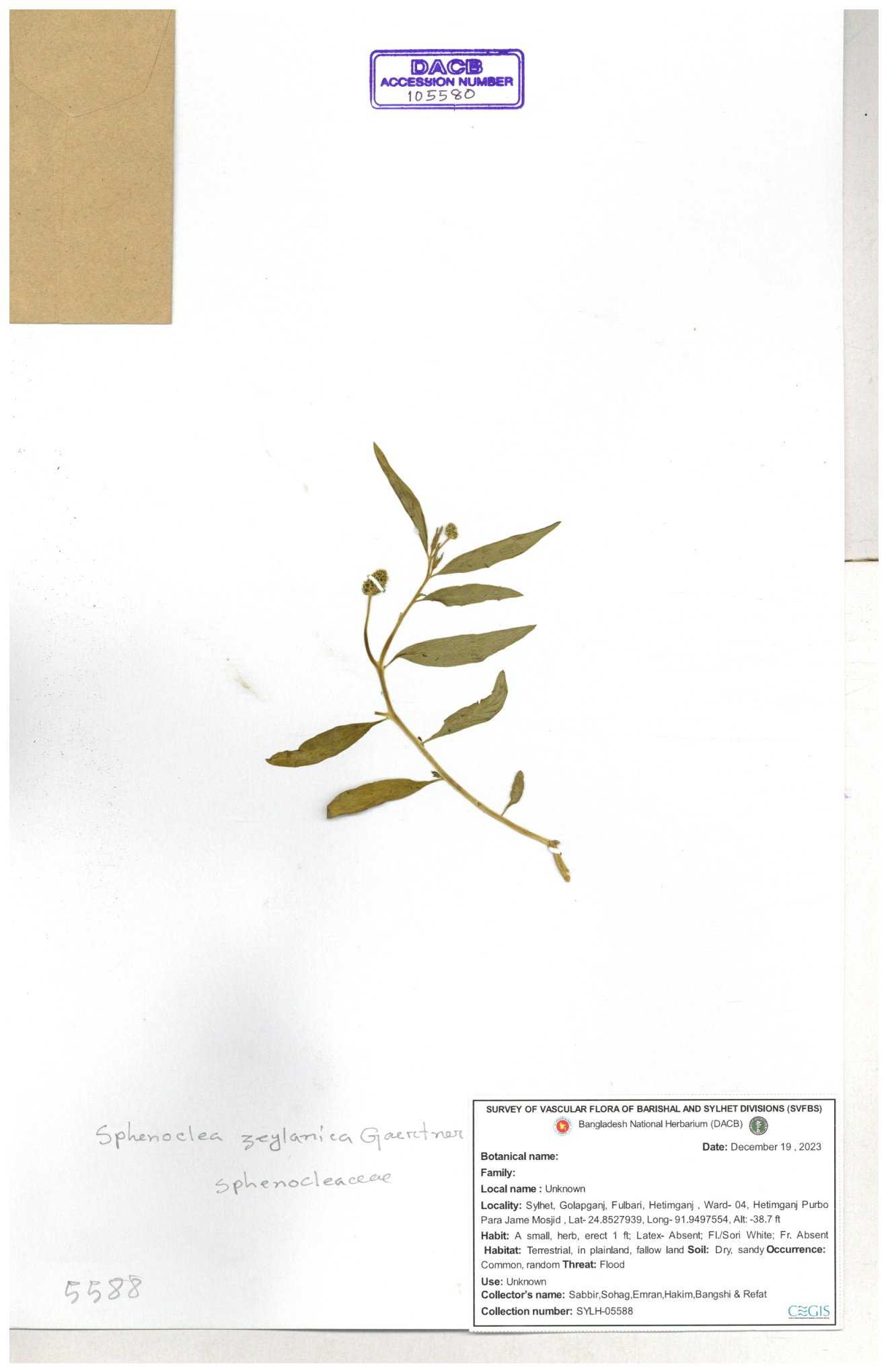 | 105580 | Sphenocleaceae | Sphenoclea zeylarica | 30-11--0001 |