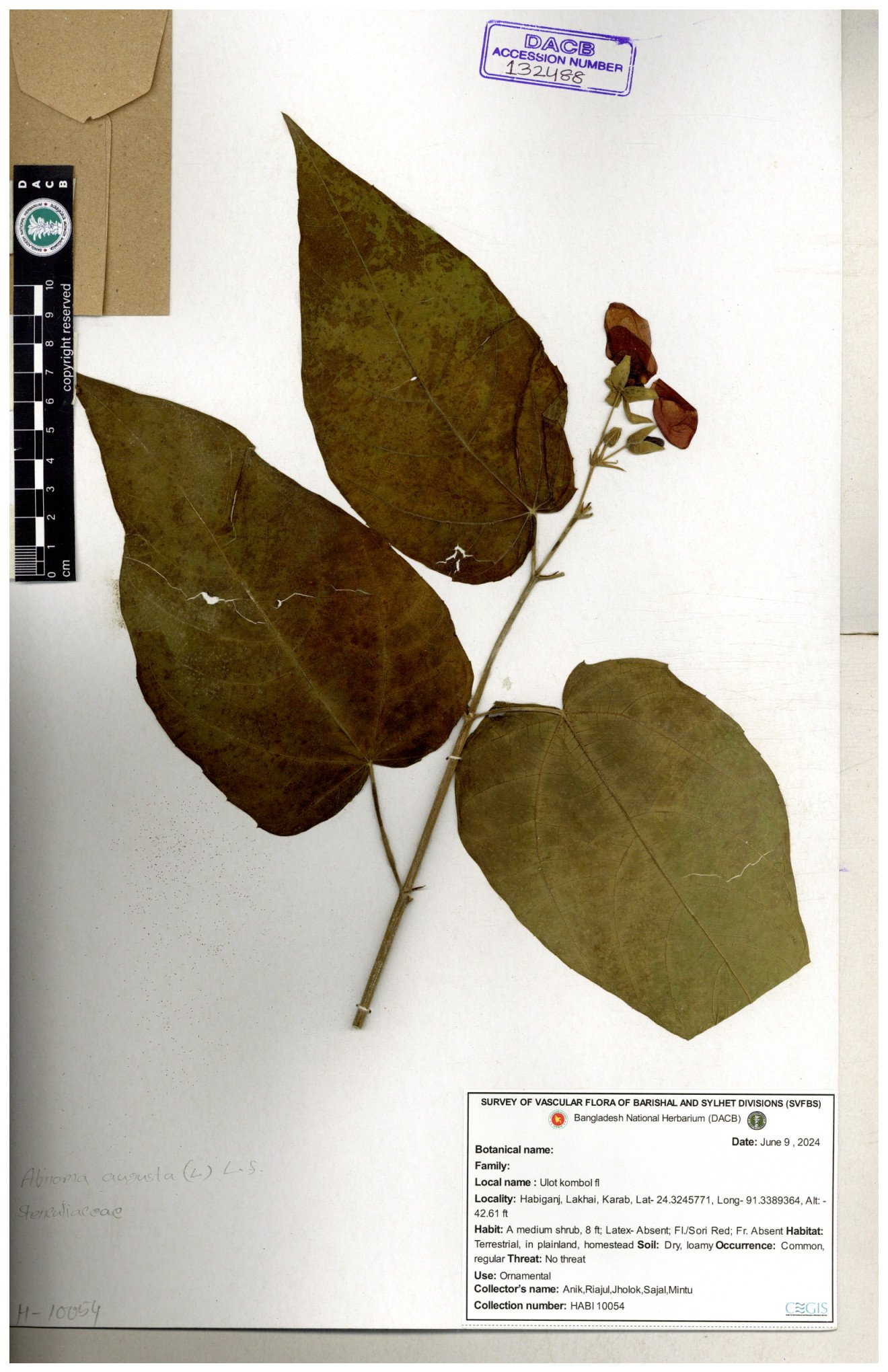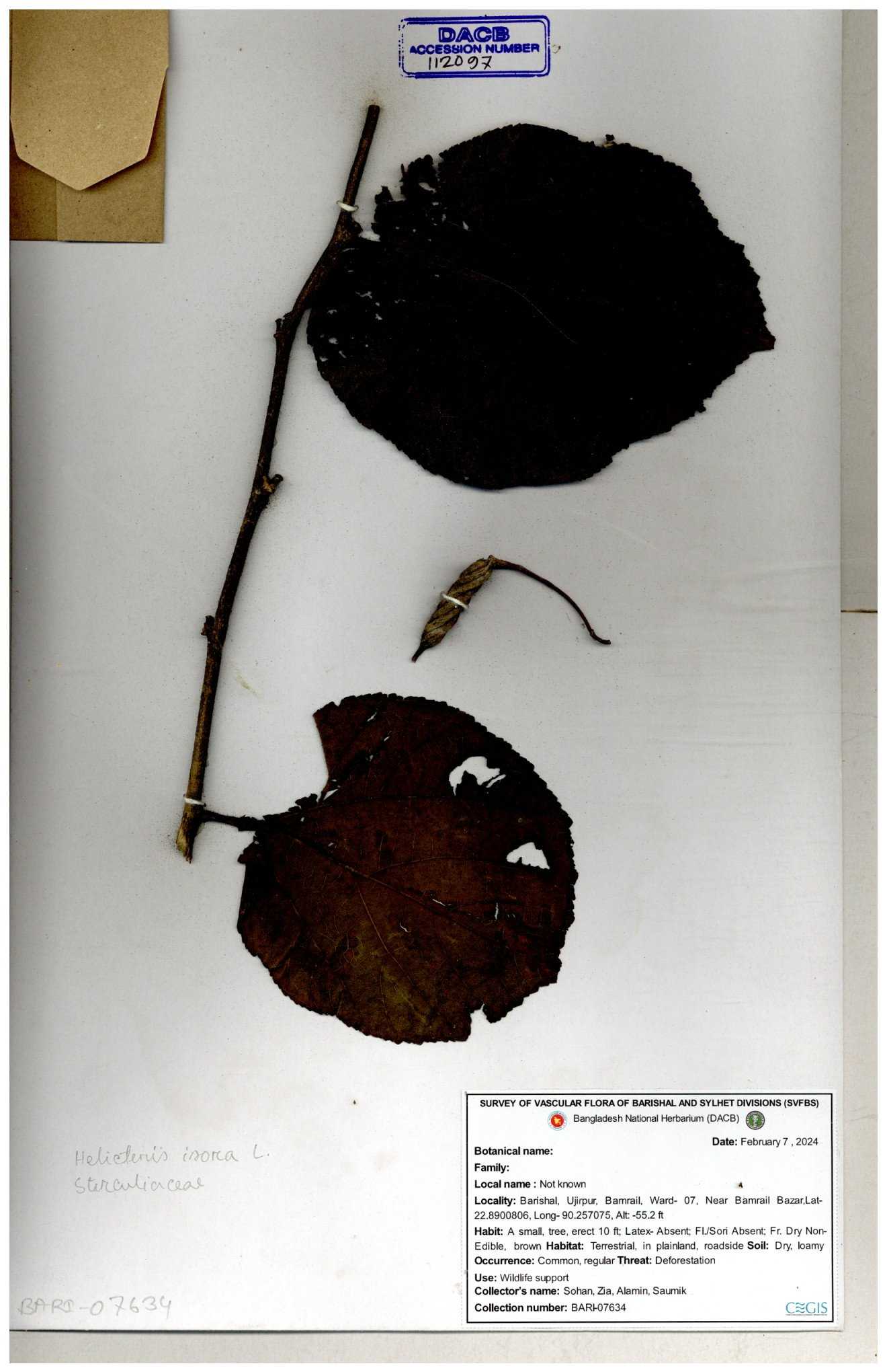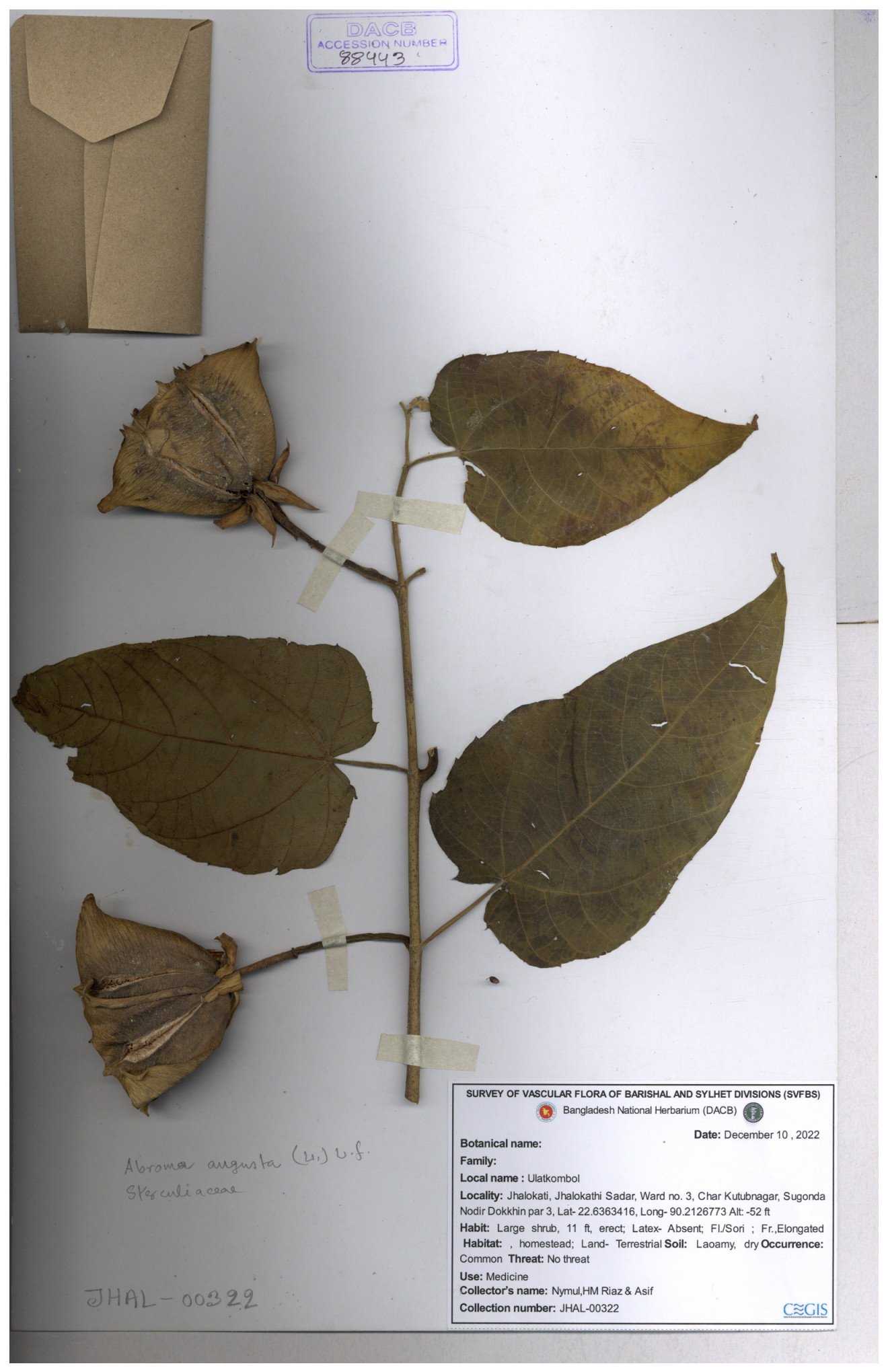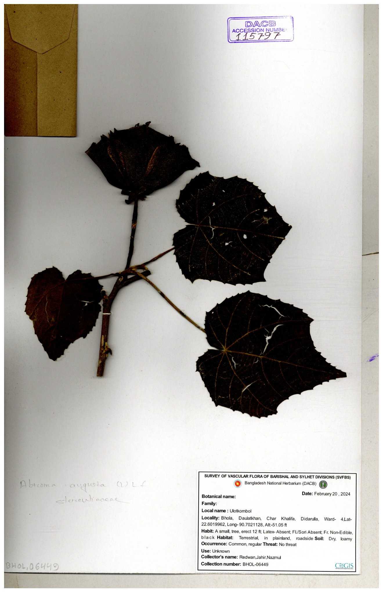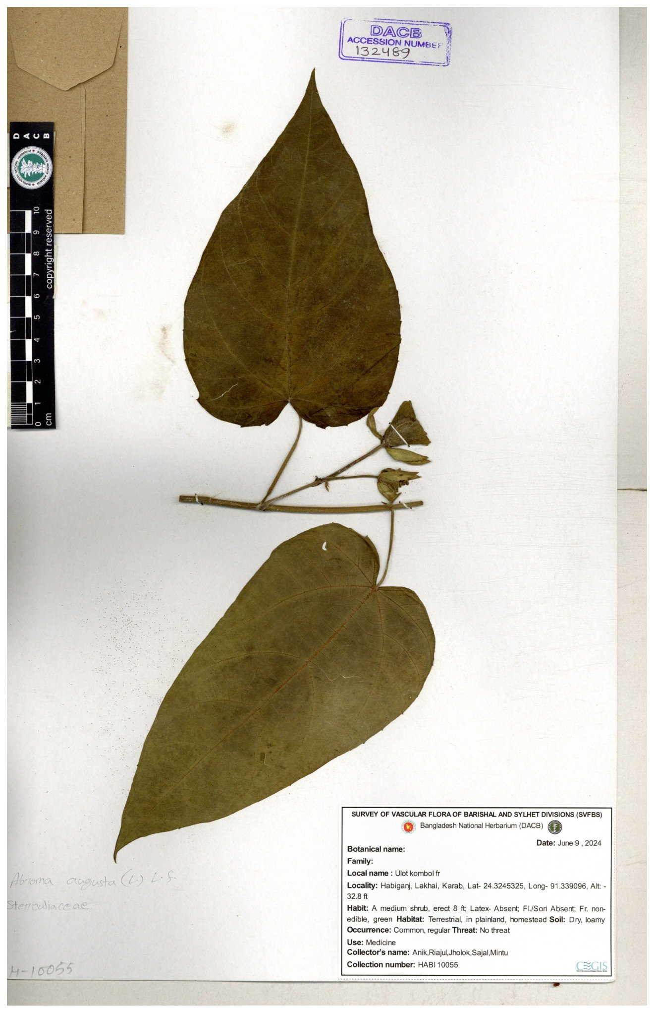 | 25567 | Sterculiaceae | Abroma villosa Roxb. | Omak, Odal | M.K. Mia | 21163 29-08-2016 |