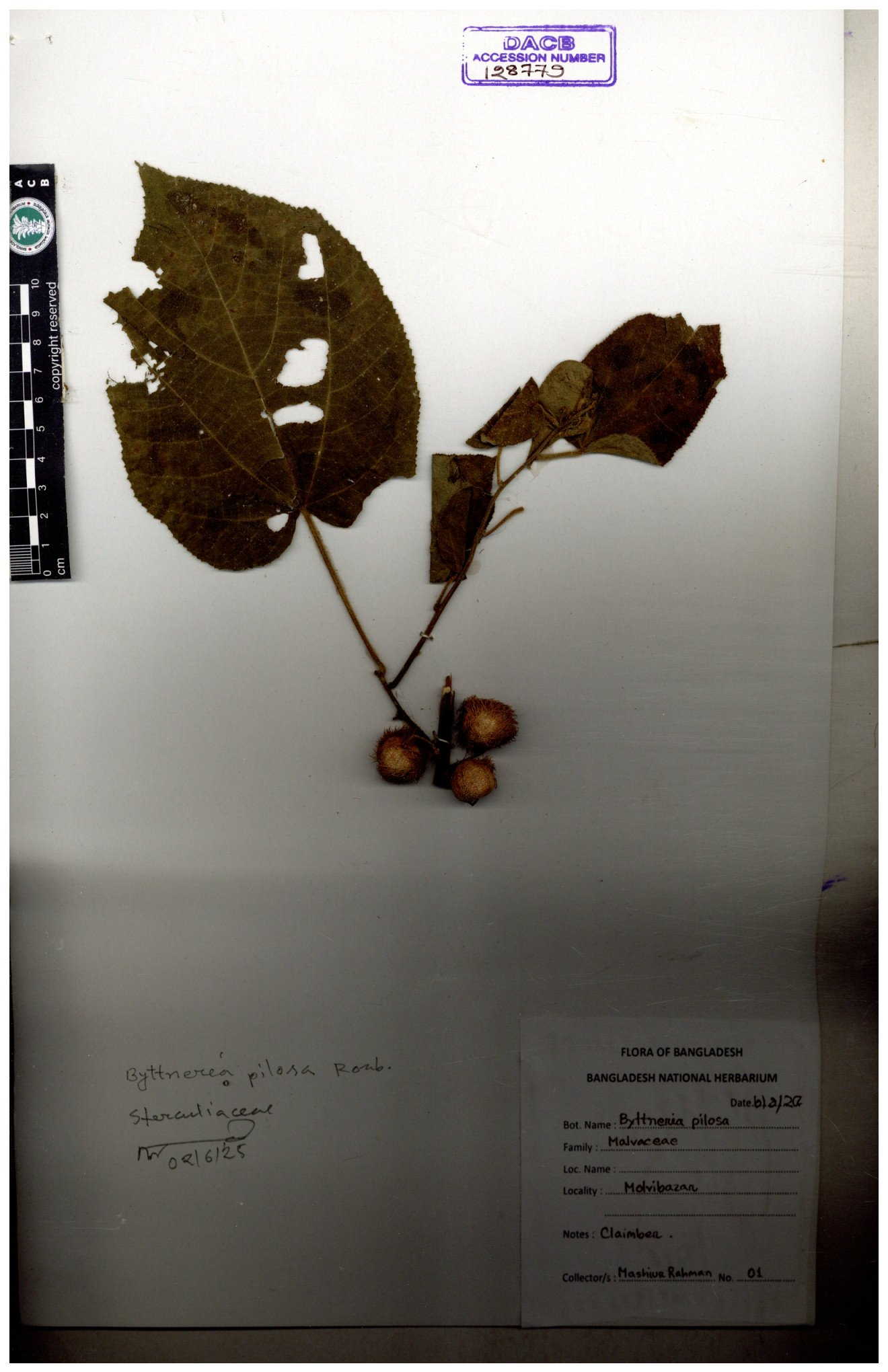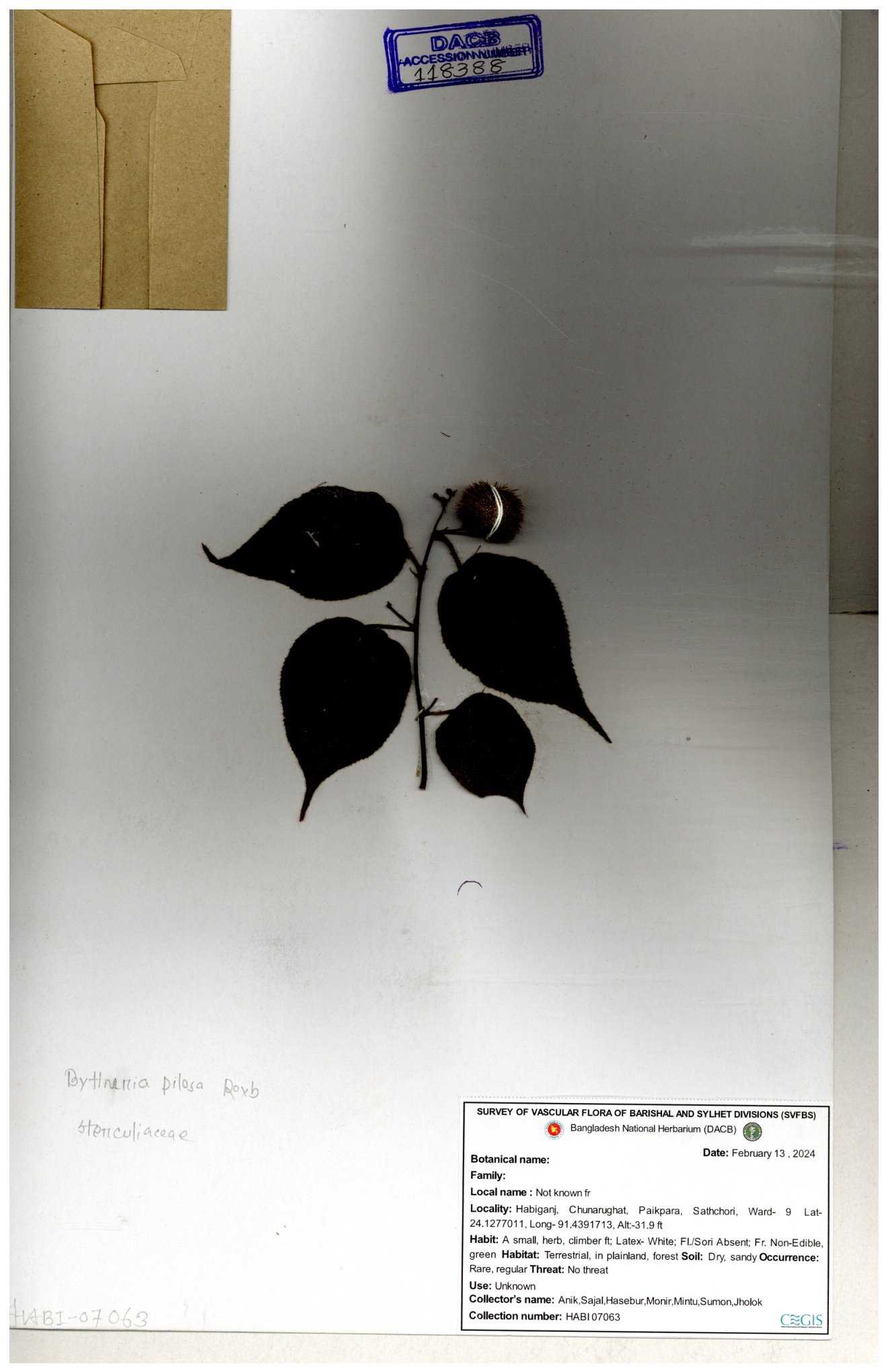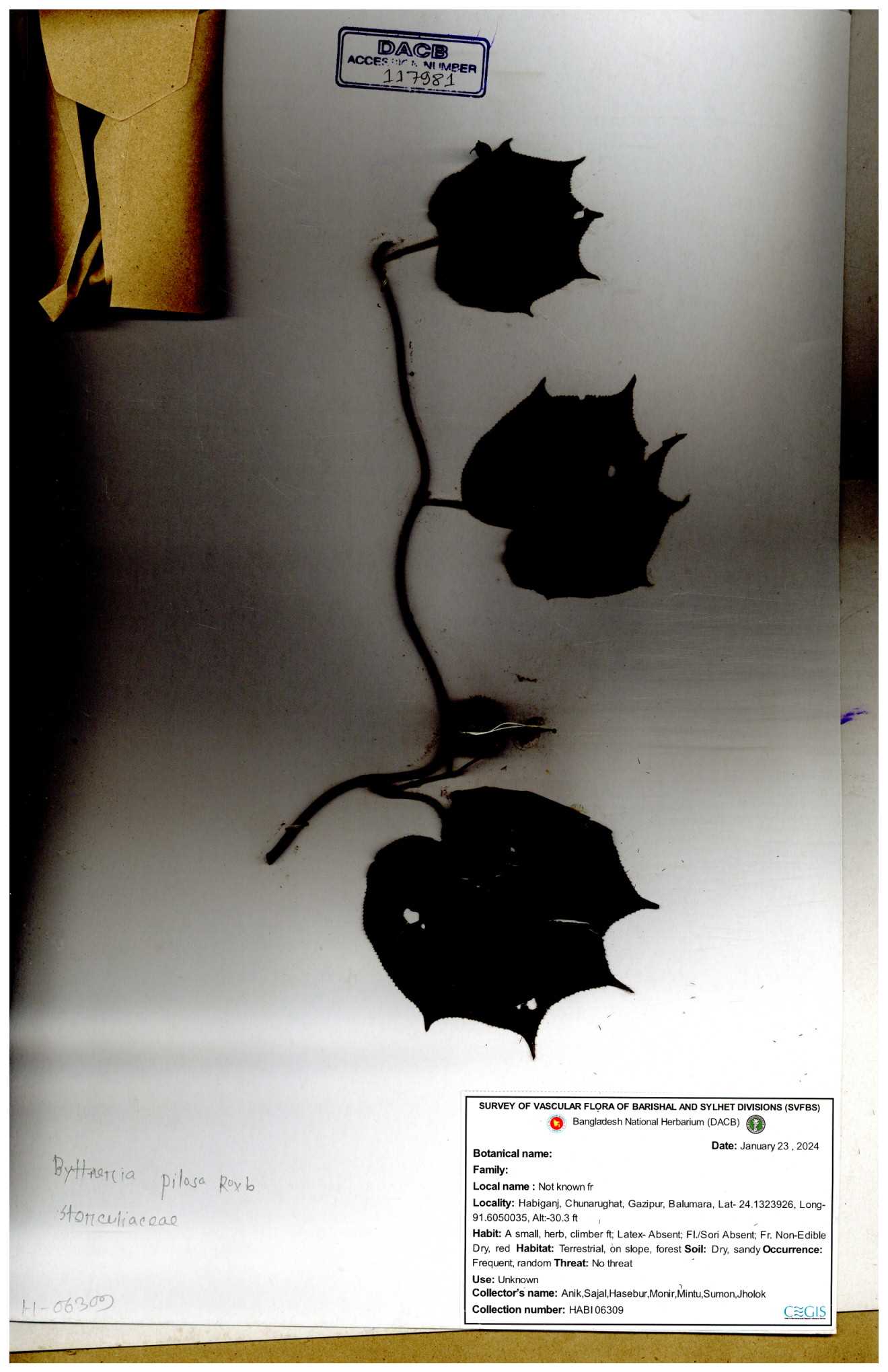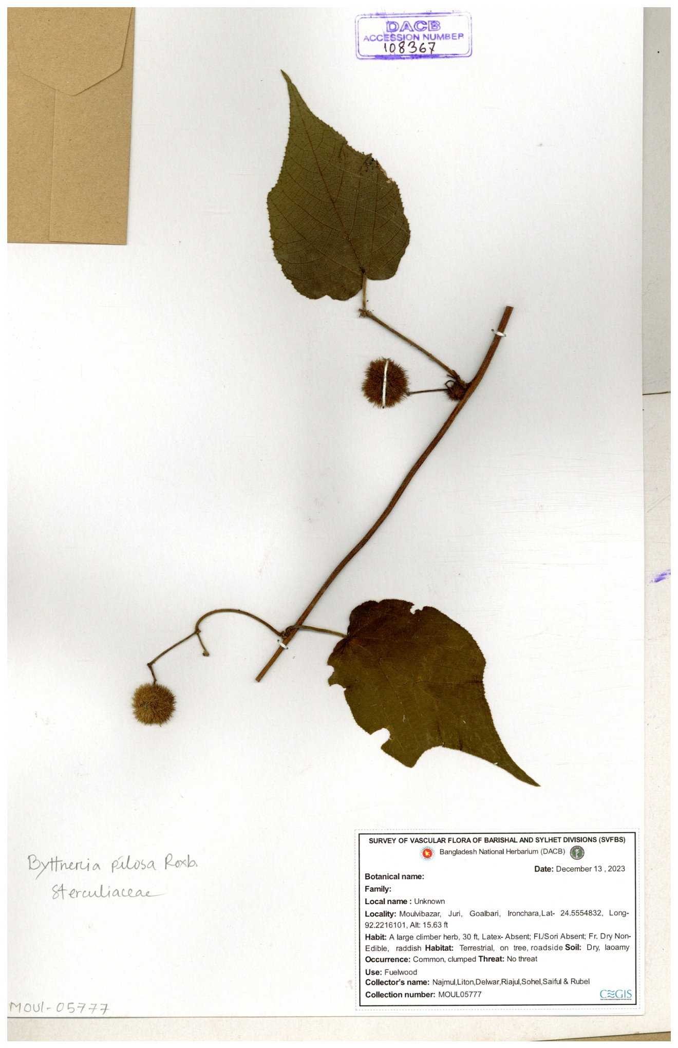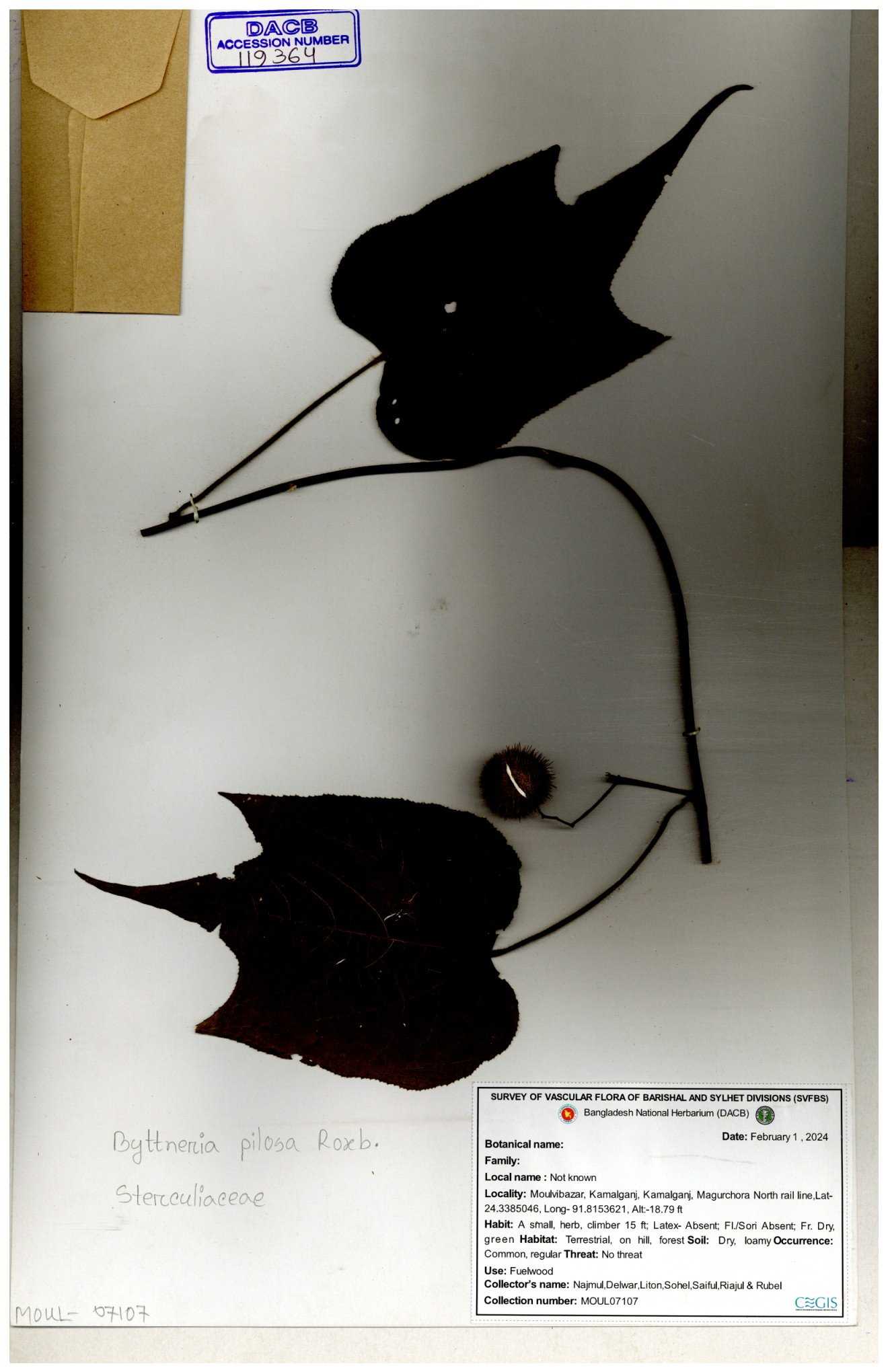 | 54937 | Sterculiaceae | Byttneria villosa Roxb. | Md. Moniruzzaman, Al-Amin & Kawsar | MAK- 5876 04-10-2017 |