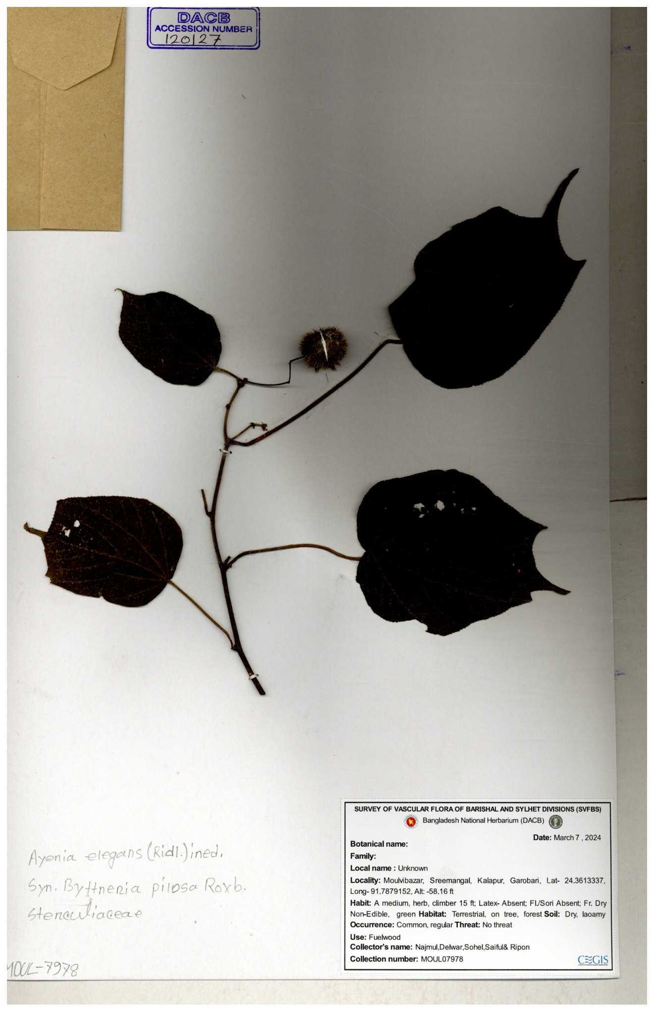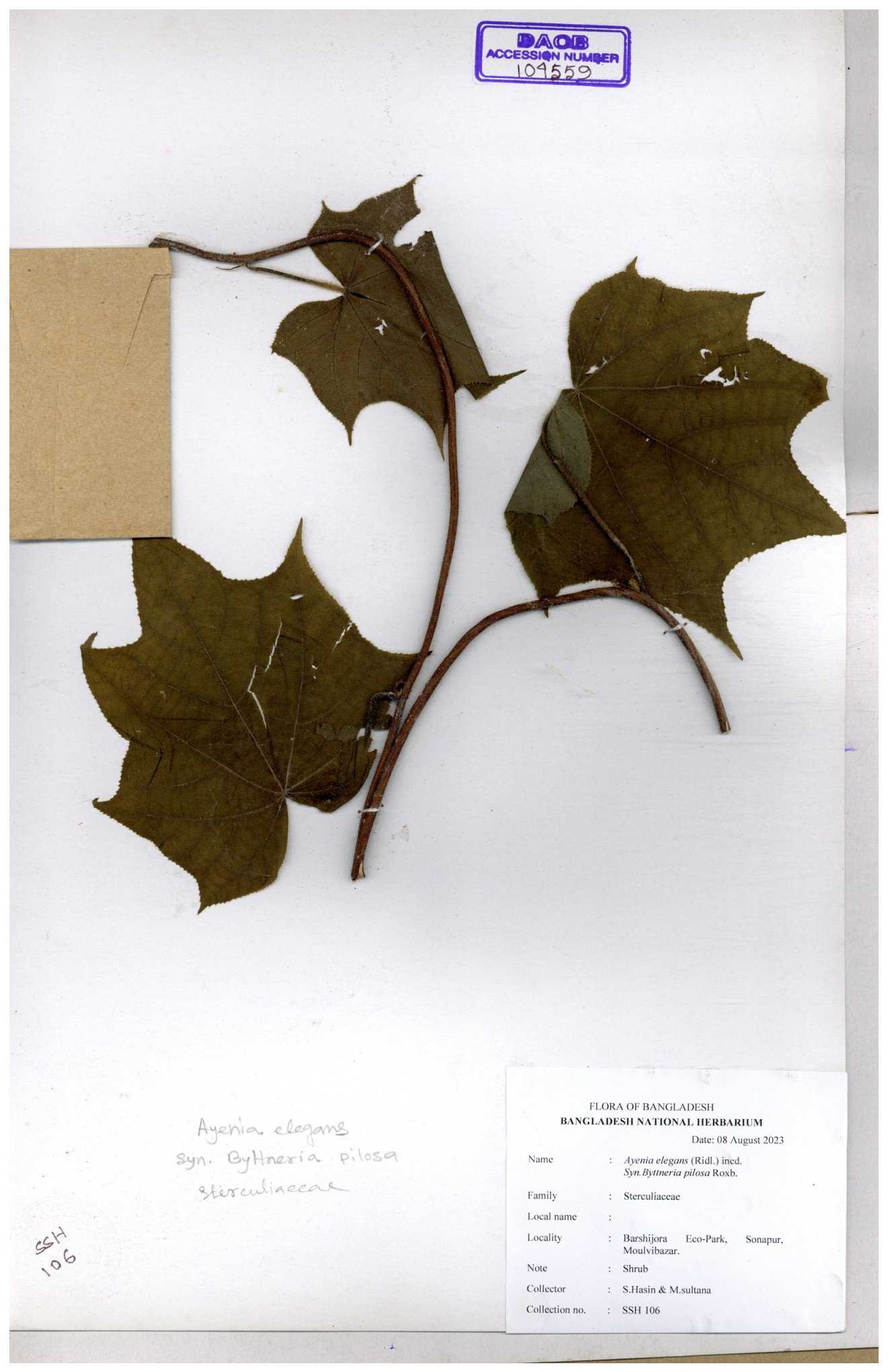 | 47248 | Sterculiaceae | Byttneria aspera Collebr. ex Wall. | Khandakar Kamrul Islam | KKI- 1013 25-01-2017 |