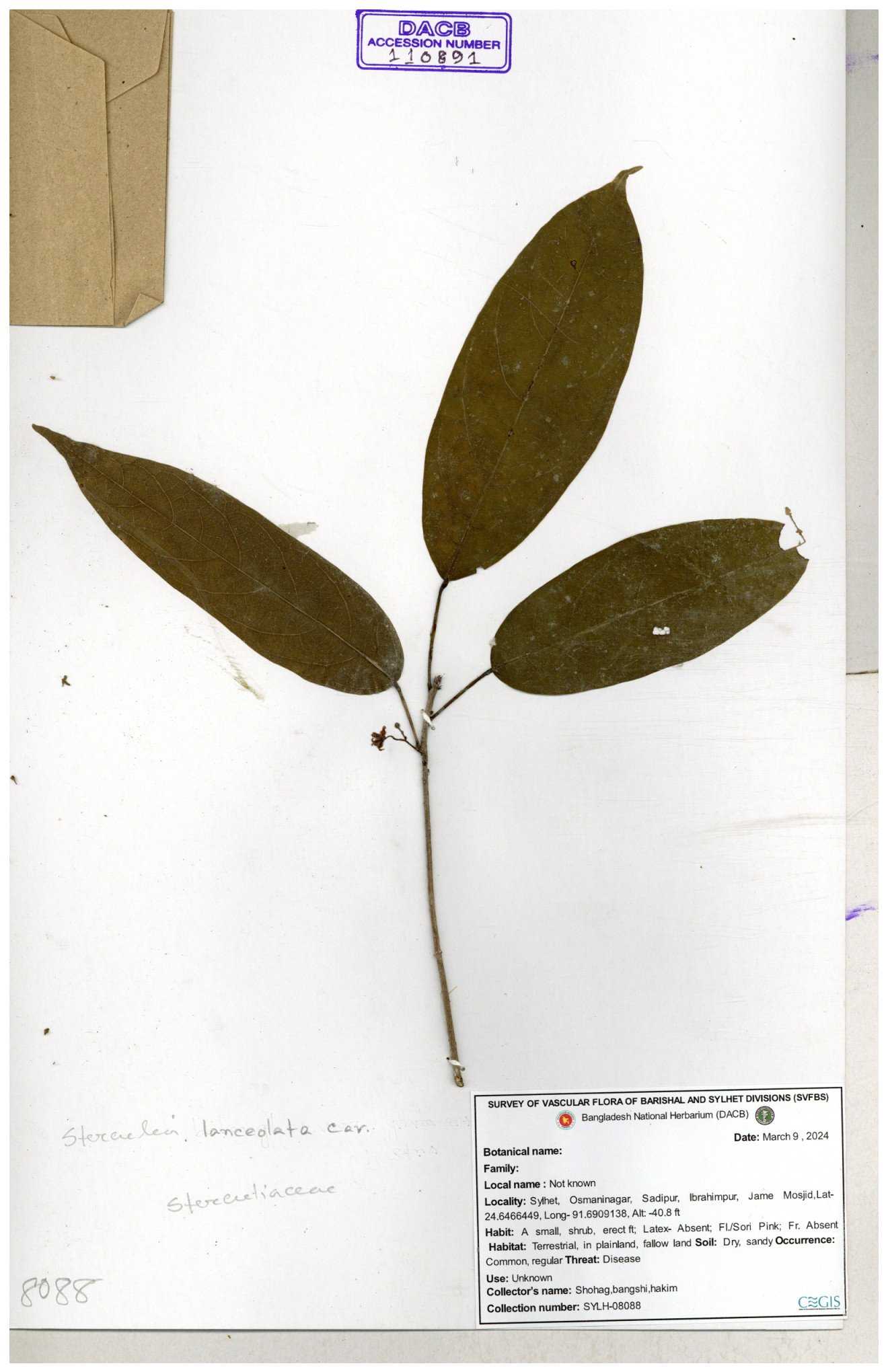 | 79924 | Sterculiaceae | Sterculia villosa Roxb. | Unknown | Kowser et al | KH- 1876 14-11-2016 |