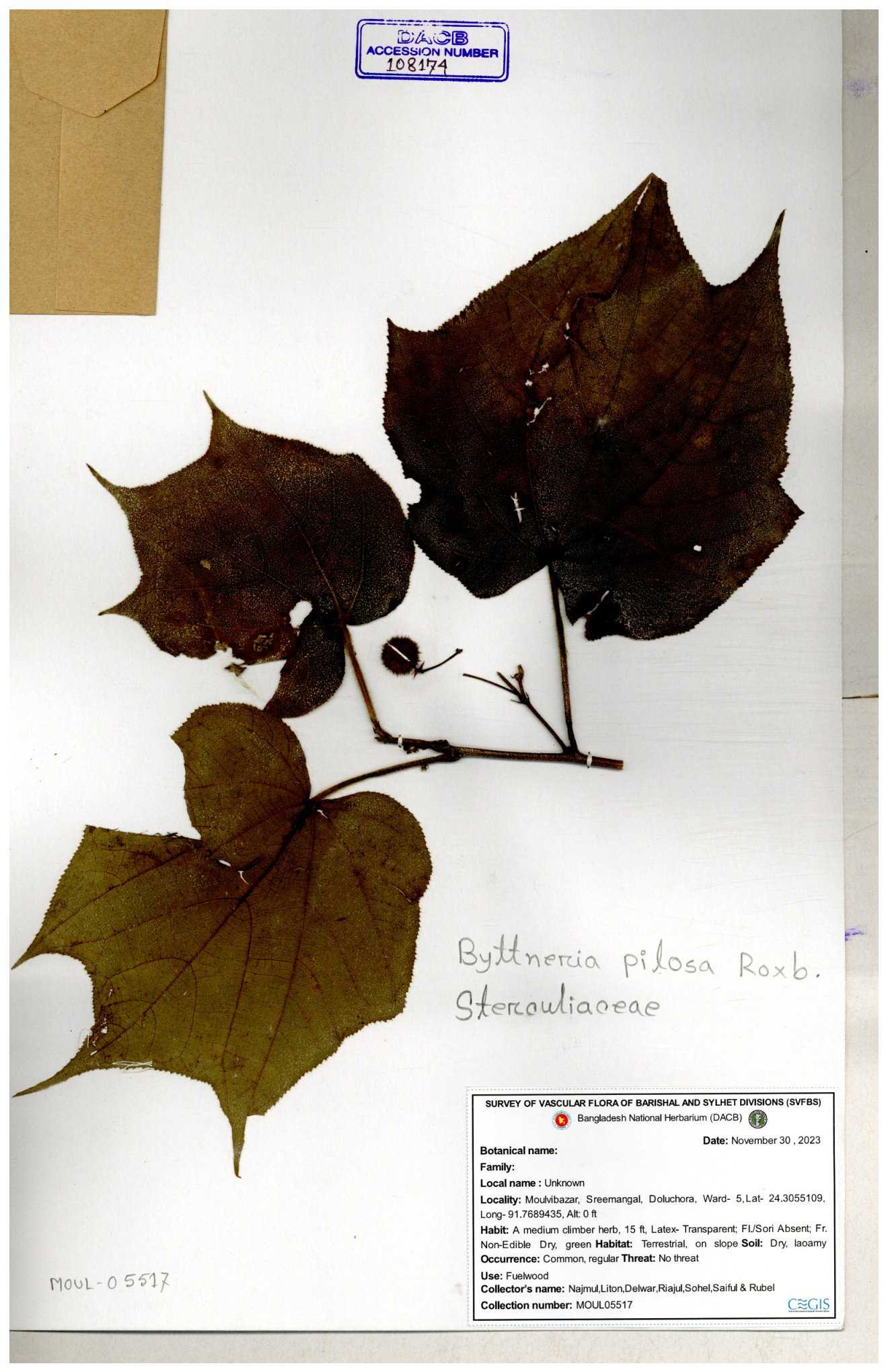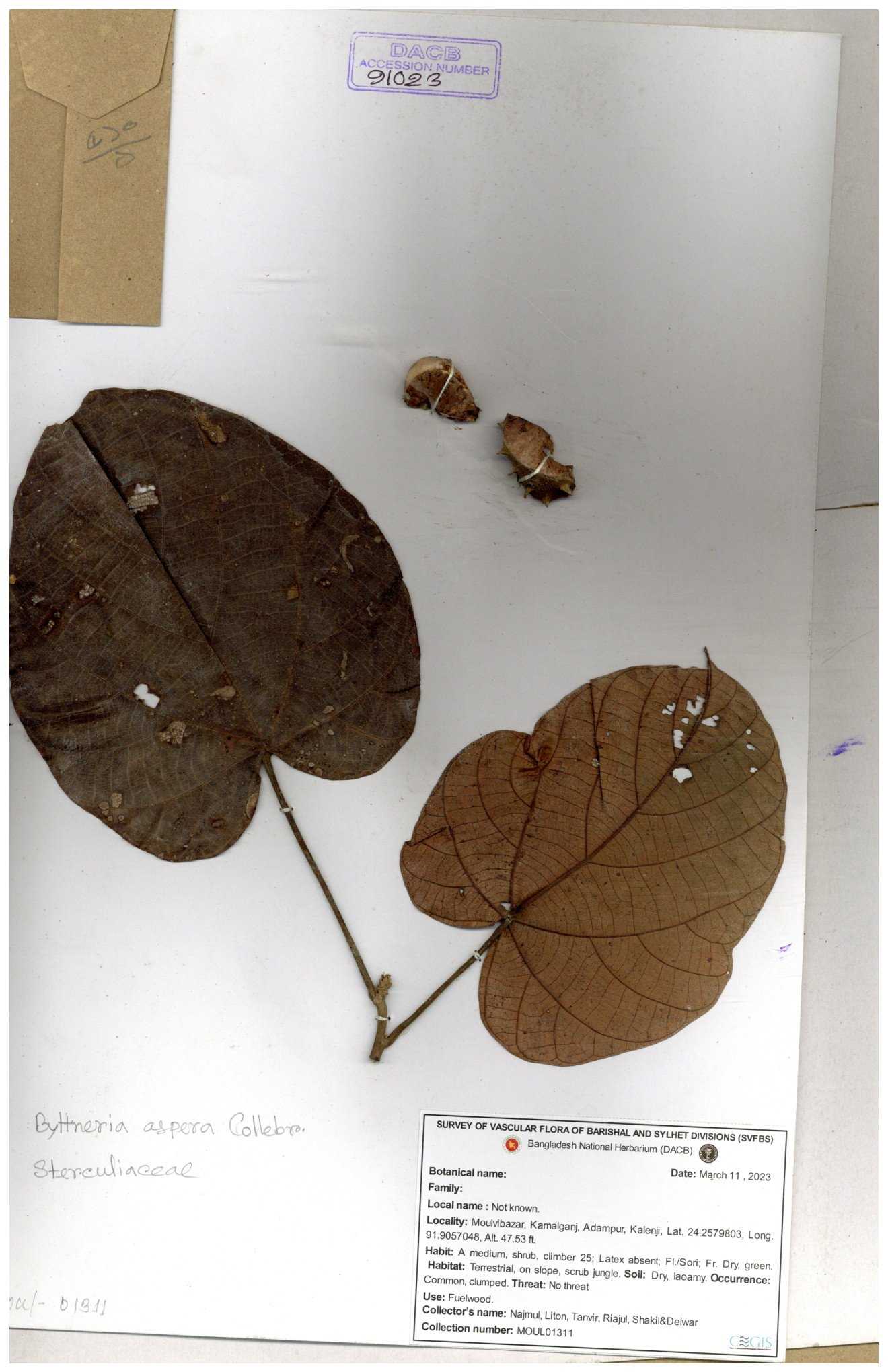 | 93014 | Sterculiaceae | Byttneria aspera Collebr. ex Wall | Nazul, Liton, Delwar, Riajul, Shakil, Mahdi & Rubel | MOUL02359 30-11--0001 |