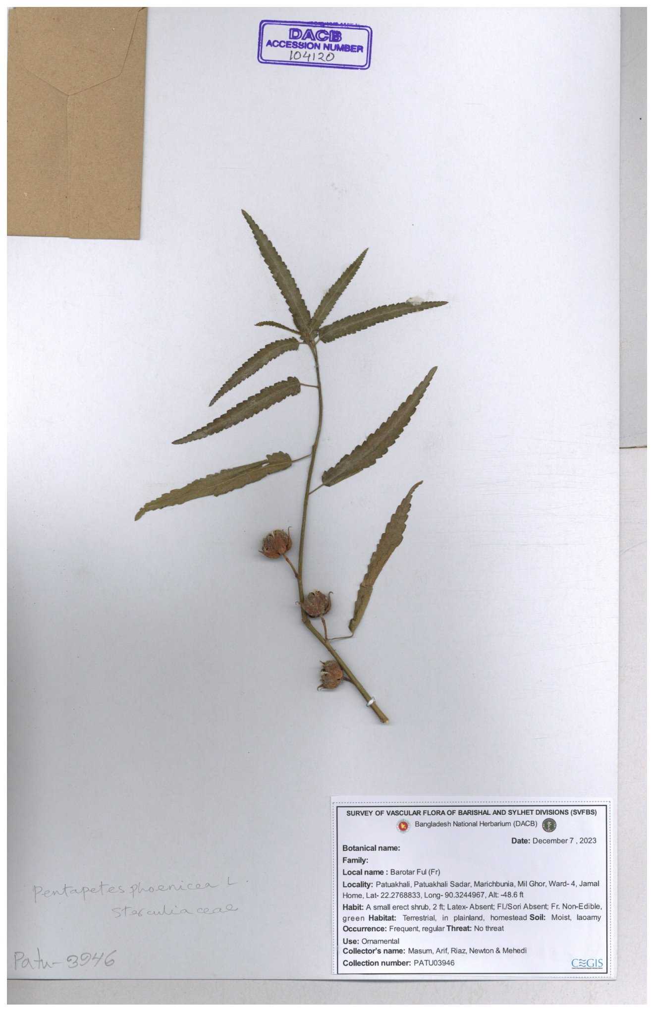 | 67451 | Sterculiaceae | Pterospermum acerifolium (L.) Willd. | Kanokchapa | I Hossen, MS Islam, MKR Rahman & MR Miah | IH- 3617 25-01-2017 |