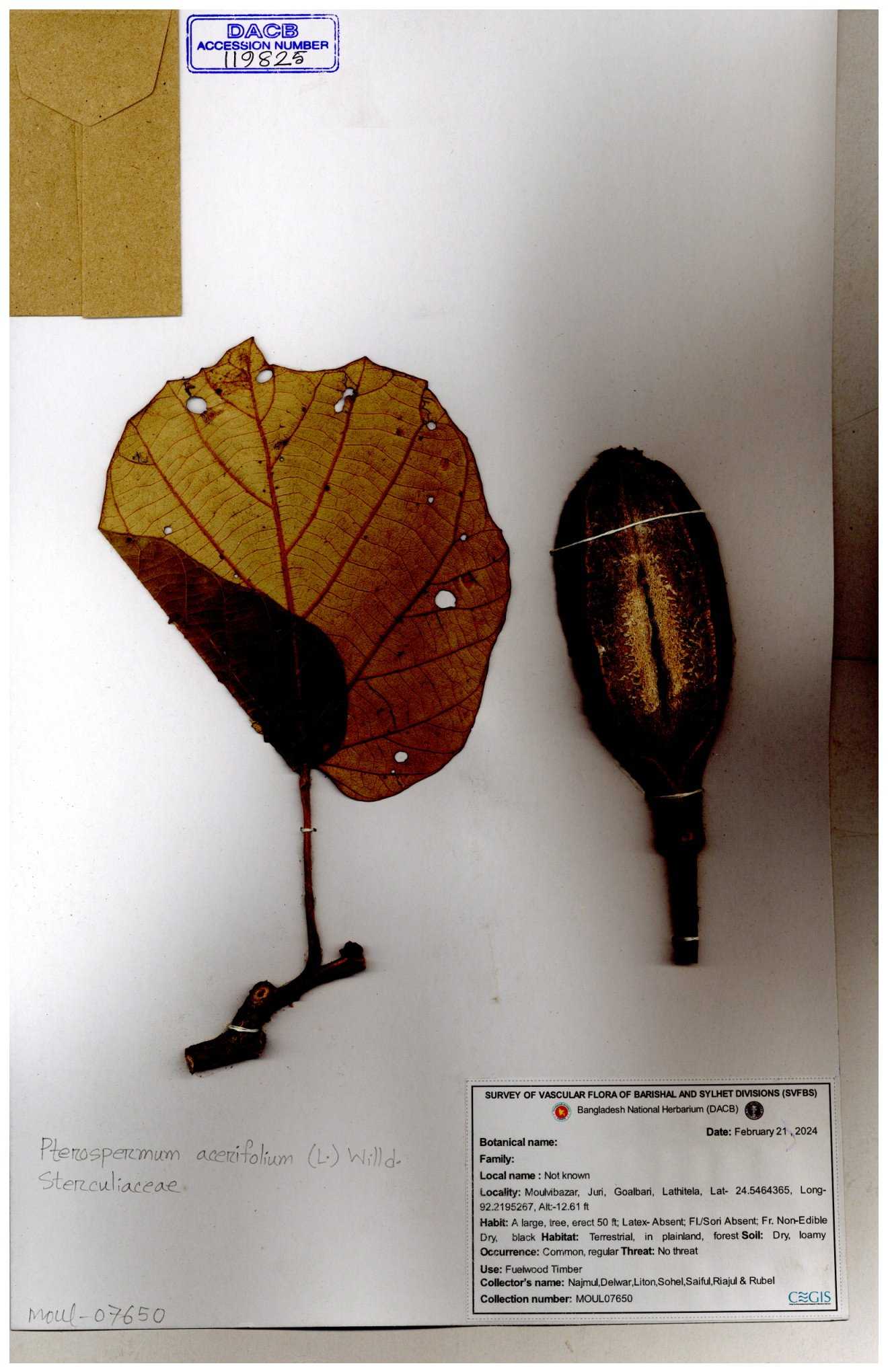 | 14253 | Sterculiaceae | Pterospermum acerifolium (L.) Willd. | A.M. Huq | 25-01-2017 |