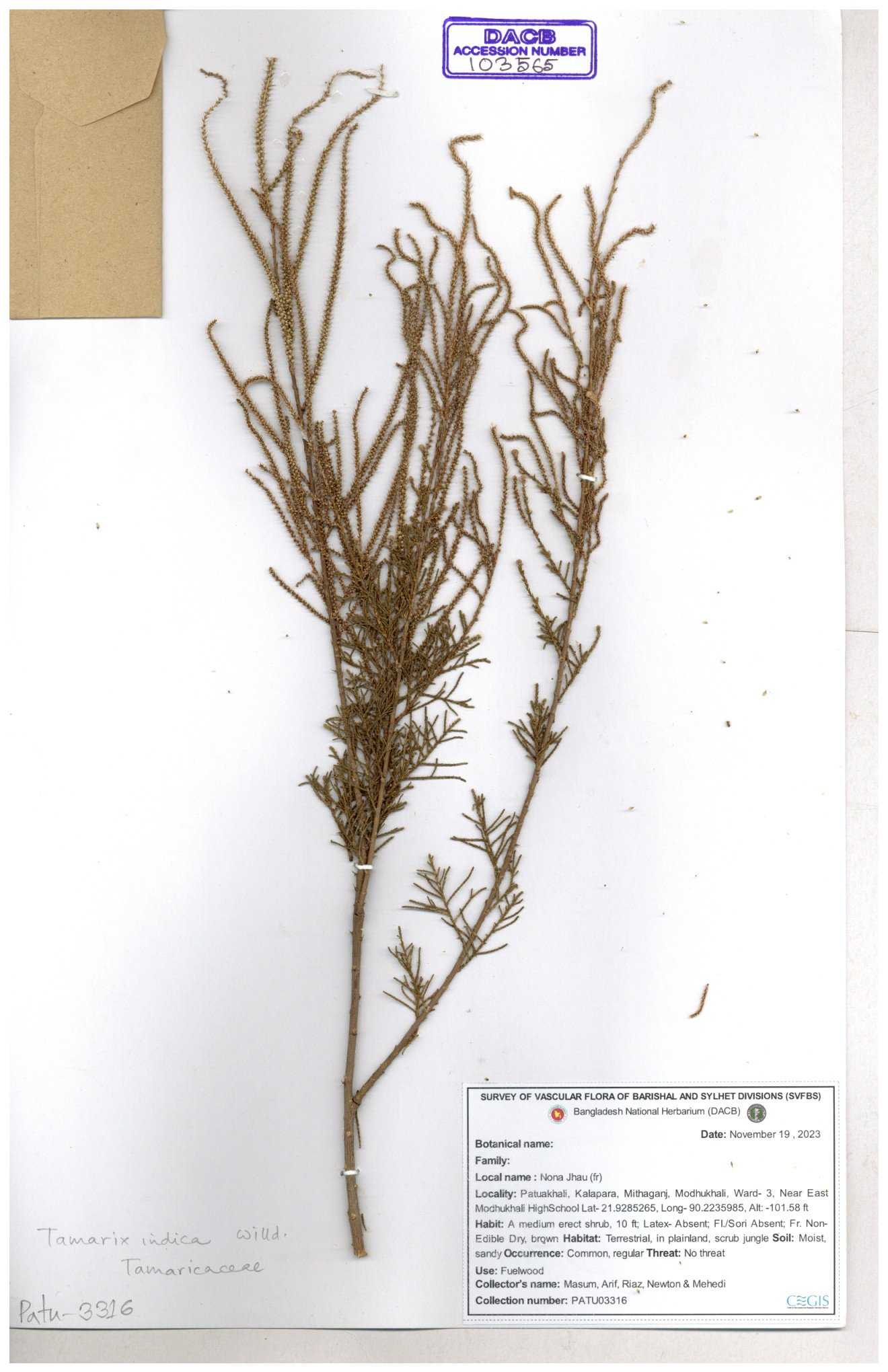 | 60266 | Tamaricaceae | Tamarix indica Willd. Nuna jau | Nuna Jhau | Dr. M. Sultana | DMS. 3132 16-10-2019 |