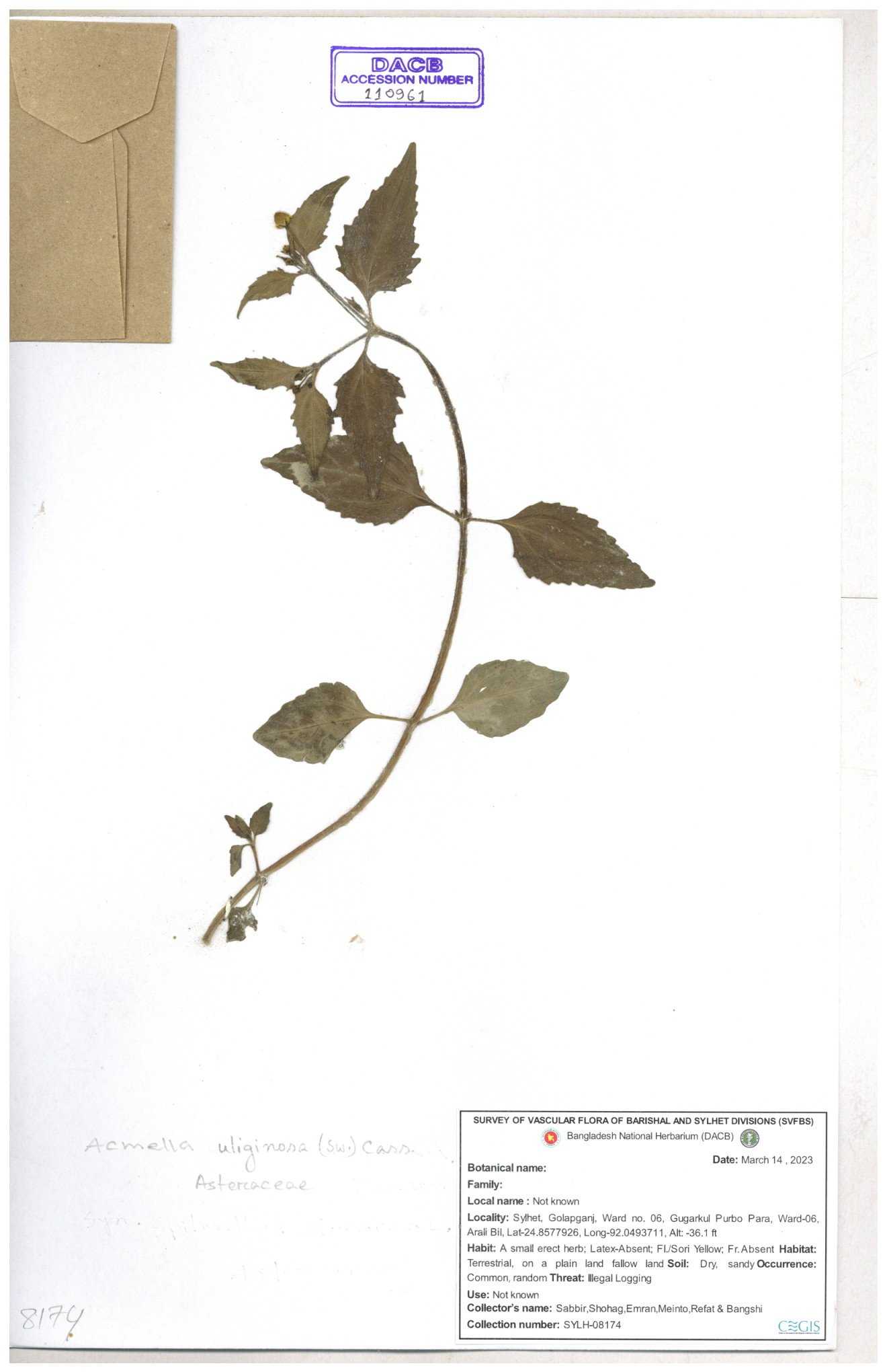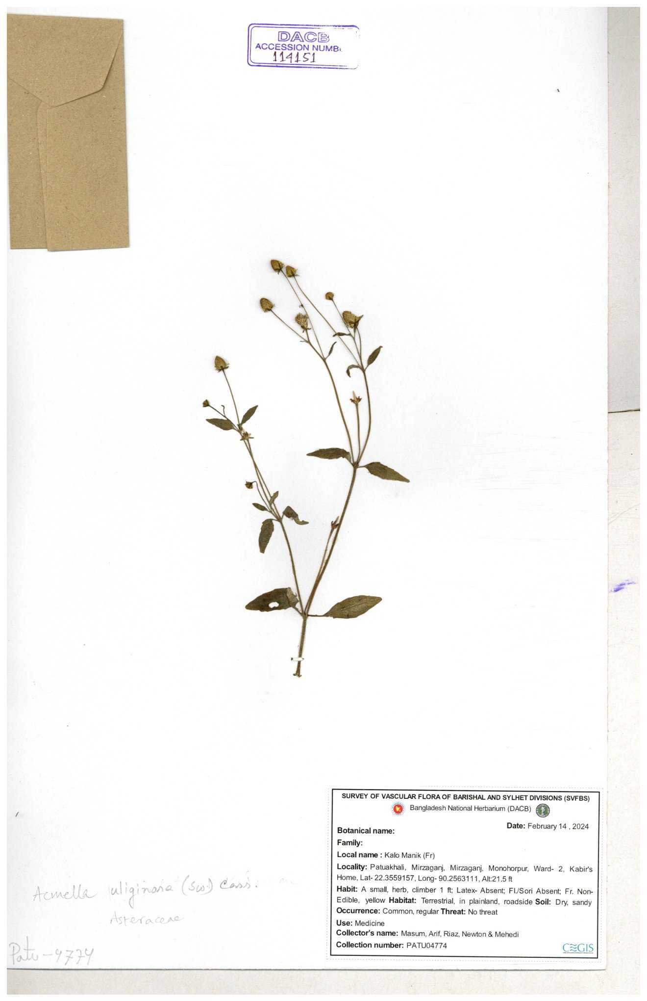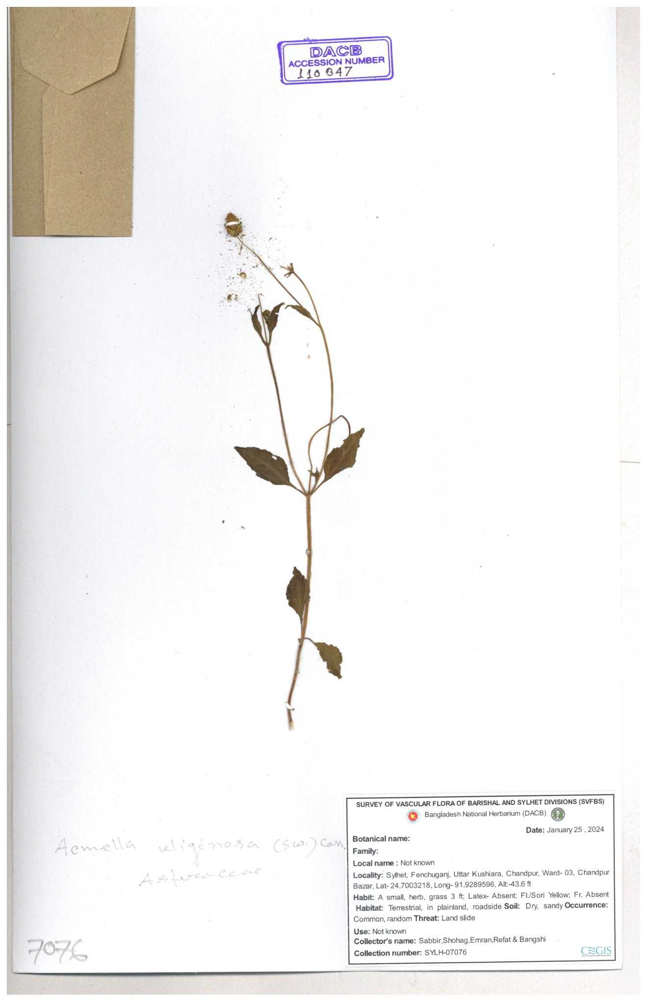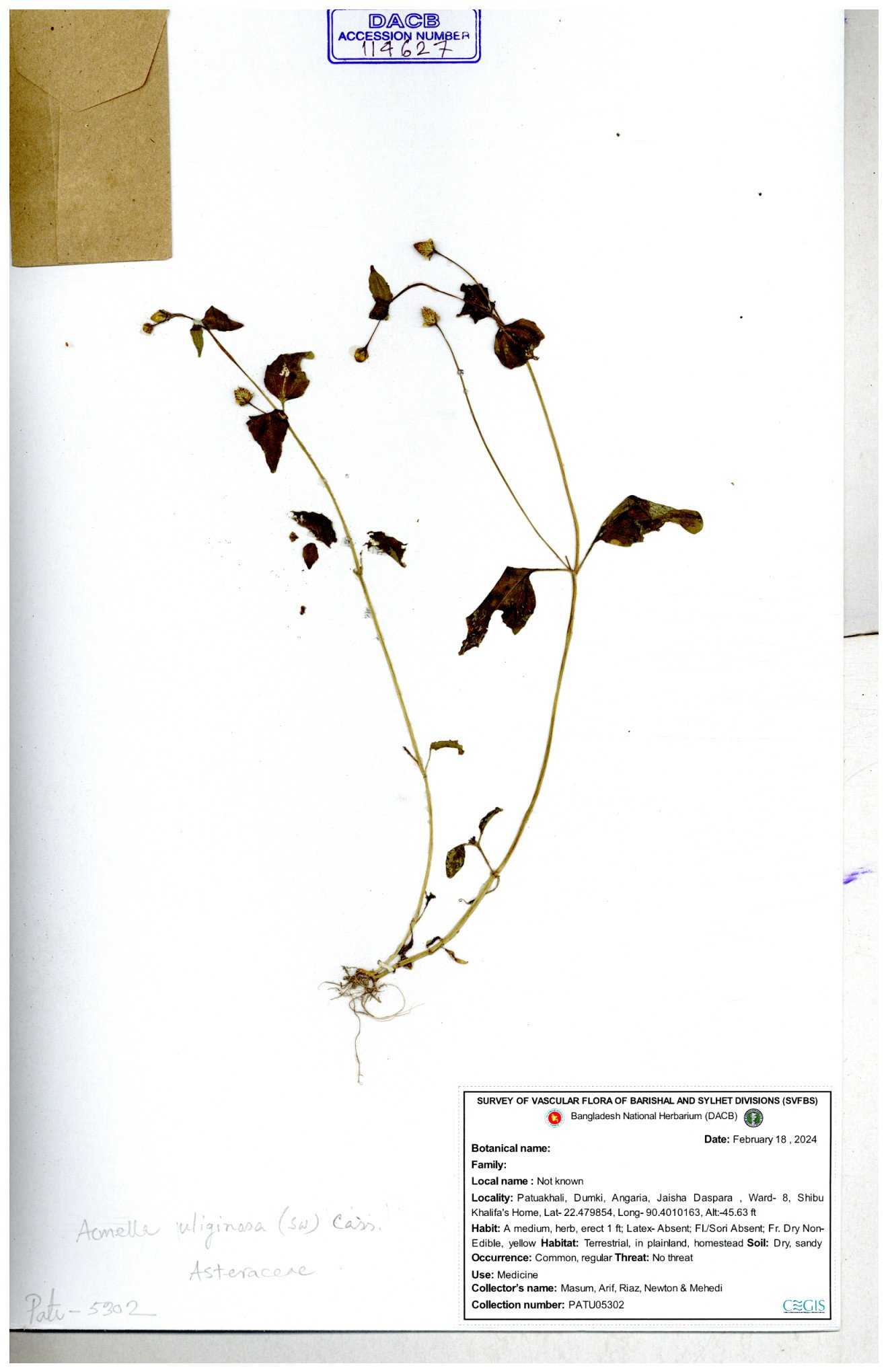 | 85738 | Asteraceae | Acmella uliginosa | Niyamul Kabir, Jahid Hasan, md. Moniruzzaman, Mehedi Hasan | NK-5734 18-09-2017 |