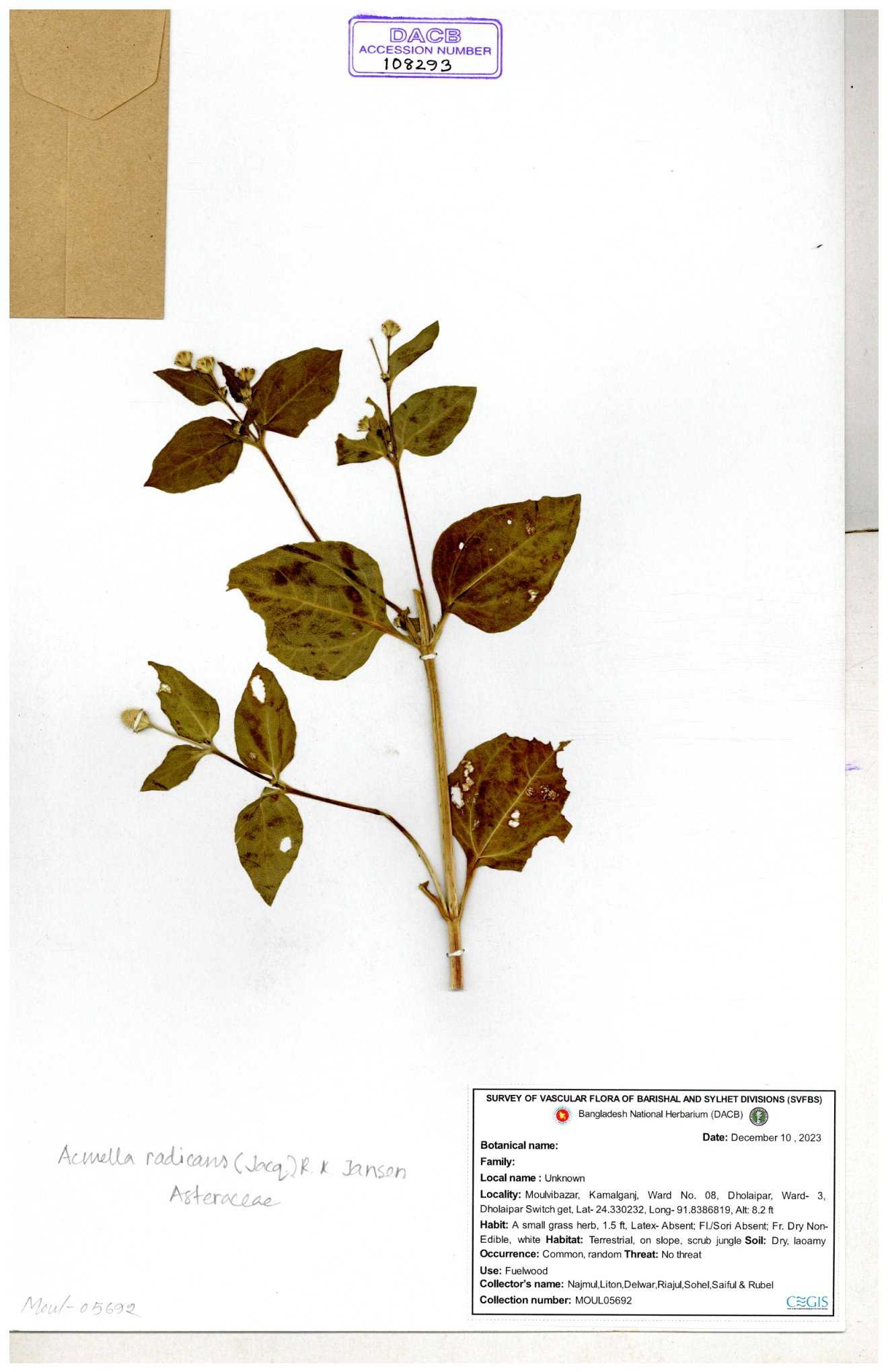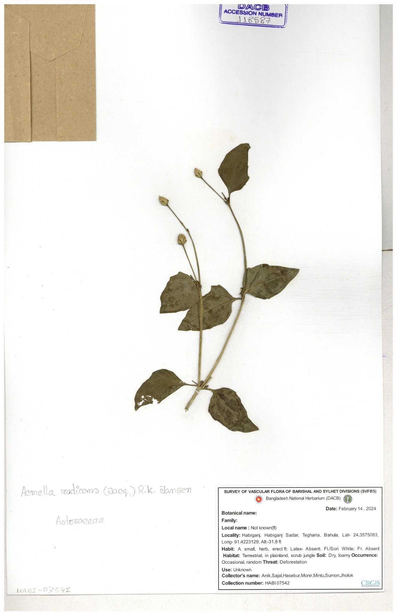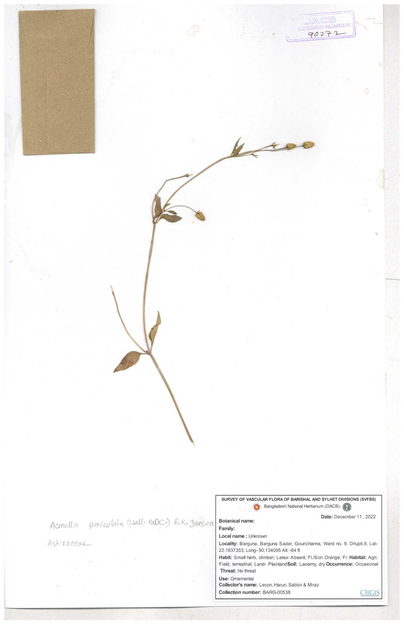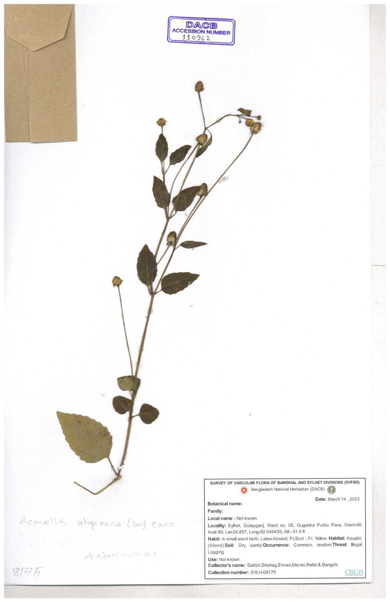 | 85738 | Asteraceae | Acmella uliginosa | Niyamul Kabir, Jahid Hasan, md. Moniruzzaman, Mehedi Hasan | NK-5734 18-09-2017 |