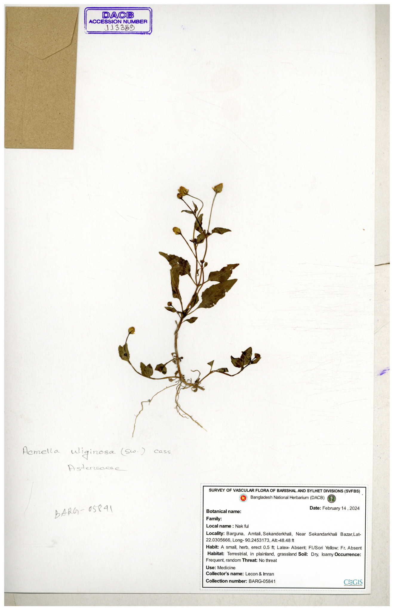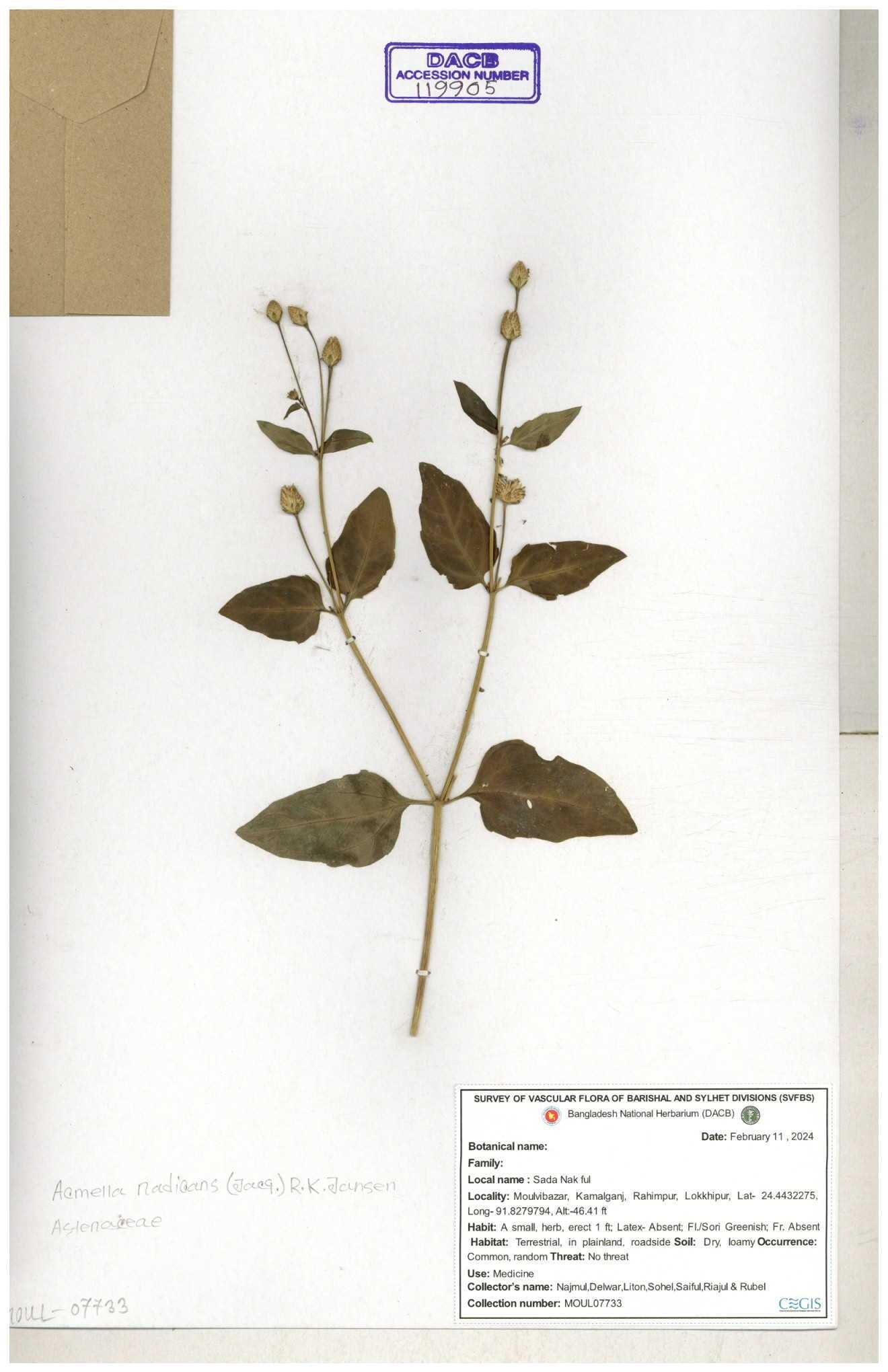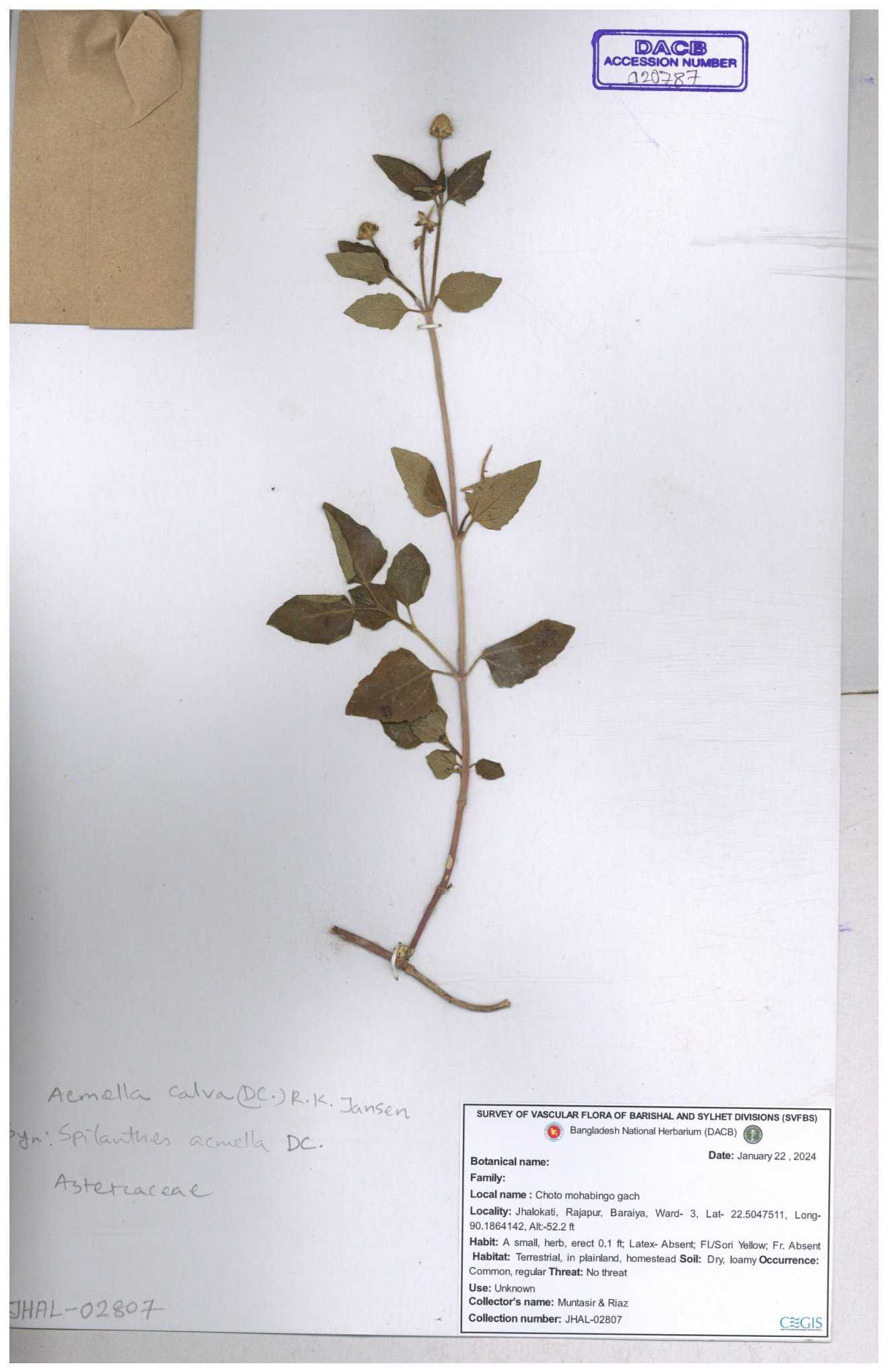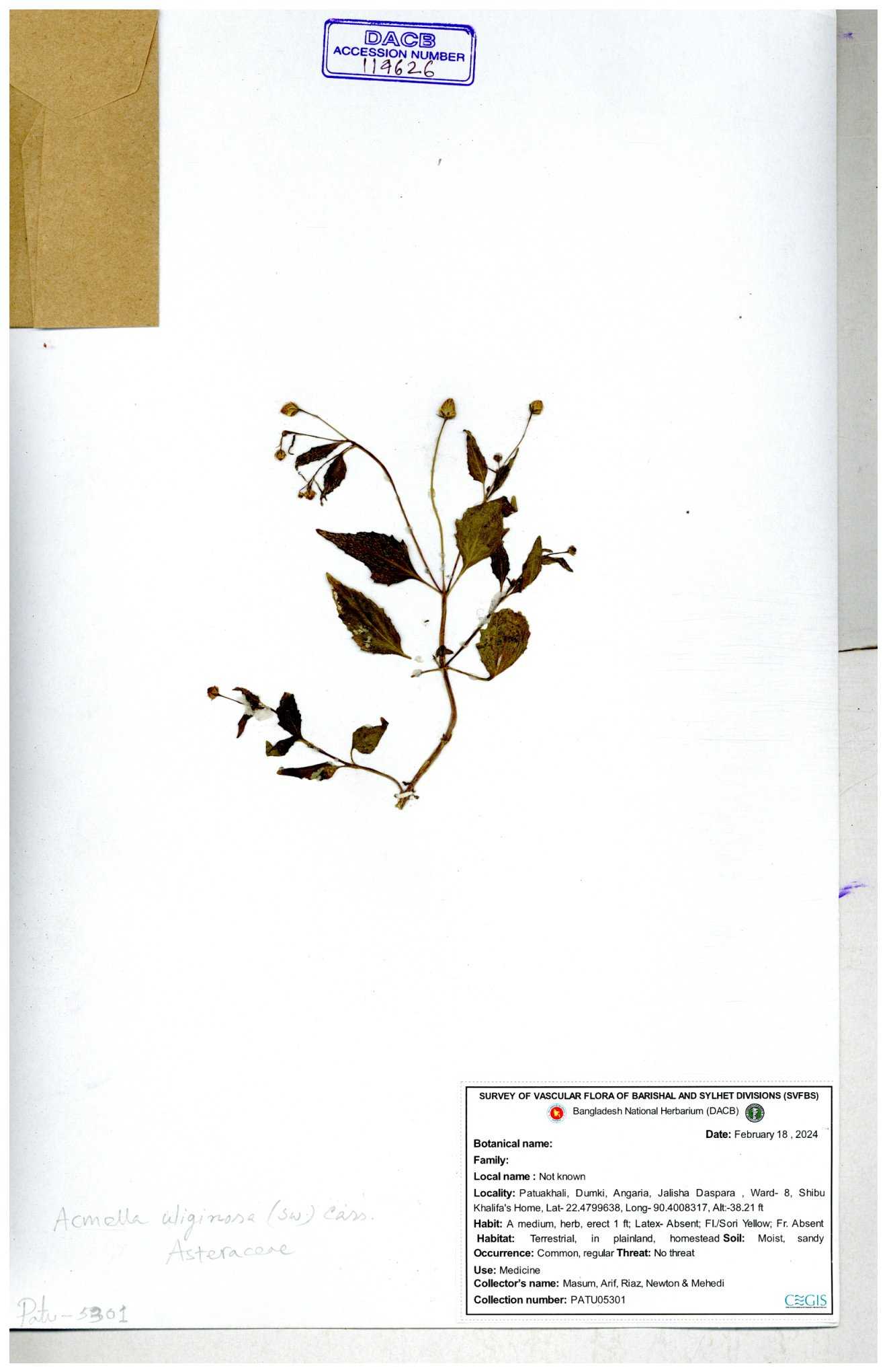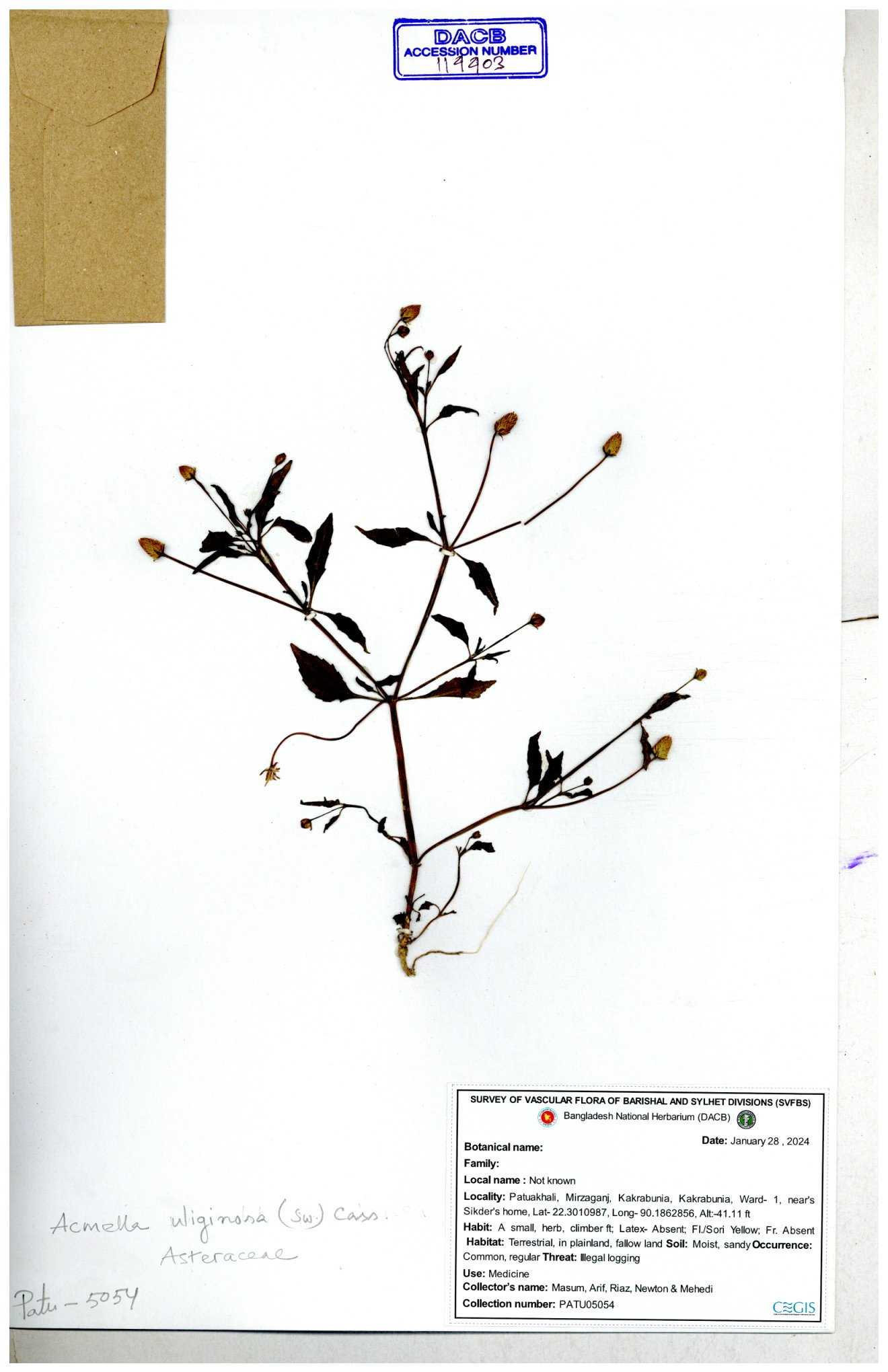 | 85738 | Asteraceae | Acmella uliginosa | Niyamul Kabir, Jahid Hasan, md. Moniruzzaman, Mehedi Hasan | NK-5734 18-09-2017 |