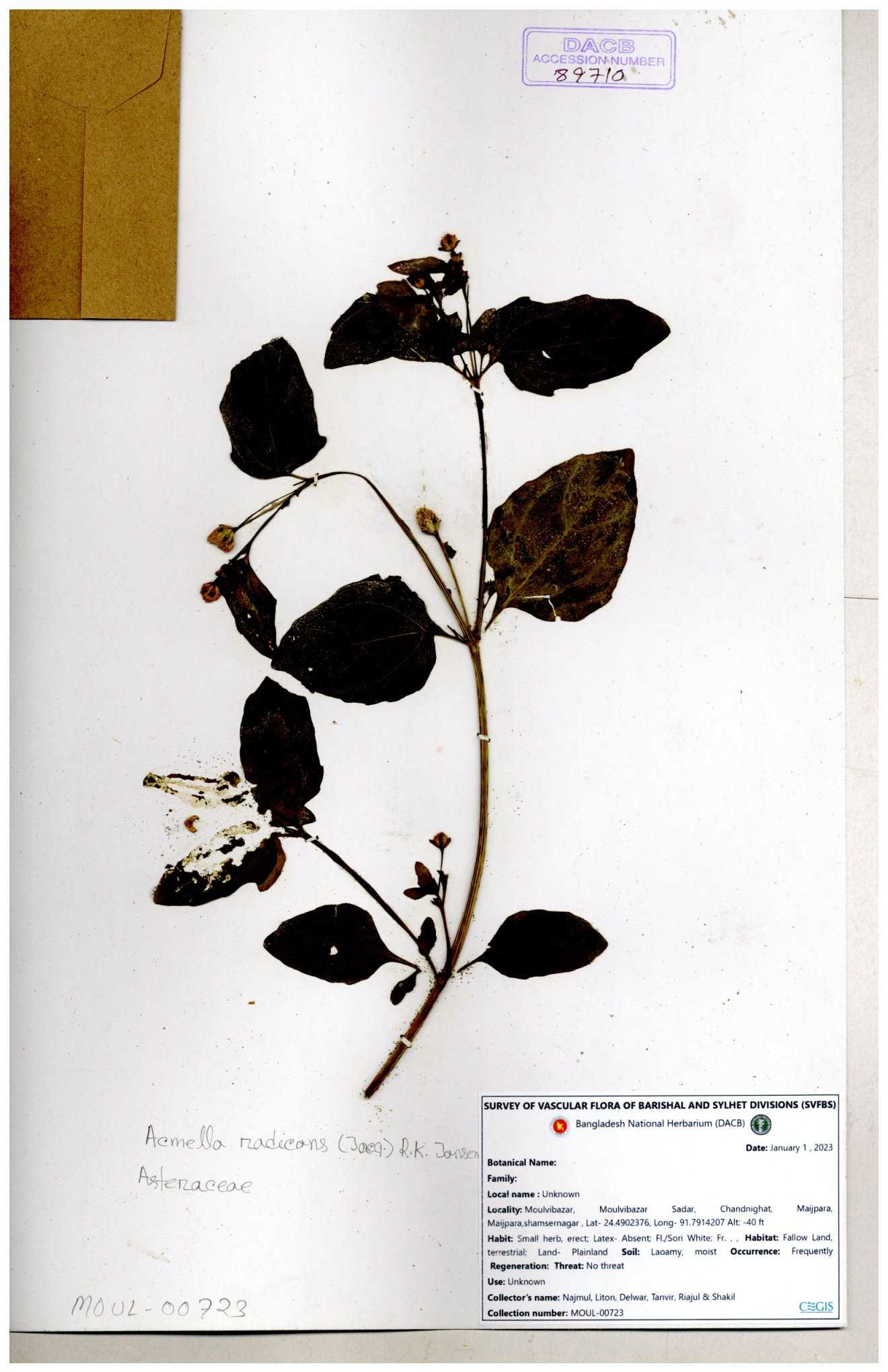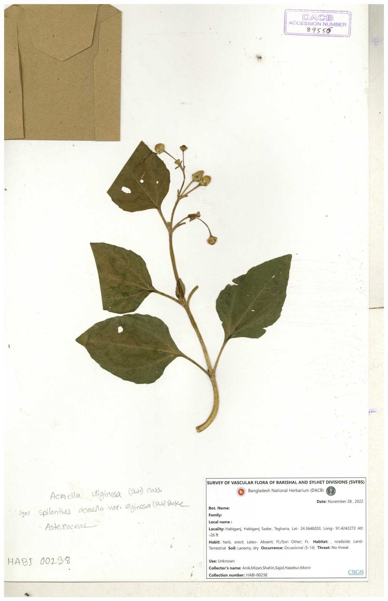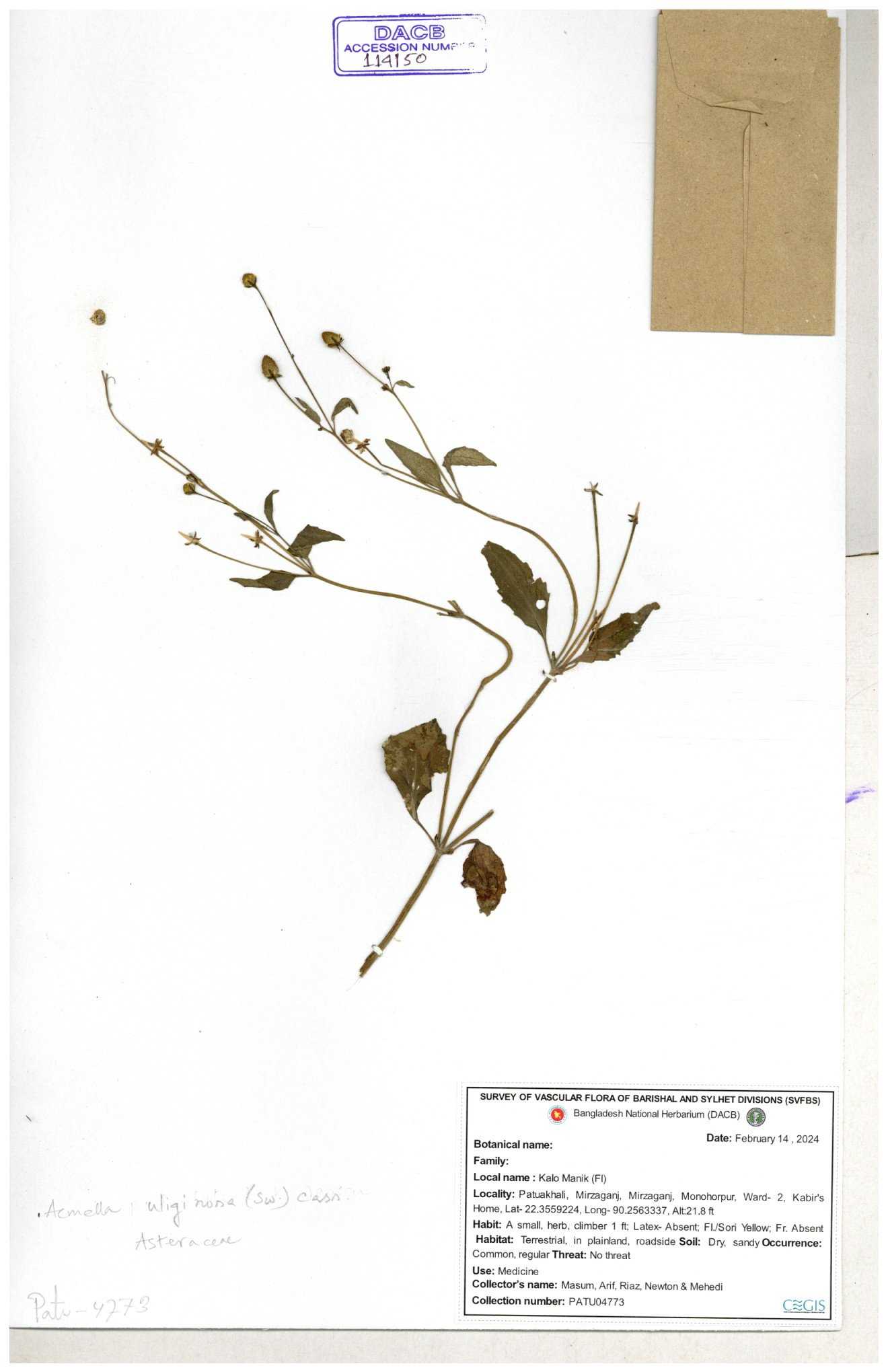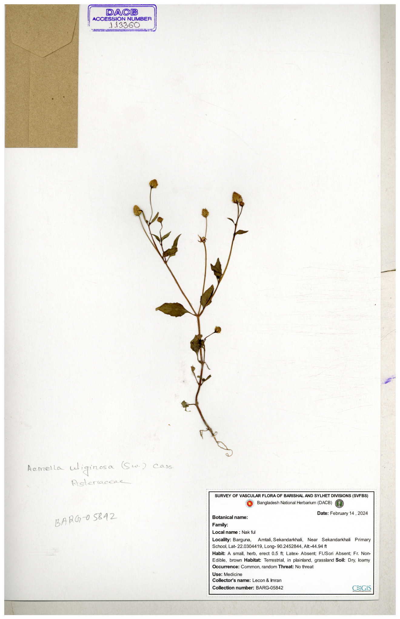 | 85738 | Asteraceae | Acmella uliginosa | Niyamul Kabir, Jahid Hasan, md. Moniruzzaman, Mehedi Hasan | NK-5734 18-09-2017 |