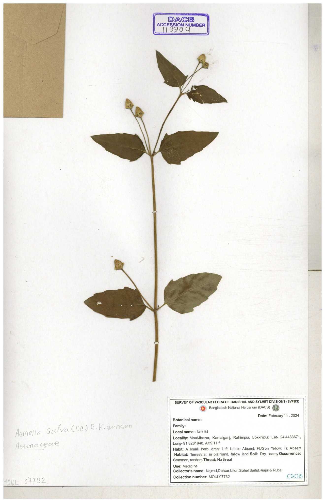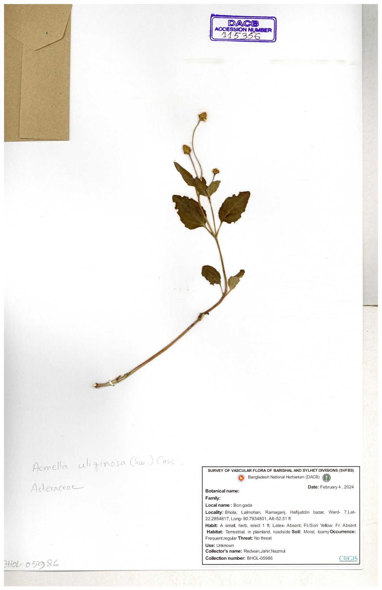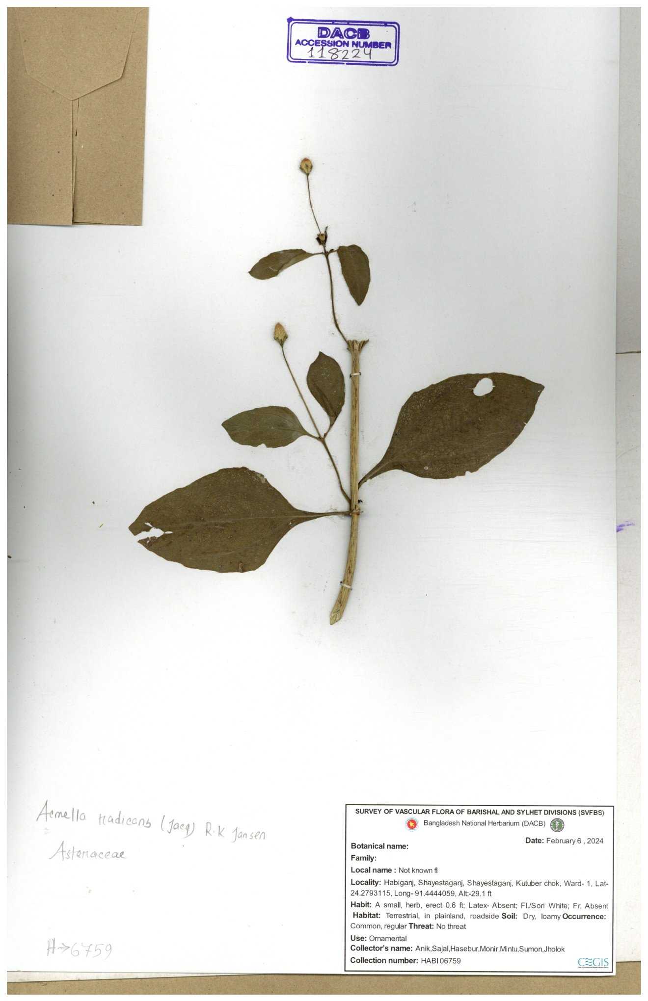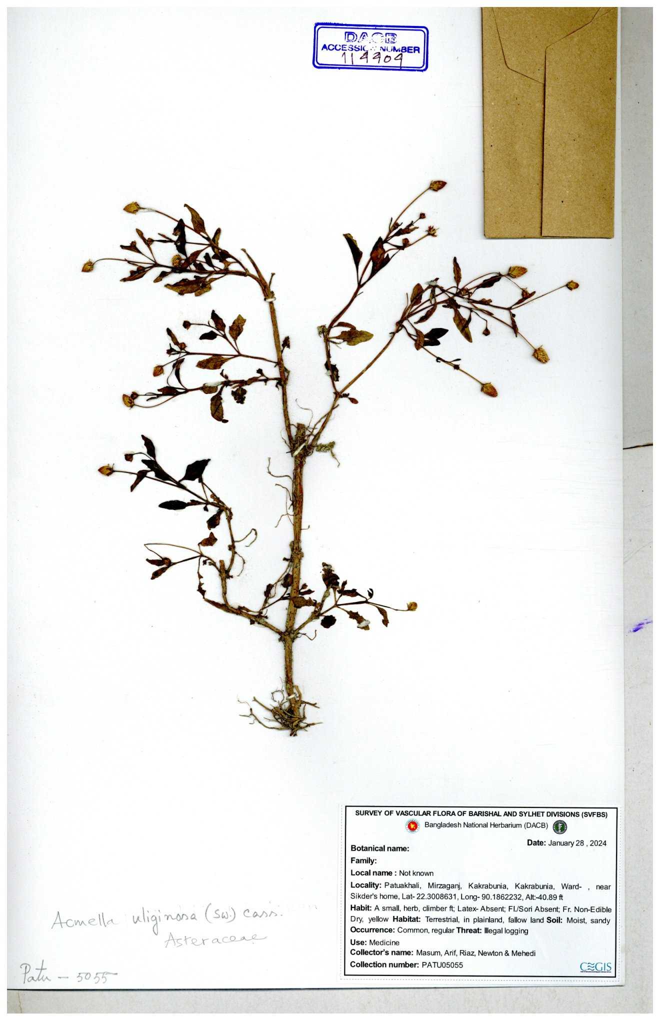 | 85738 | Asteraceae | Acmella uliginosa | Niyamul Kabir, Jahid Hasan, md. Moniruzzaman, Mehedi Hasan | NK-5734 18-09-2017 |