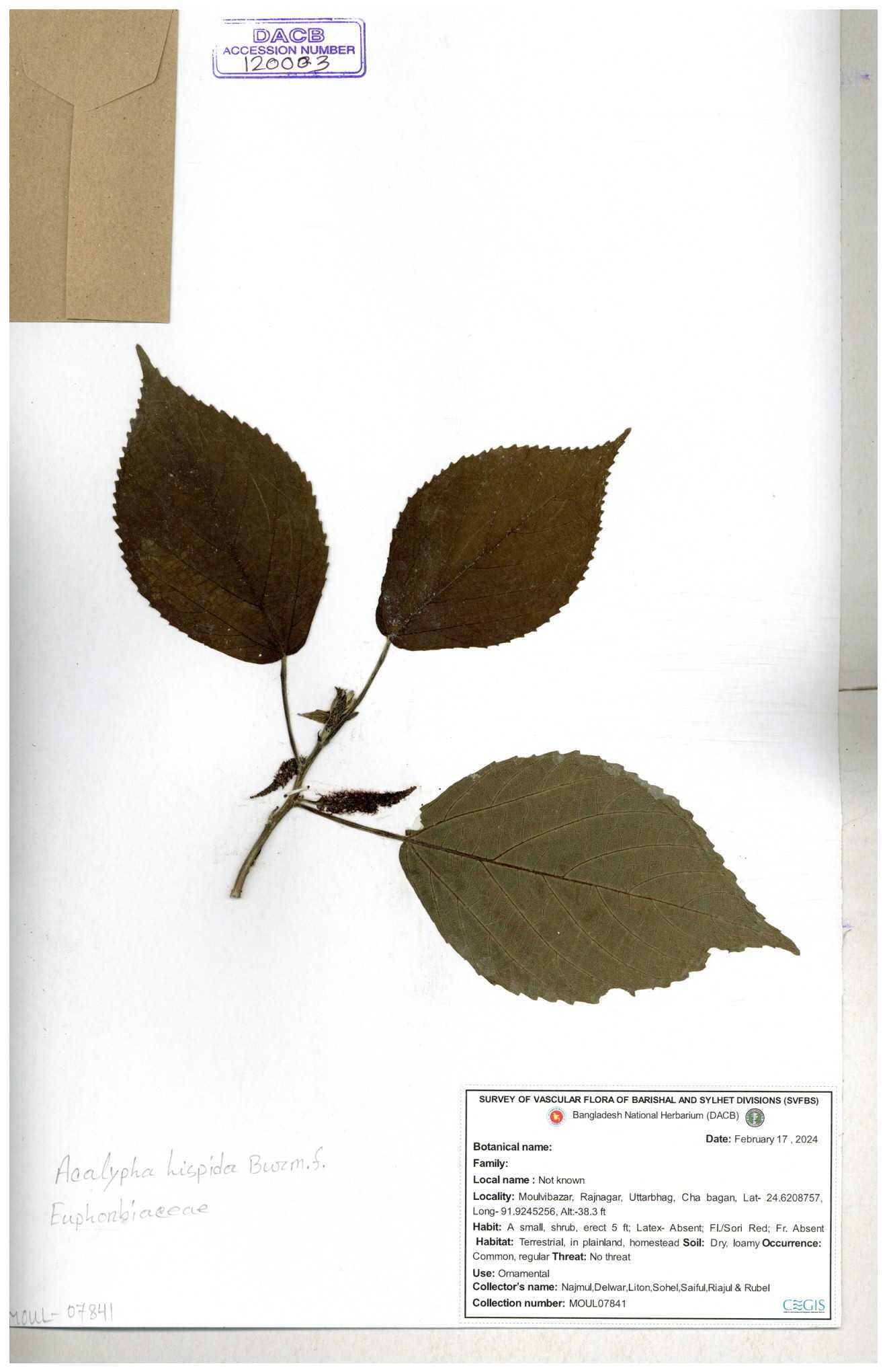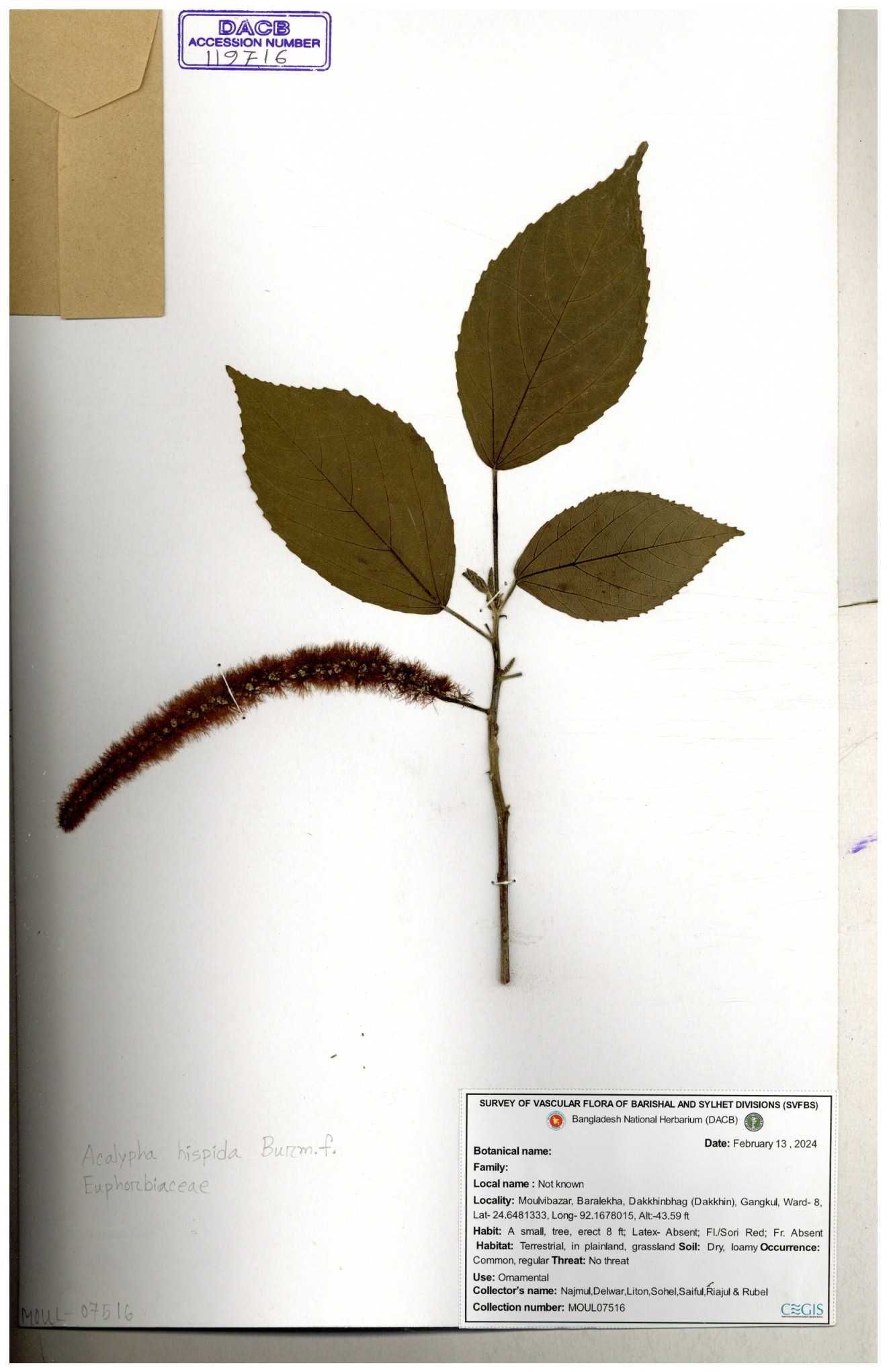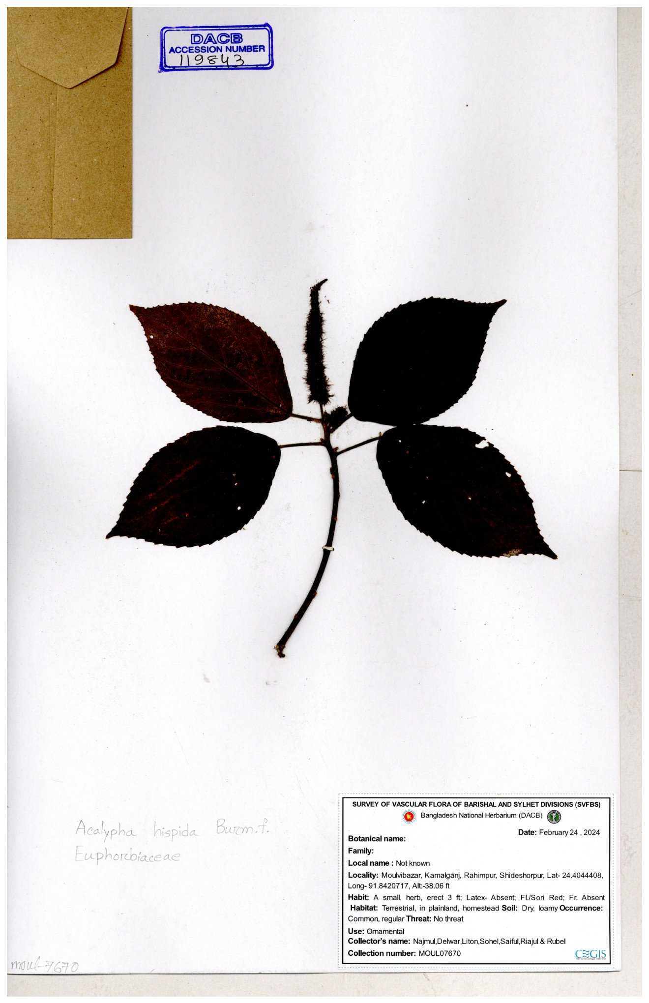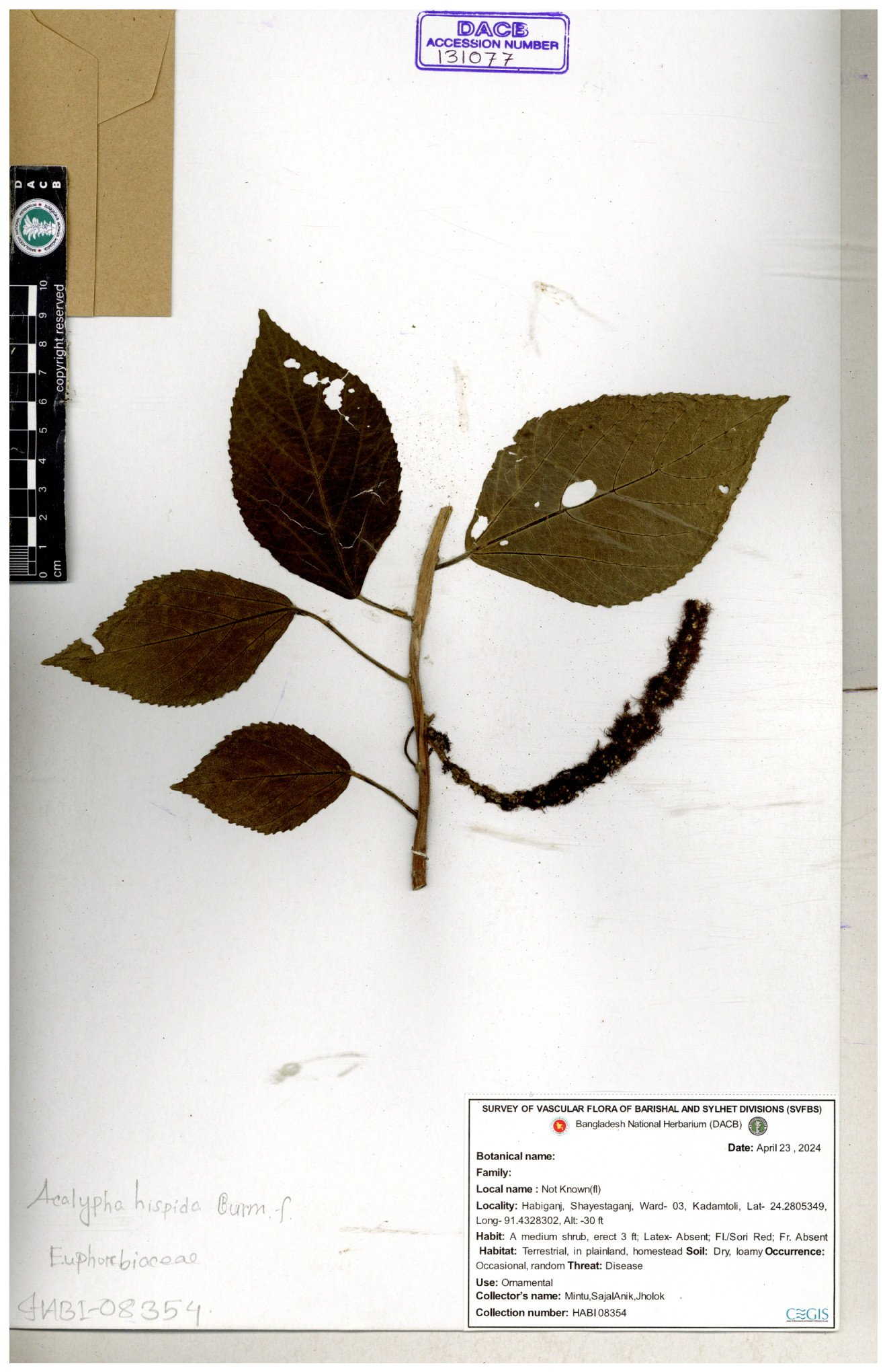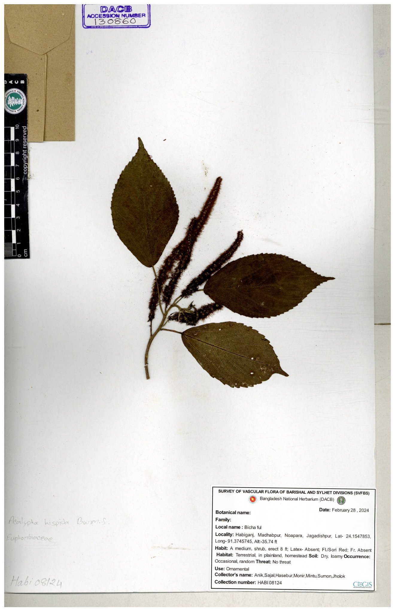 | 42088 | Euphorbiaceae | Acalypha hispida Burm.f. | Mia, Huq & Zashim | M-3603 30-11--0001 |