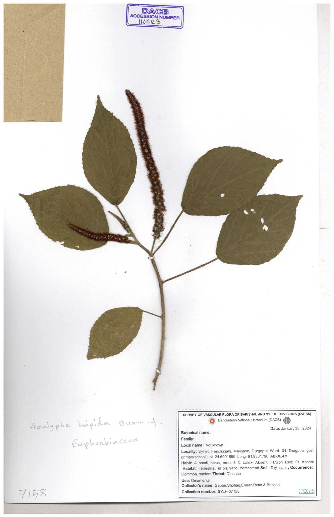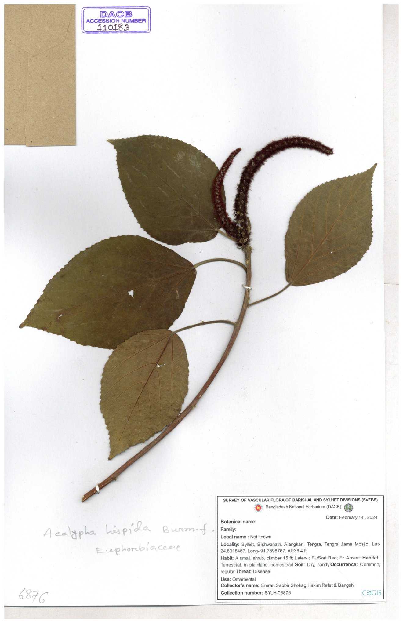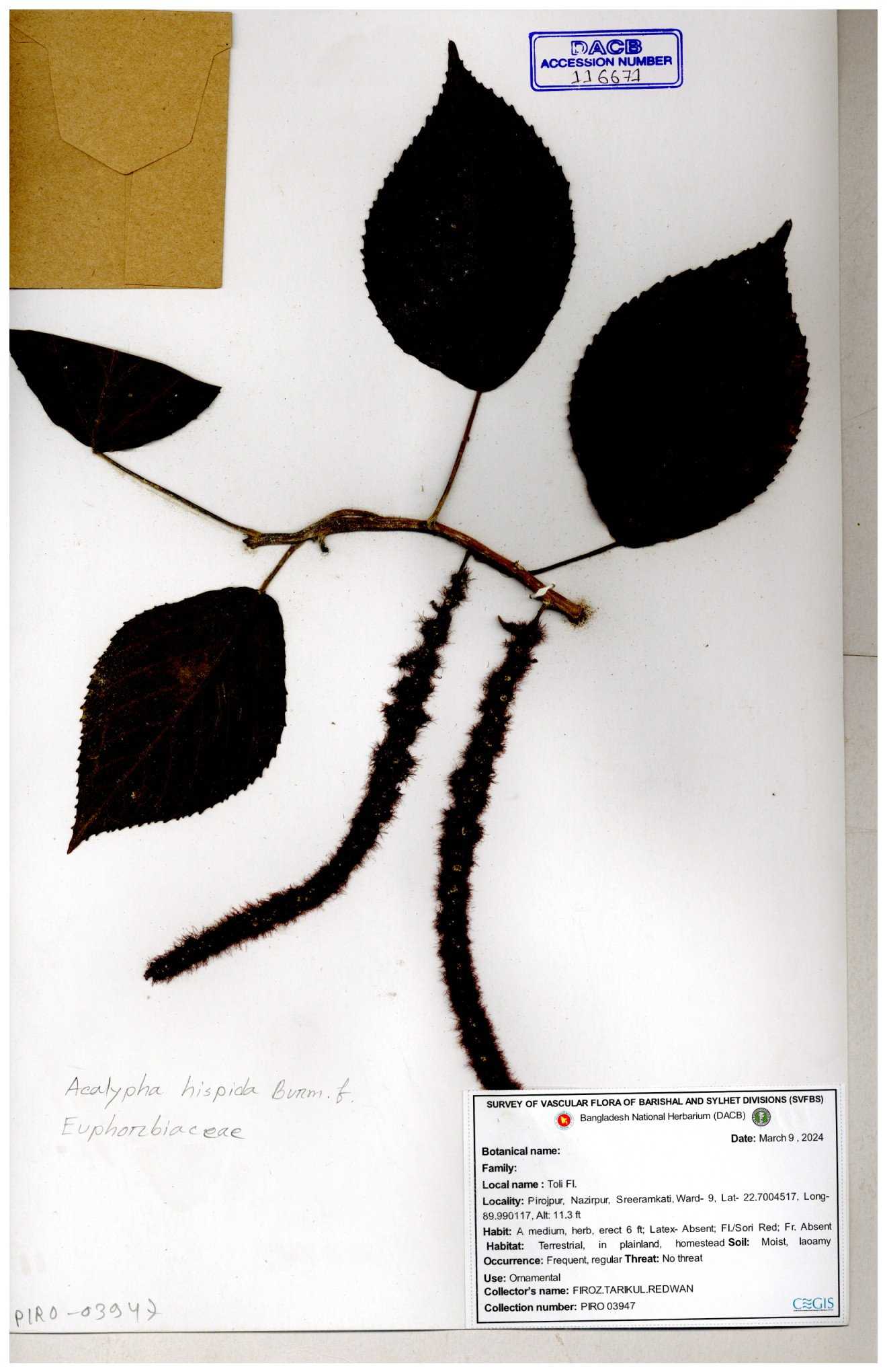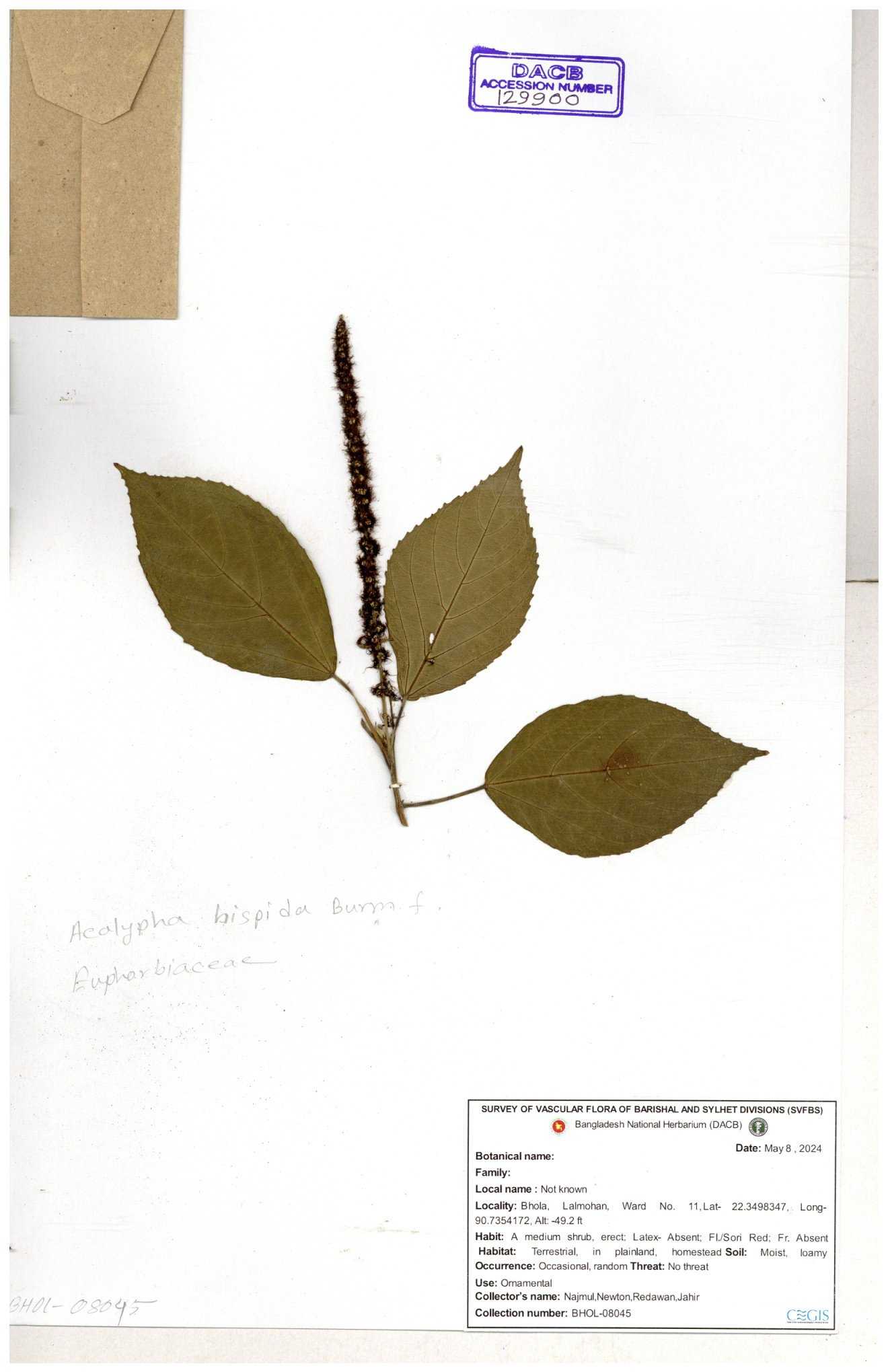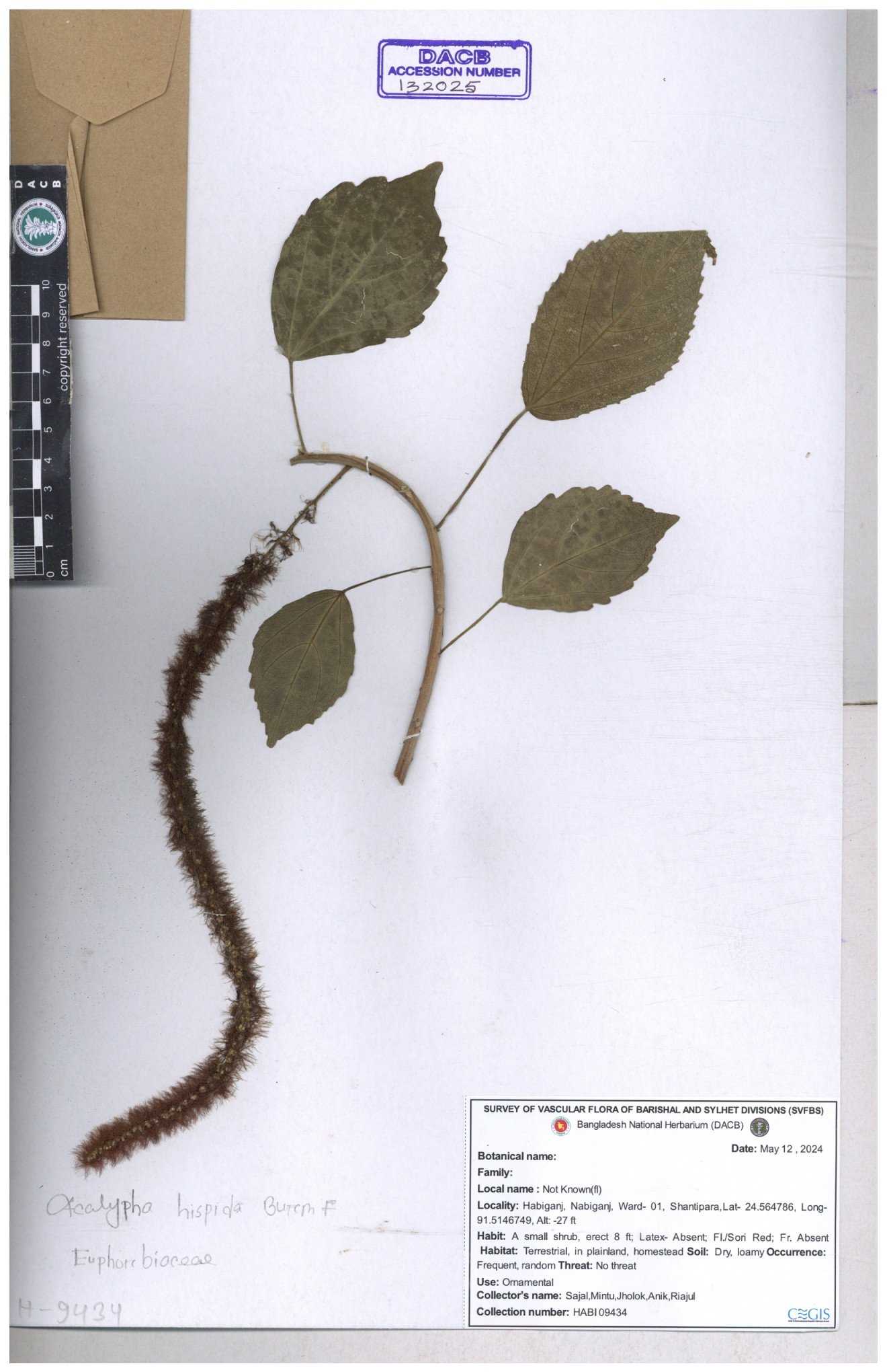 | 42088 | Euphorbiaceae | Acalypha hispida Burm.f. | Mia, Huq & Zashim | M-3603 30-11--0001 |