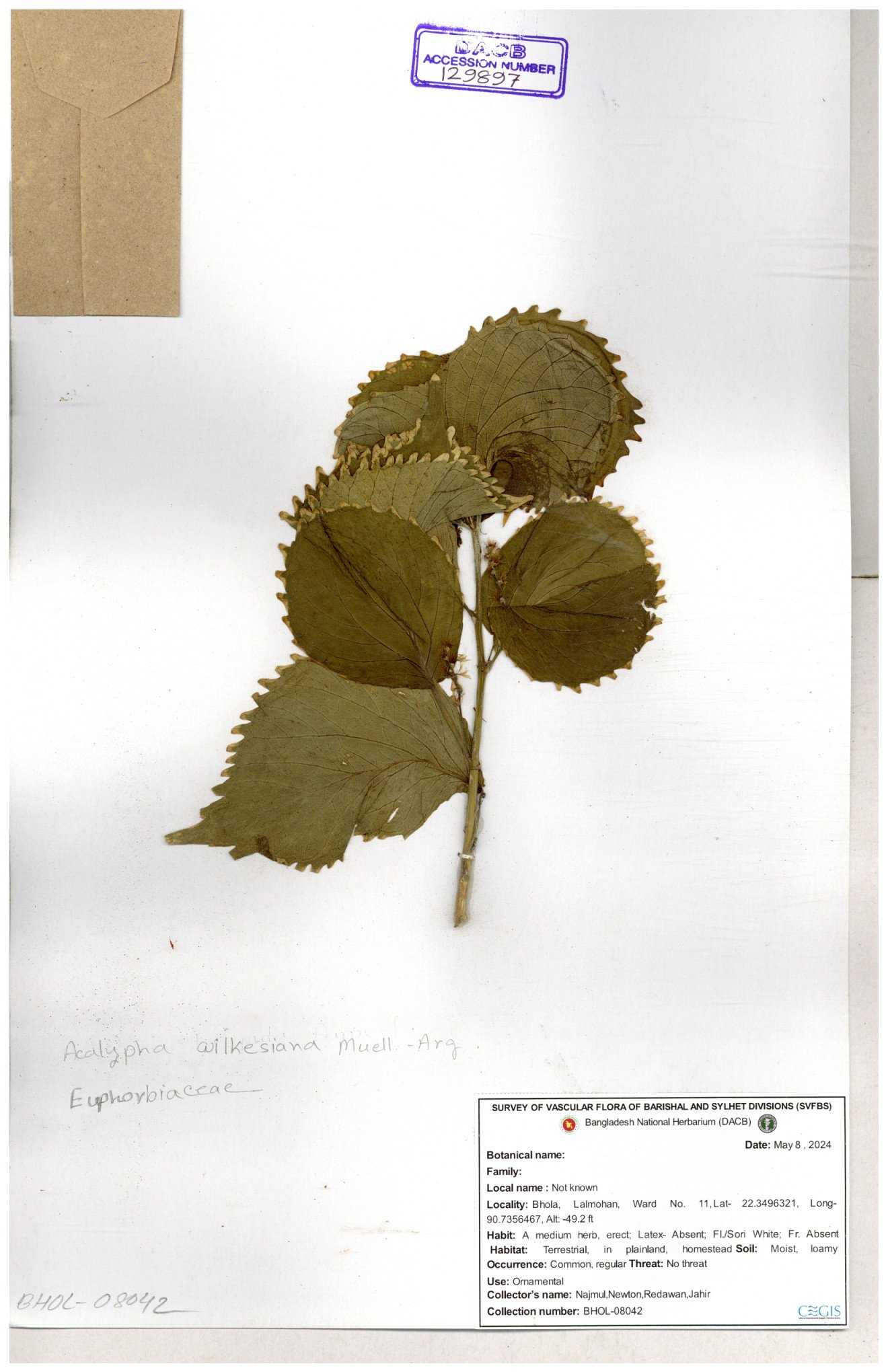 | 30024 | Euphorbiaceae | Acalypha i L. | Muktajhuri | B.M. Rezia Khatun, Momtaz, Bushra & Harun, | RK-3803 09-03-2002 |