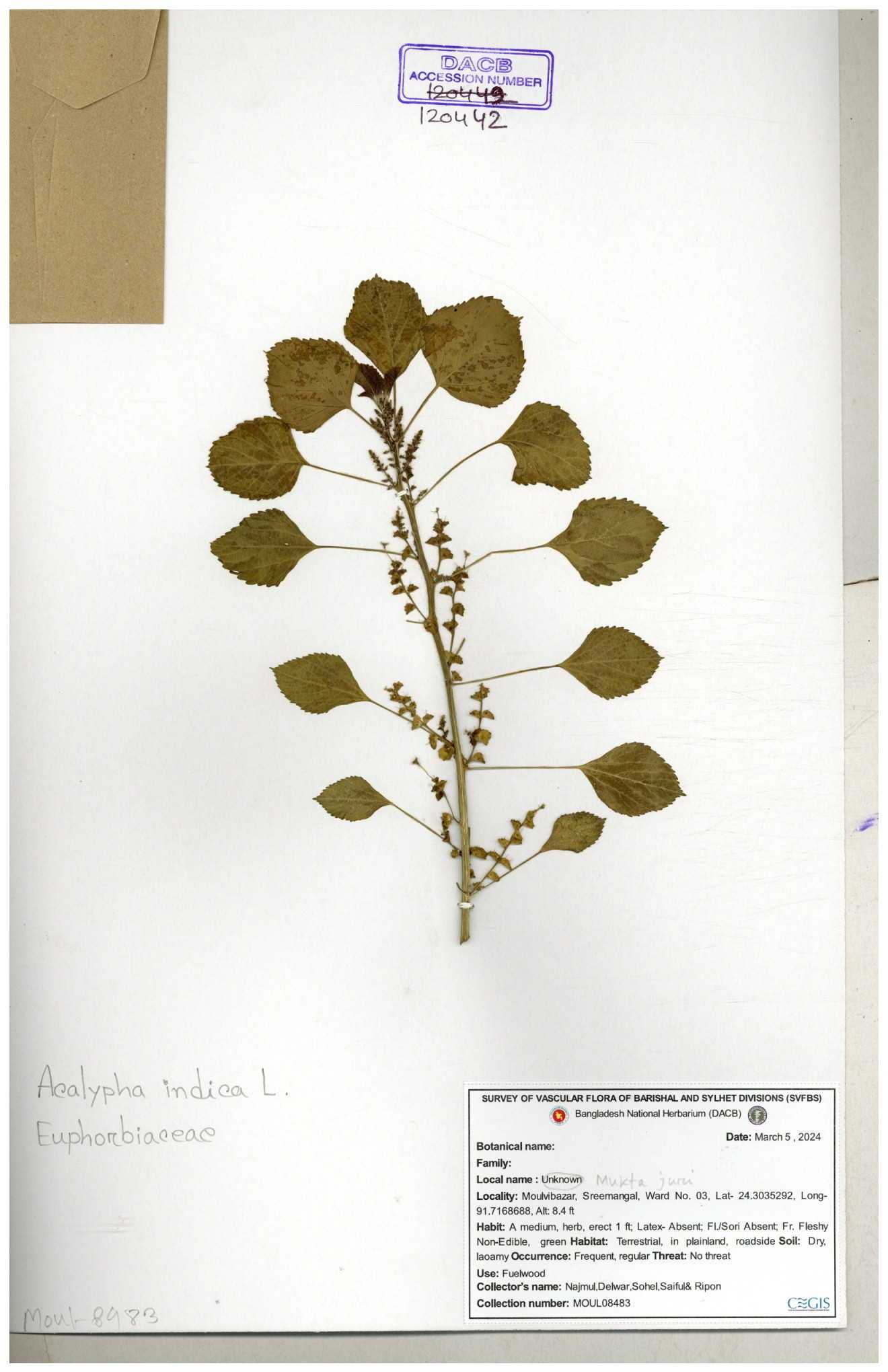 | 68280 | Euphorbiaceae | Acalypha indica L. | Muktajhuri | I Hossen, MS Islam, MKR Rahman & MR Miah | IH-1520 11-08-2016 |