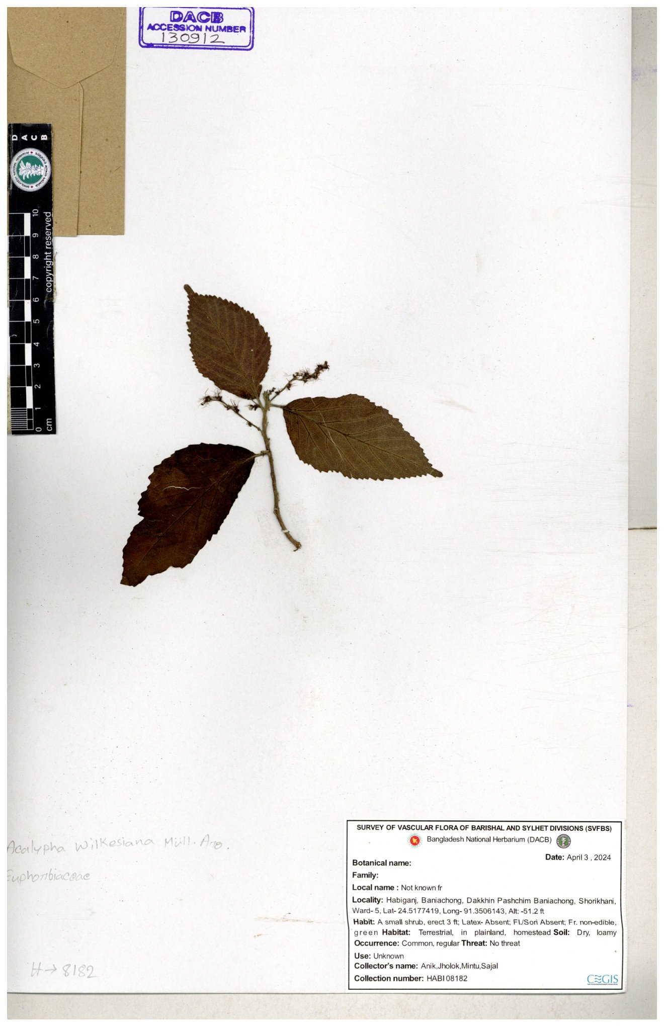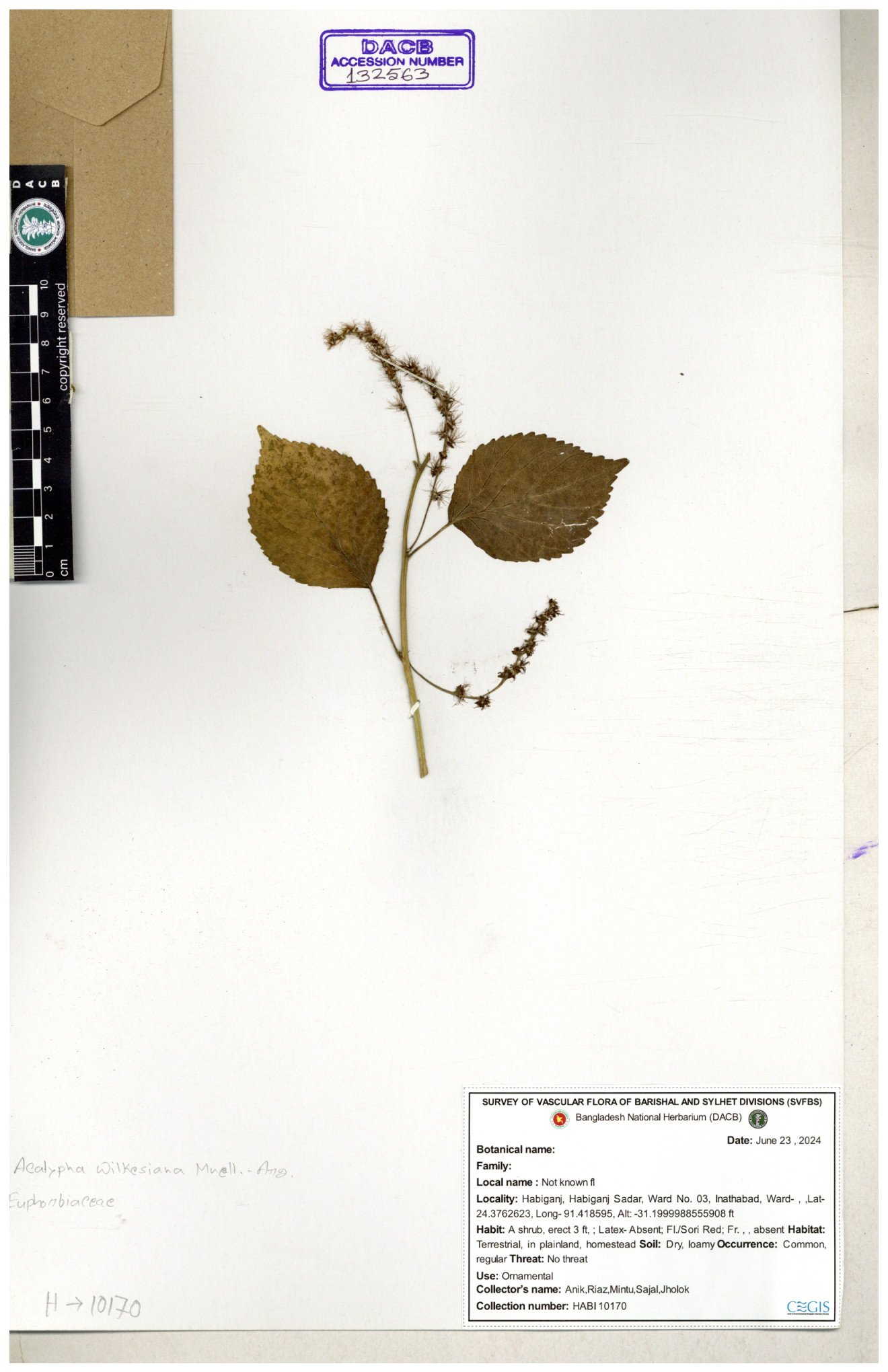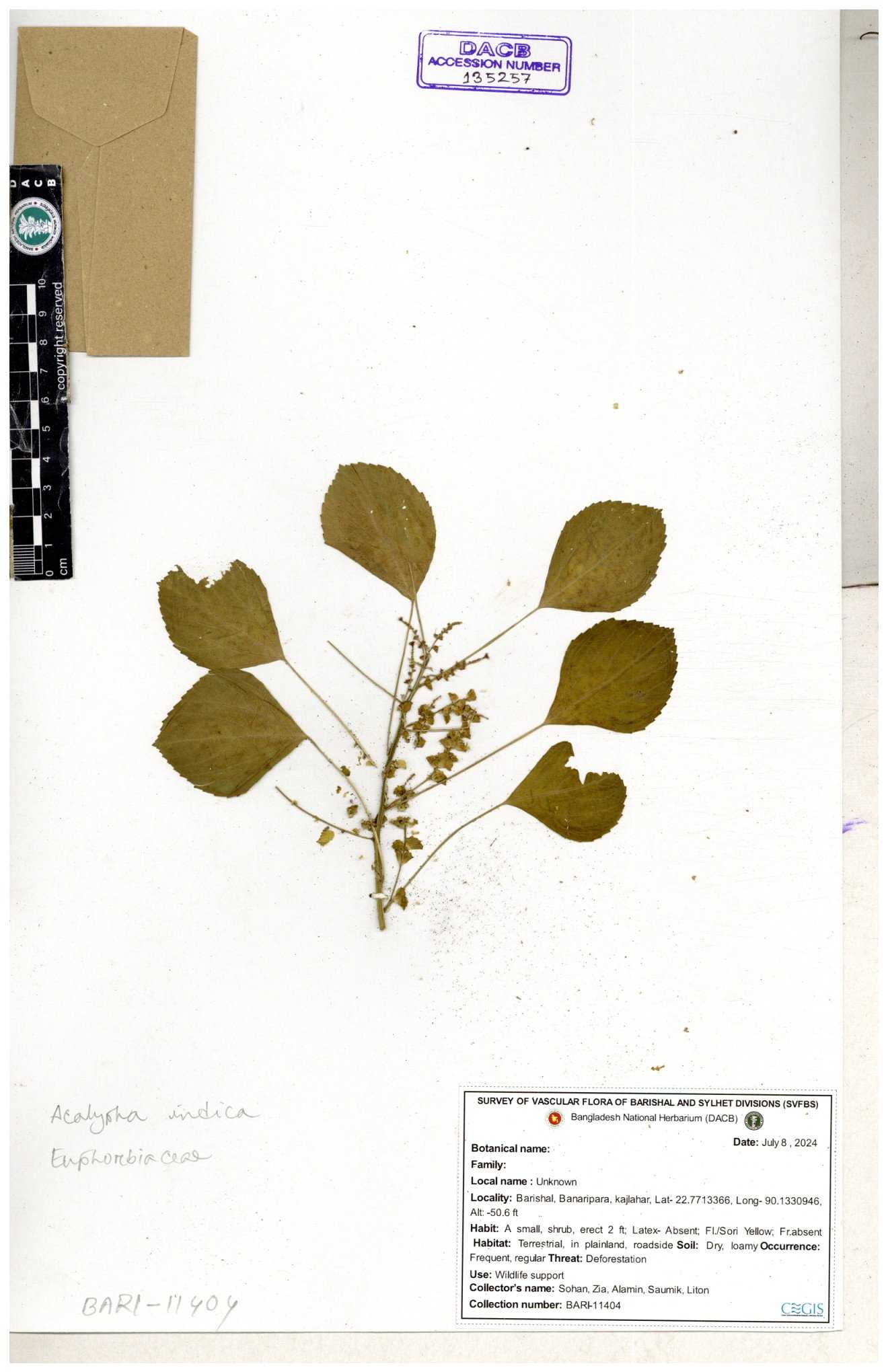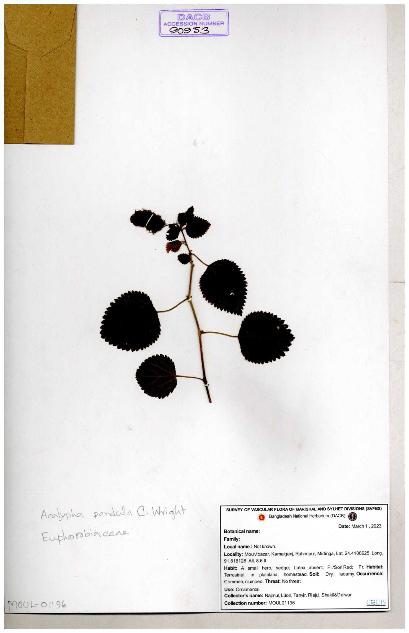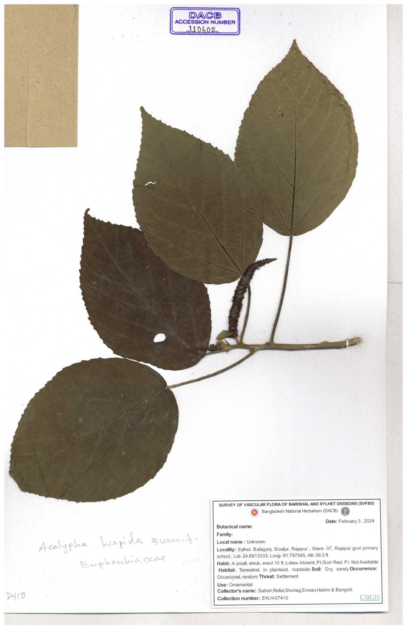 | 11017 | Euphorbiaceae | Acalypha indica L. | Mia, Rahman, Halim & Rezia | M. 2390 30-11--0001 |