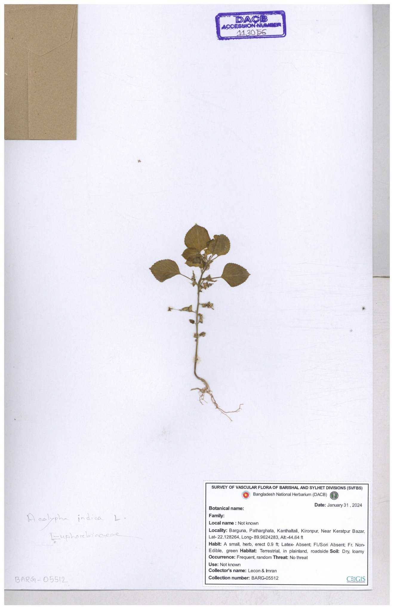 | 69274 | Euphorbiaceae | Acalypha indica L. | Muktajhuri | I Hossen, MS Islam, MKR Rahman & MR Miah | IH-094 30-11--0001 |